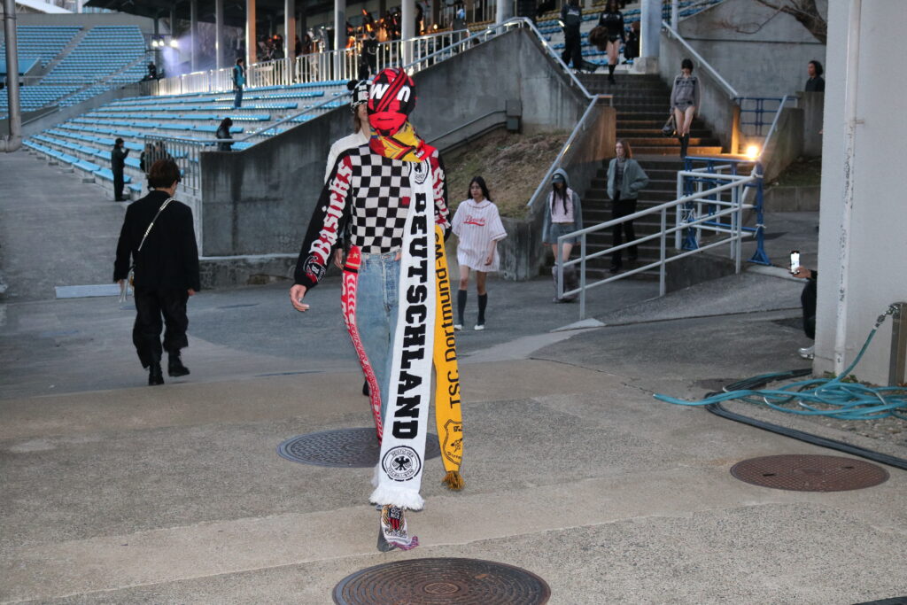 M:元々、BASICKSをスポーツ系の会場でやりたいなと思っていましたがHUMMEL 00の会場には悩んでいました。実は、自分の中で二つの異なるブランドのショーを一つのストーリーに繋げようと考えていました。HUMMEL 00は、心臓の音から始まり、新生HUMMELが始まるというイントロダクションのようなショーにしていて、BASICKSがサビではないですけど枠を取っ払ったものを作り、心臓の音で終わらせるという繋がったショーにしました。元々BASICKSでの候補にもあった代々木体育館をHUMMEL 00のショー会場にしたことで、同じスポーツの会場で繋げるという事で秩父宮ラグビー場になりました。