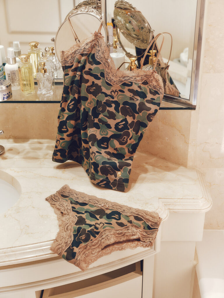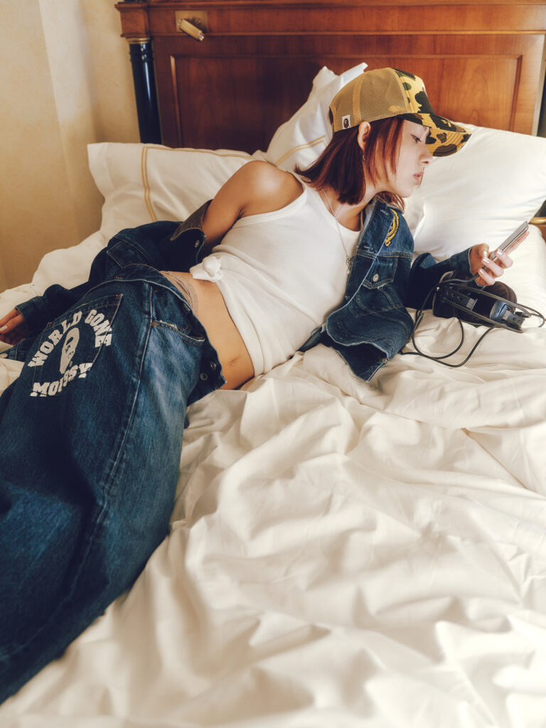 日本を代表する原宿発のストリートアイコン「A BATHING APE®(アベイシングエイプ)」とのコラボレーションが実現。デニムカルチャーとストリートカルチャーが交差する、特別なコレクションが完成した。今回のコラボレーションでは、「A BATHING APE®」のシグネチャーである「BAPE® CAMO」や「APE HEAD」をベースに、オリジナルのカレッジロゴやエンブレムをデザイン。ラガーシャツなどクラシカルでトラッドなムードを中心に、アンダーウェア 、フローラルパターン、ラインストーンといったフェミニンな要素を取り入れた、多彩な商品ラインナップを展開。