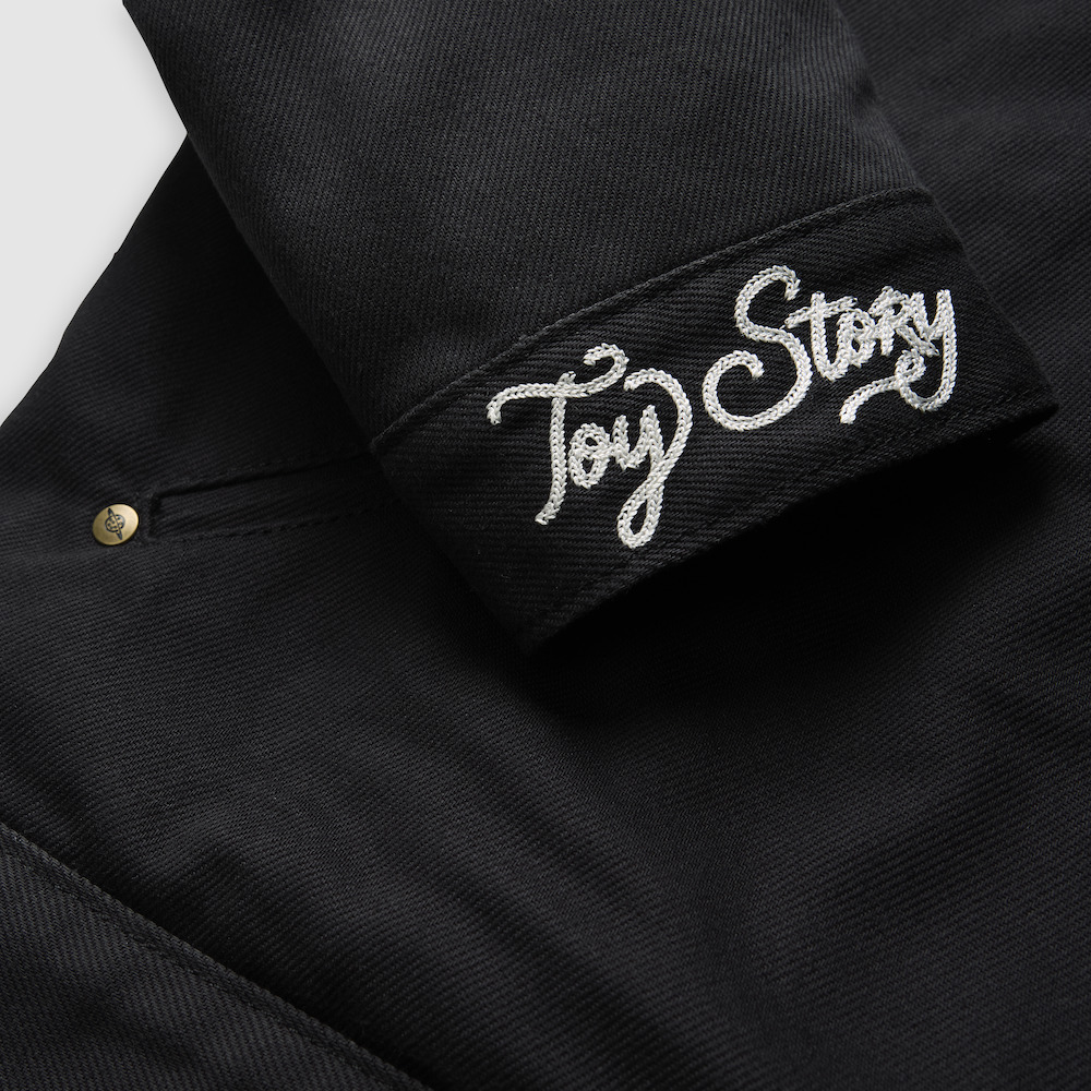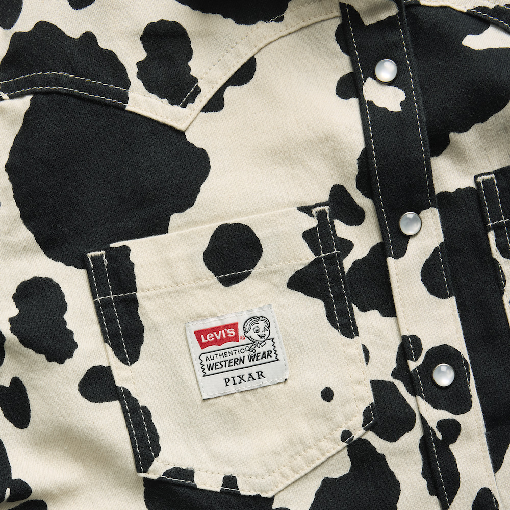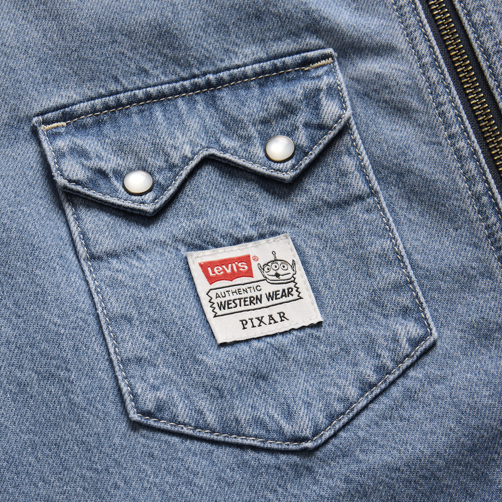 メンズのコレクションでは、後染め加工を施したブルデニムを使い、クロップドシルエットで仕上げたLevi’s® x Toy Story Western Jacket が目を奪う。このジャケット専用のスタッズには、作品をもとにした 5 つのモチーフが入っています。Woody のベルトのバックル、Space Ranger(スペースレンジャー)のロゴ、Pizza Planet (ピザ・プラネット)のエンブレム、Woody のブーツのロゴとサボテンの柄。裏地はキルティングで Woody の限定パッチもついている。Levi’s® x Toy Story Rodeo Shirtは全面にカウプリントを施したエクリュデニムを使用。ブラックのパイピングがコントラストを生んでいる。胸元には「Hey Howdy Hey」の文字の刺しゅうがくっきりと入り、その下にはブラックの生地でコントラストをつけた縁取りを持つ2つのスマイルポケットがある。ボタンはウェスタンシャツの伝統を受け継ぐパールのスナップボタン。