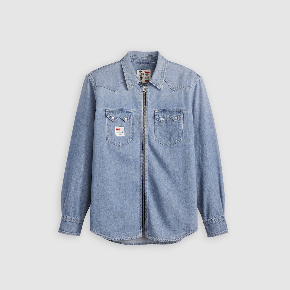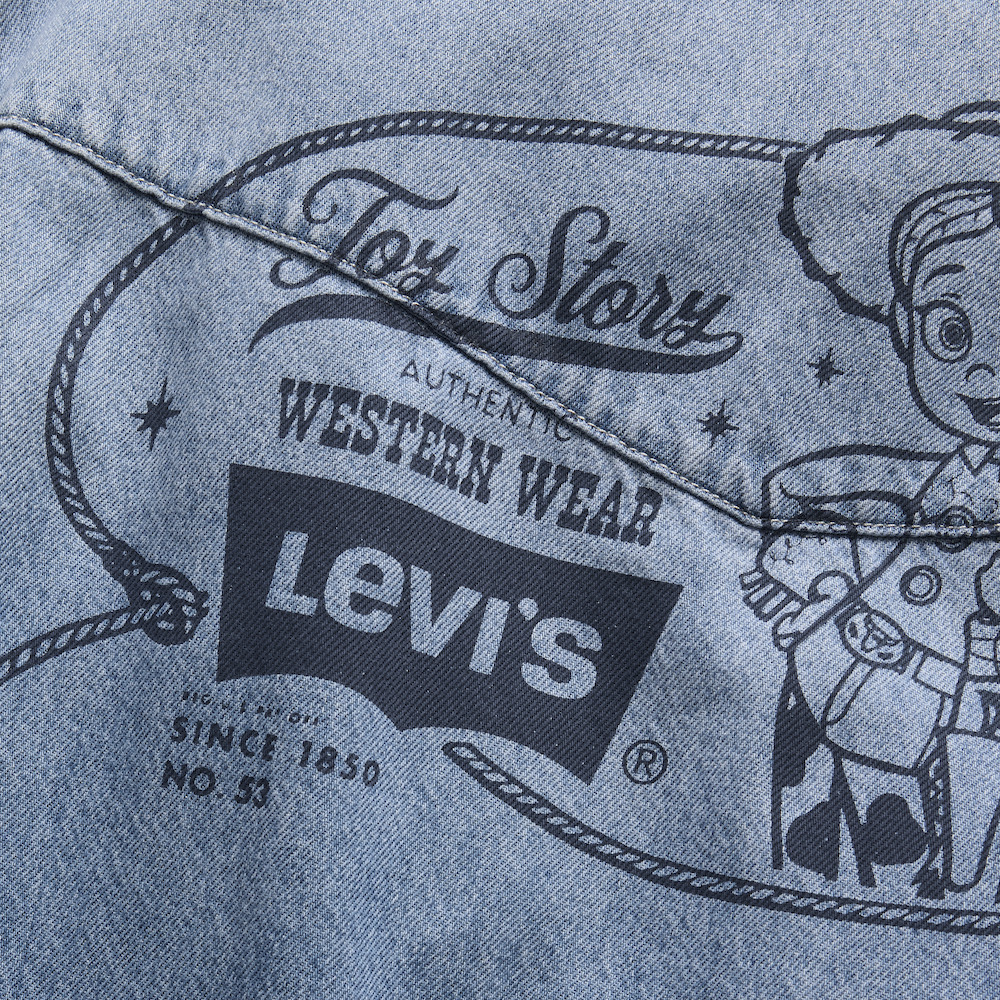 Levi’s® x Toy Story All Over Print Vest はキルティングとジッパーを組み合わせた構造。ブラックの裏地がコントラストを生んでいる。背中には、Bullseye(ブルズアイ)に乗る Jessie(ジェシー)とWoody を描いた Disney と Pixar のグラフィックを大きく入れ、生地全体をフラワーサックプリントのテイストで仕上げた。2 つのカンガルーポケットもついている。 Levi’s® x Toy Story Type IIITrucker はプリントのポケット生地を使ったパッチ&リペアのディテールを持ち、背中には Levi’s®のSaddleman(サドルマン)をモチーフにした Woody の大きなグラフィック、そして「You’ve Got a Friend in Me」と描かれた刺しゅうが入っている。Levi’s® x Toy Story Western Shacket はフロントがフルジッパーのデザイン。ウェスタンシャツをストリートウェアの感覚で再解釈したアイテム。生地はミッドウェイトのインディゴデニム。パールのスナップボタンを持つソートゥース型のポケットフラップが印象的。