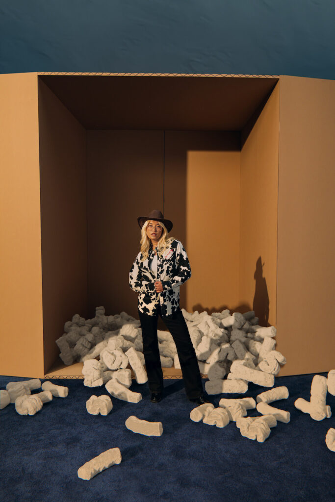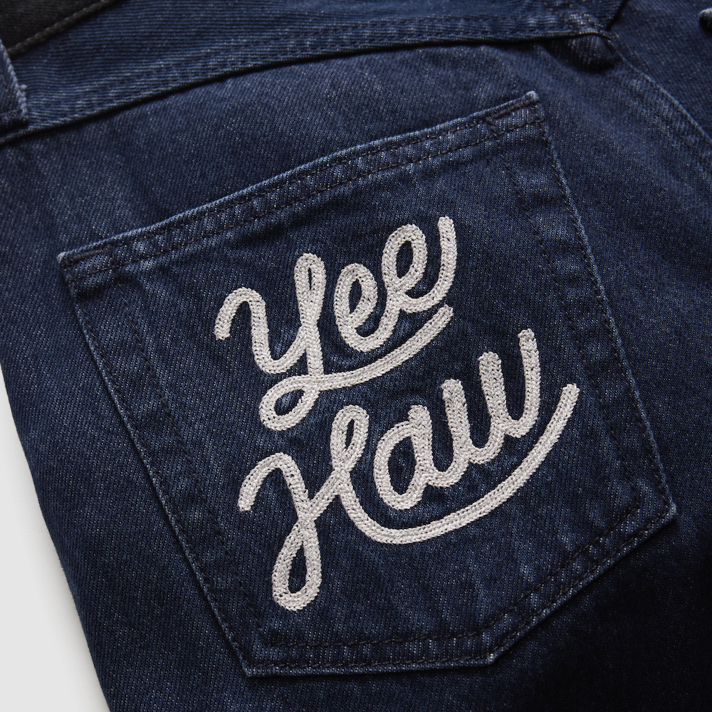 メンズのボトムスは、専用のスタッズを持ち、ダブルニーのカーペンタースタイルで仕上げたWestern Flare、コレクションの別のアイテムの生地をパッチにした Loose Jean、フラワーサックプリントで仕上げたCarpenter Jeanがそろっている。すべてのボトムスには、Andy の手書き風のデザインとSaddleman のグラフィックが入ったカスタムのポケットバッグをつけた。どのジーンズも、ストレスポイントの補強やコントラストステッチなど、西部開拓時代に使われたワークウェアの仕立て方を映し出した、本格的なウェスタンスタイルの構造や細部を持っている。Andy の手書き風のデザインが入ったポケットバッグは映画の物語へのオマージュだ。そして Saddleman のグラフィックの遊び心はコレクターを魅了するだろう。