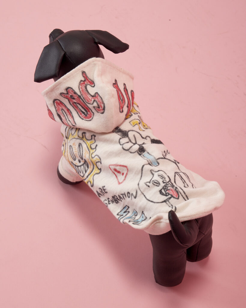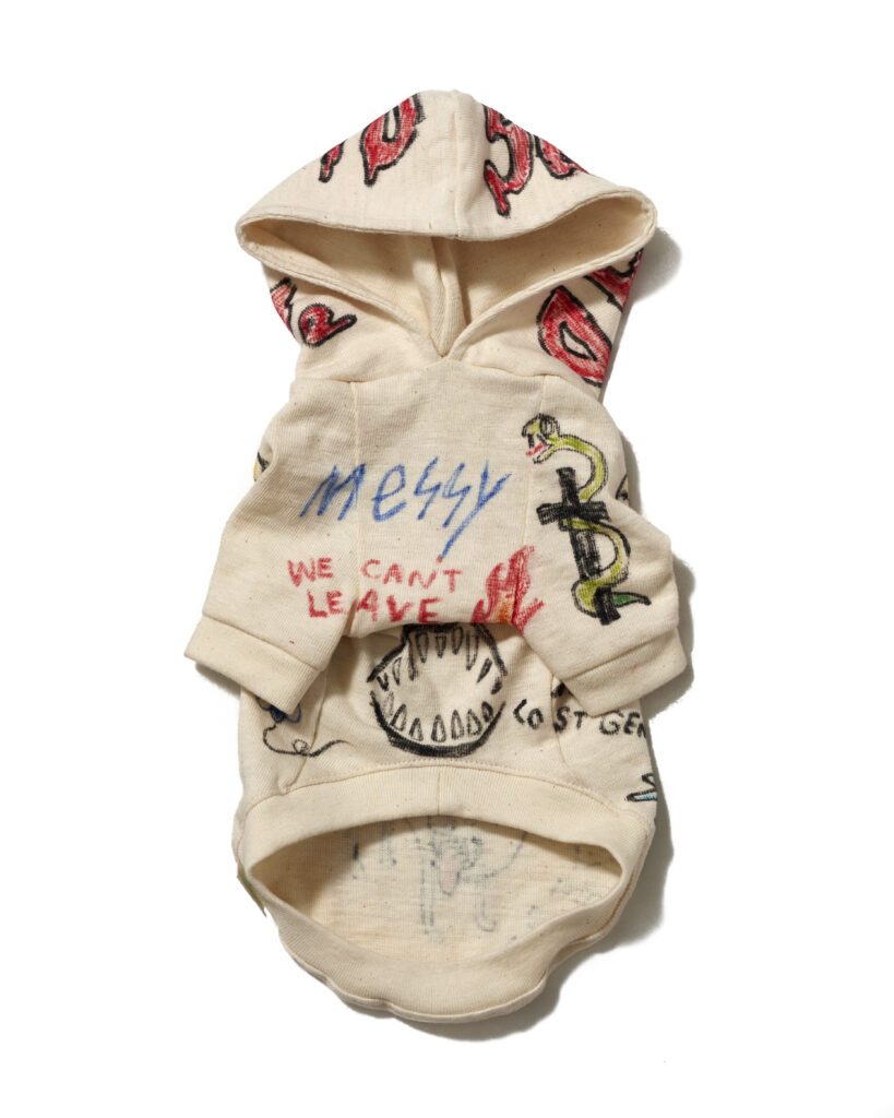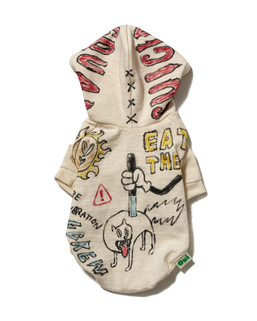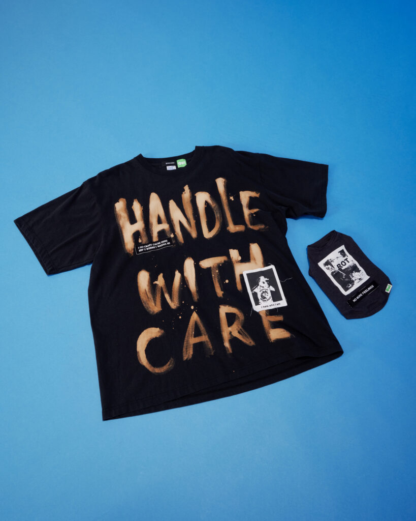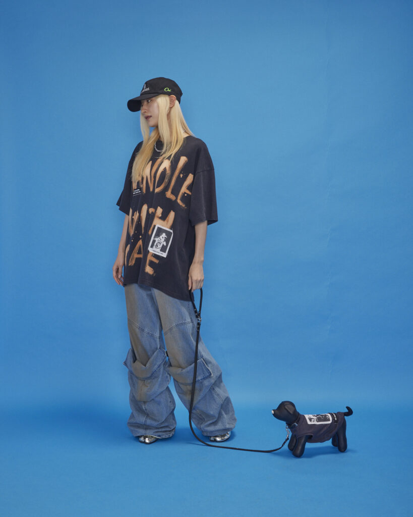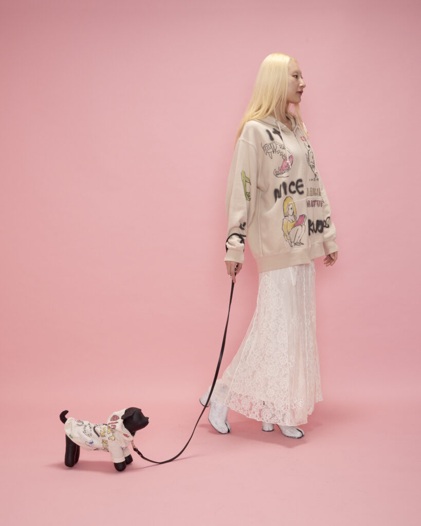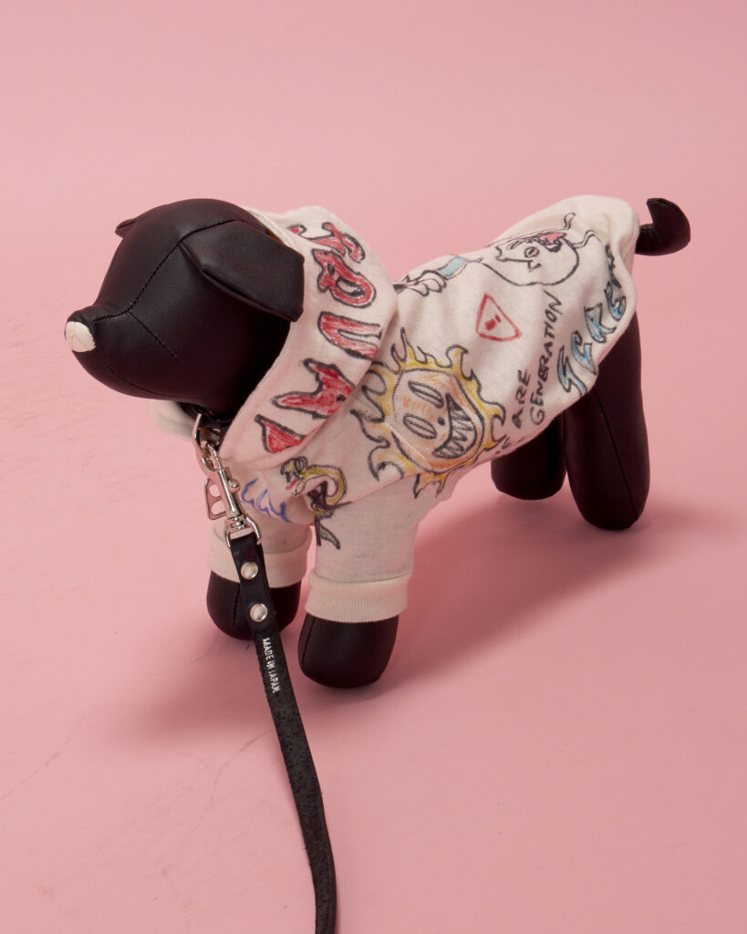 ラブリーなワンちゃんのイメージと真逆のパンクなグラフィティーアートを混ぜて制作された、遊び心のある逸品。普段とは違う特別な時間を愛犬と過ごしてもらえれるコレクションに仕上がっている。さらに今回は、加工にもこだわり製品染したTシャツとZIPパーカーを、数量限定で展開。