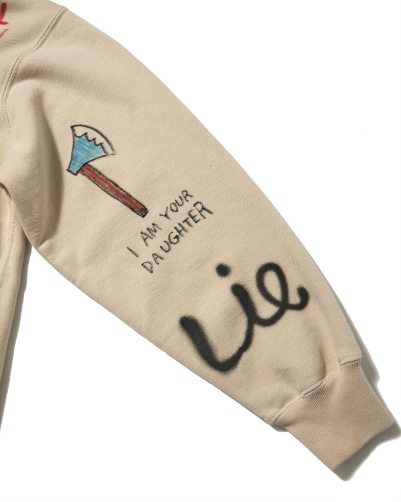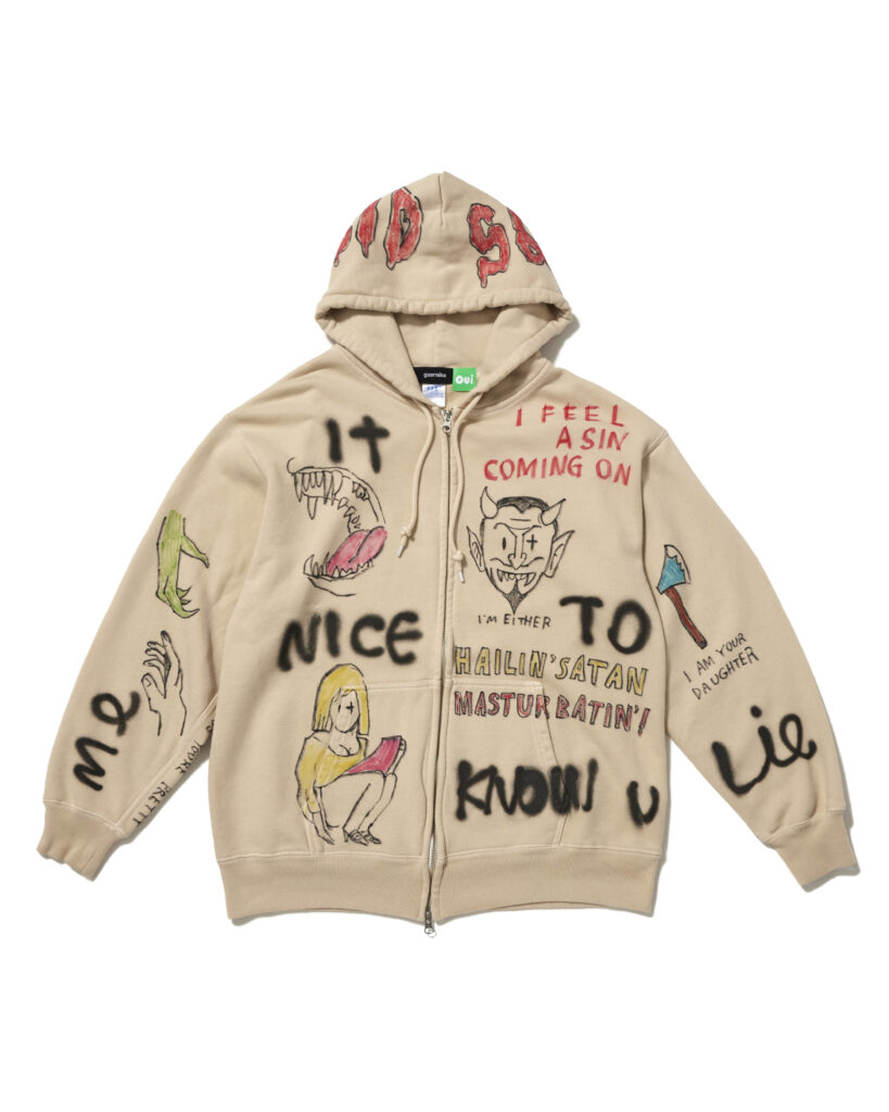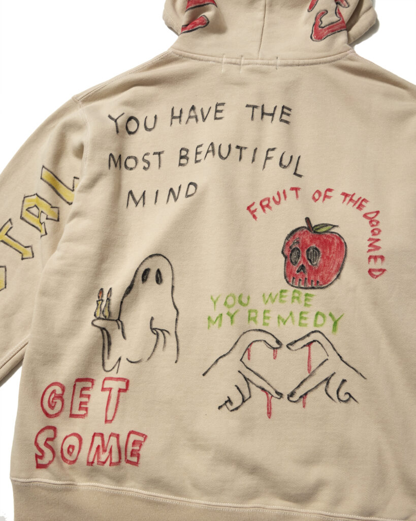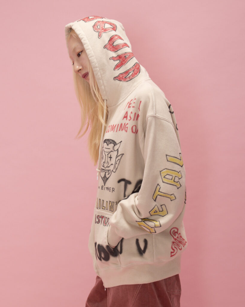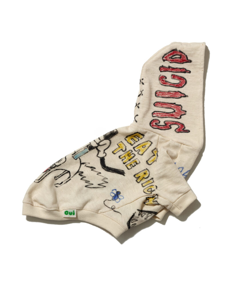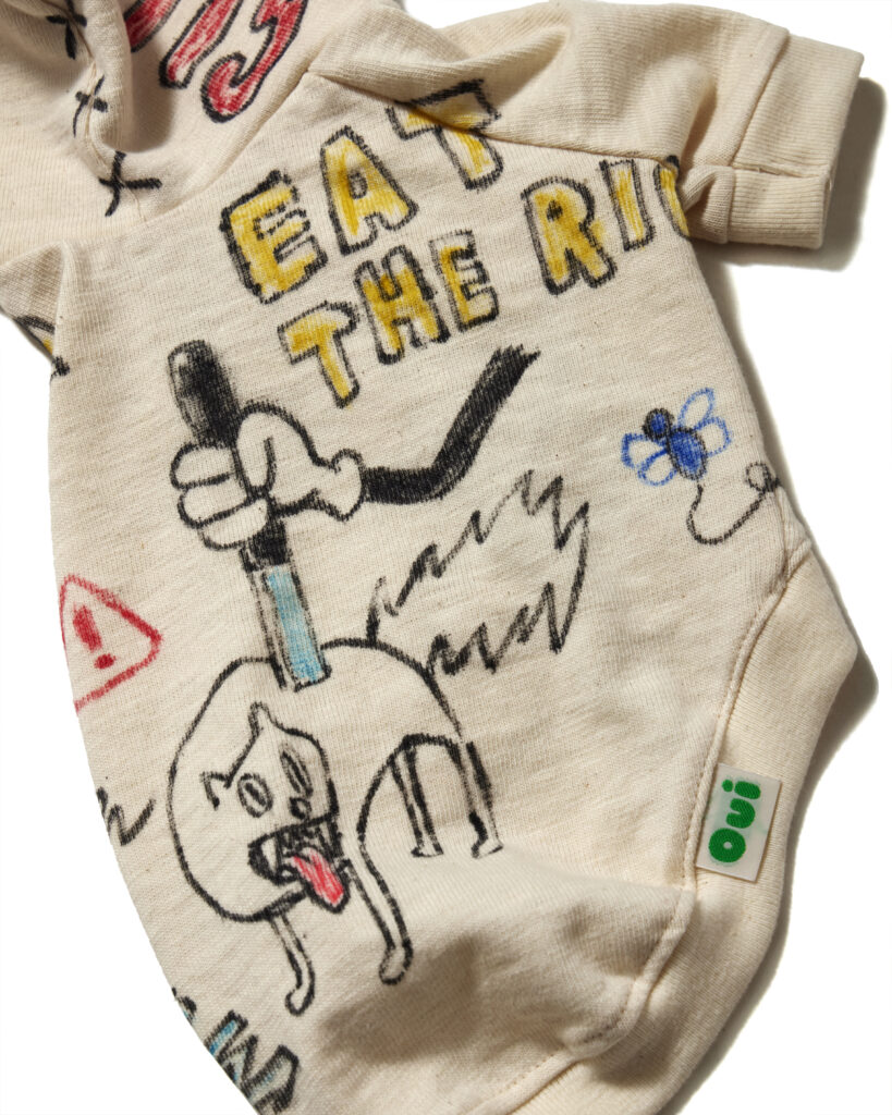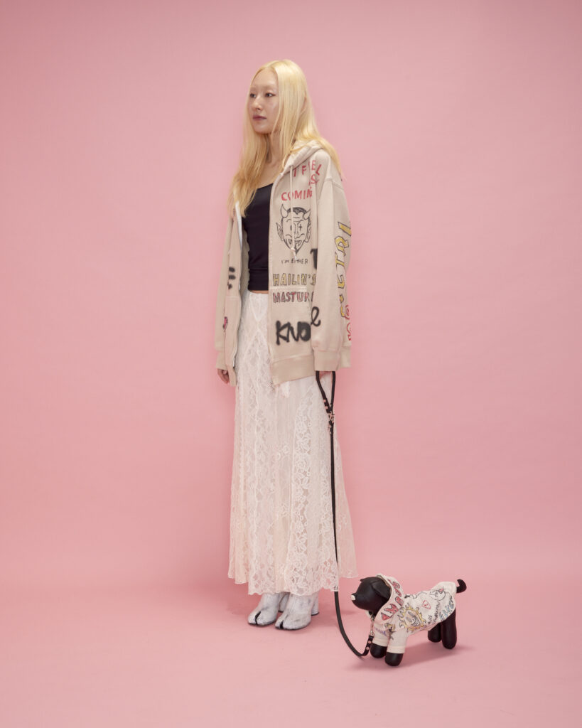 ラブリーなワンちゃんのイメージと真逆のパンクなグラフィティーアートを混ぜて制作された、遊び心のある逸品。普段とは違う特別な時間を愛犬と過ごしてもらえれるコレクションに仕上がっている。さらに今回は、加工にもこだわり製品染したTシャツとZIPパーカーを、数量限定で展開。