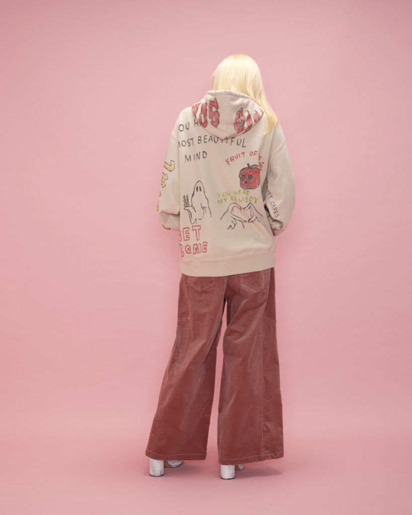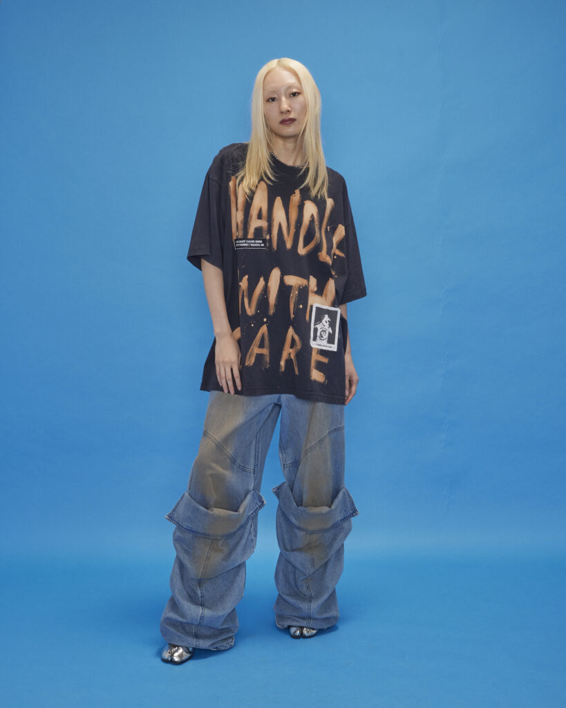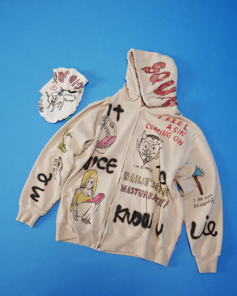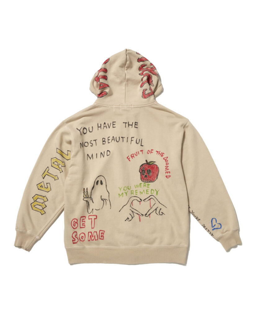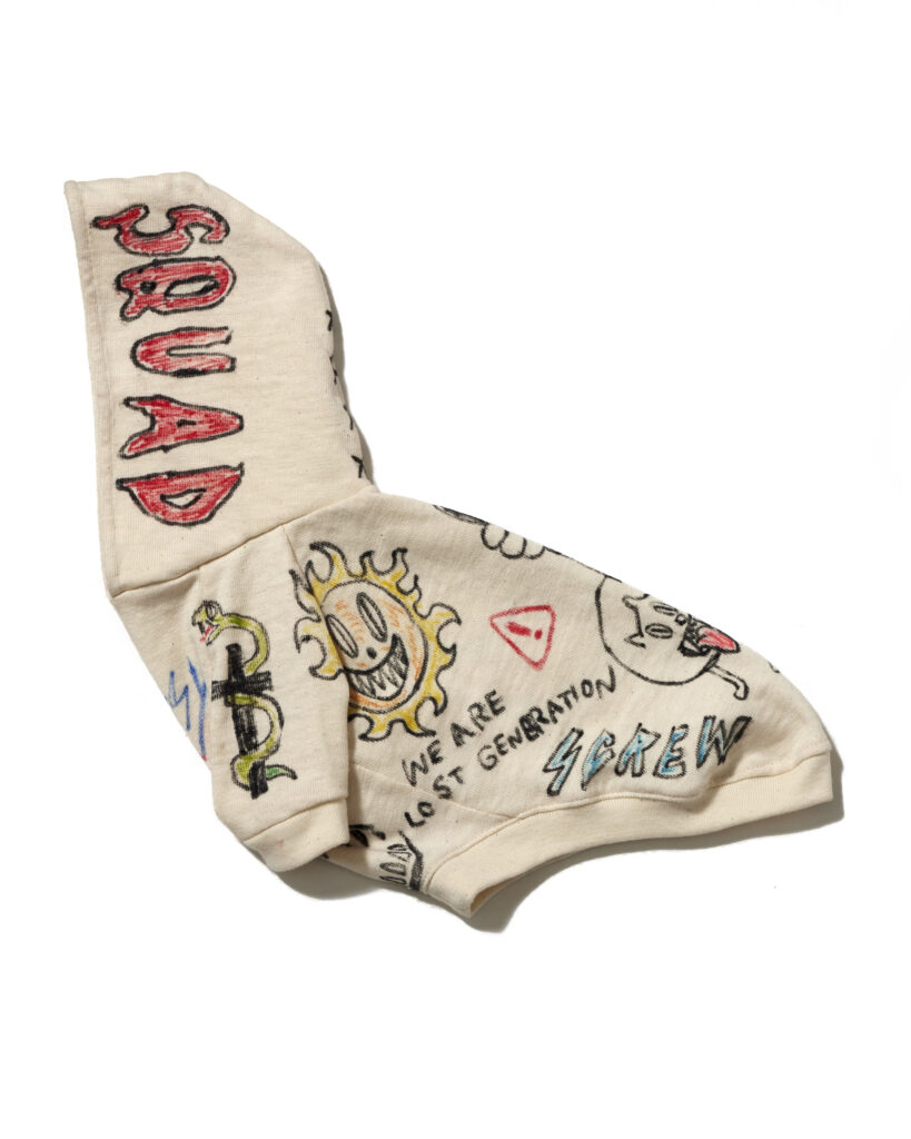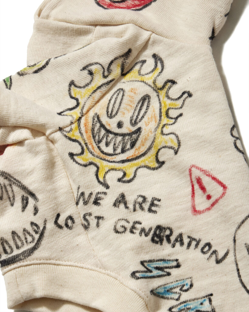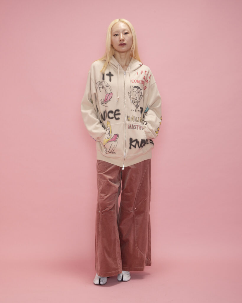 ラブリーなワンちゃんのイメージと真逆のパンクなグラフィティーアートを混ぜて制作された、遊び心のある逸品。普段とは違う特別な時間を愛犬と過ごしてもらえれるコレクションに仕上がっている。さらに今回は、加工にもこだわり製品染したTシャツとZIPパーカーを、数量限定で展開。