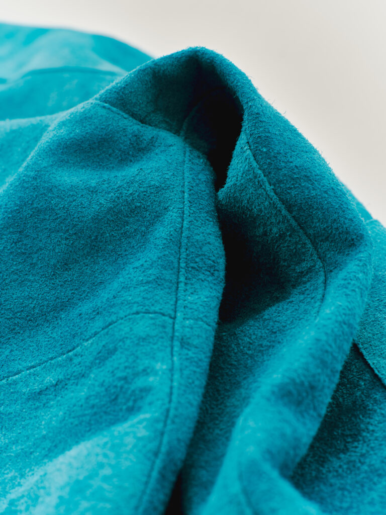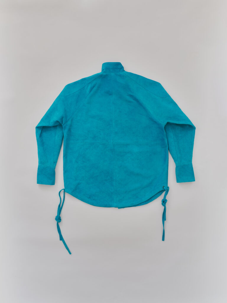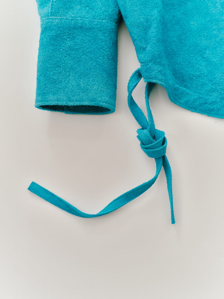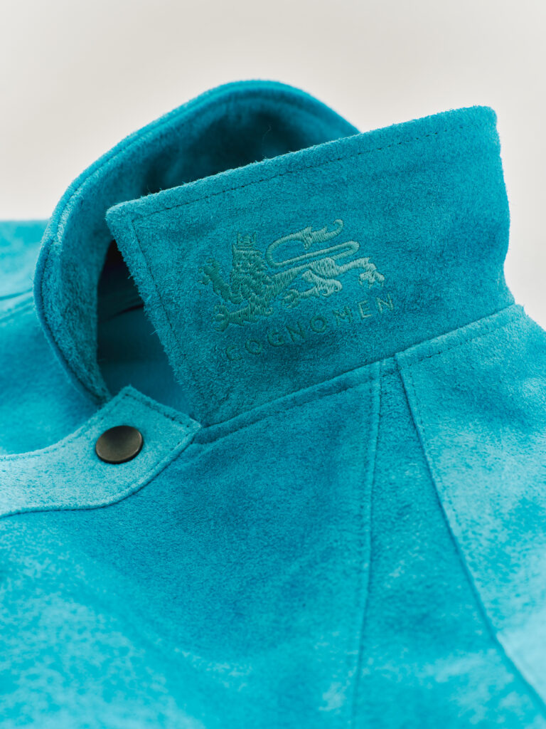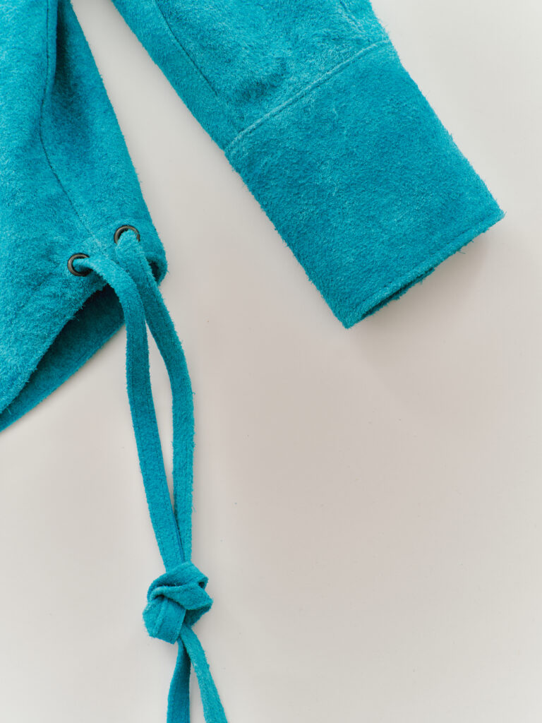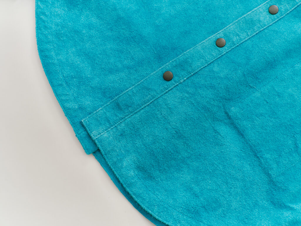 24SSから作り始めたゴールキーパーに着想を得たパターンを、 今回はターコイズ色のスエードで作りました。