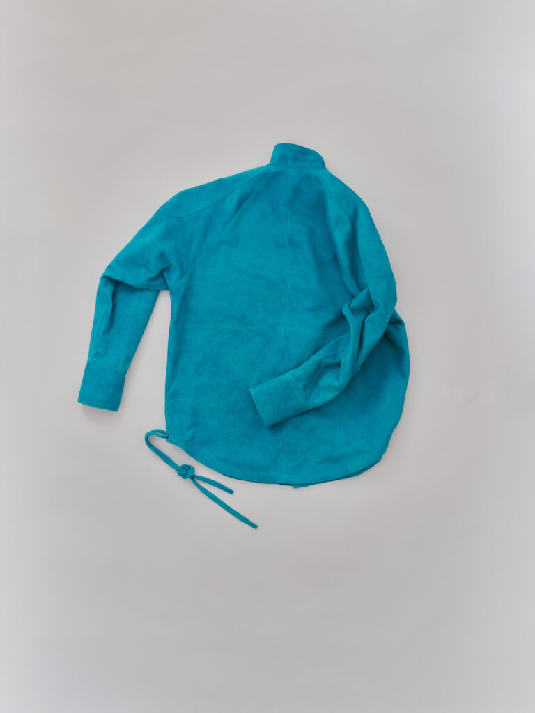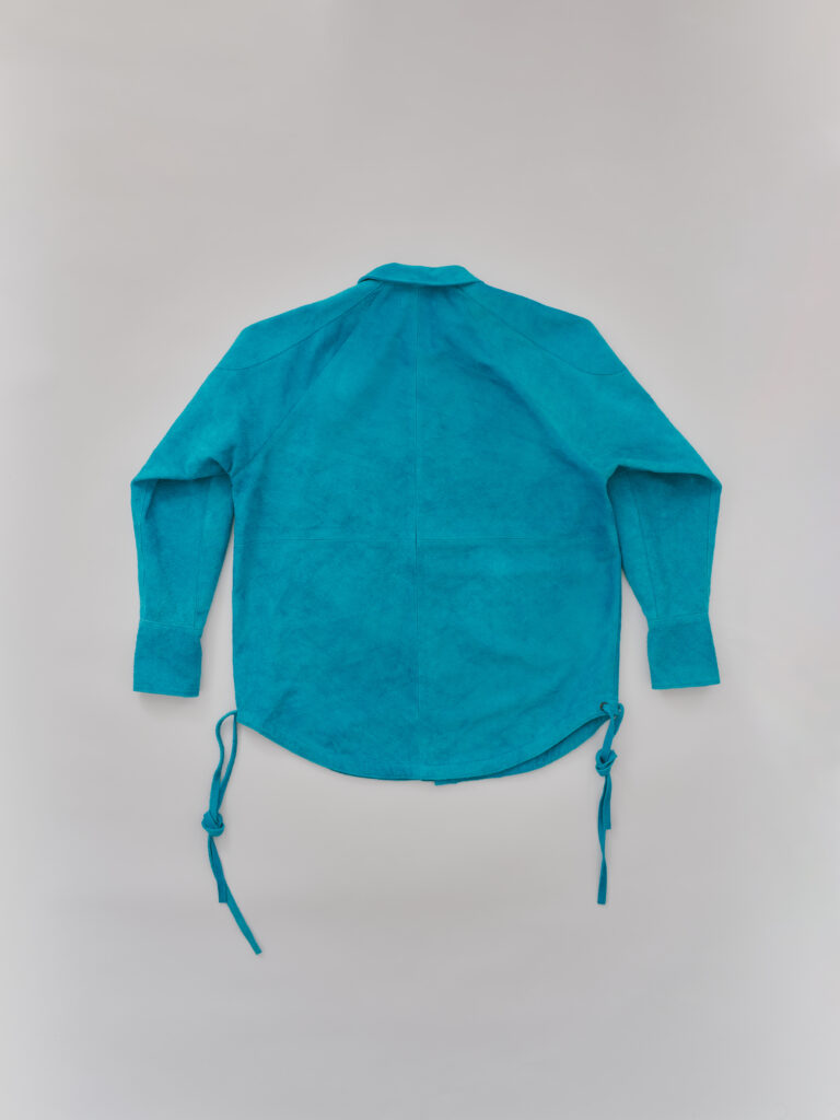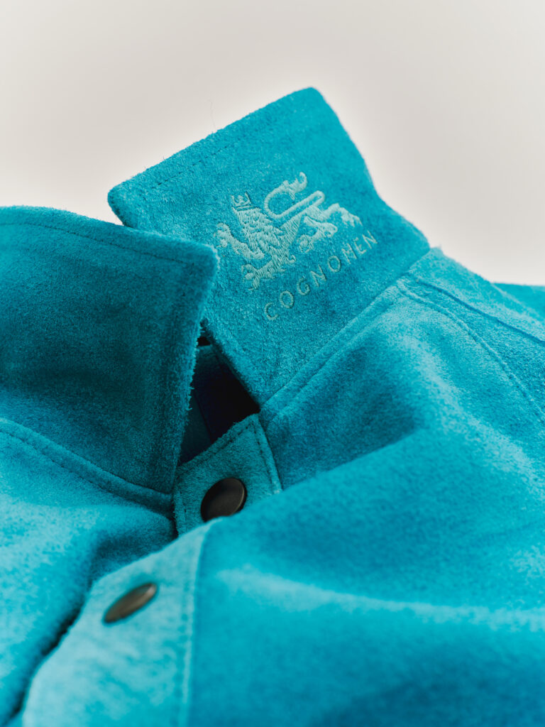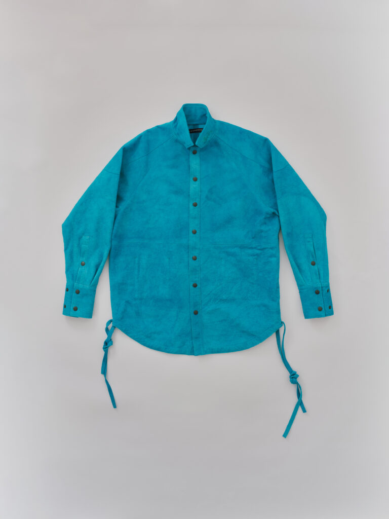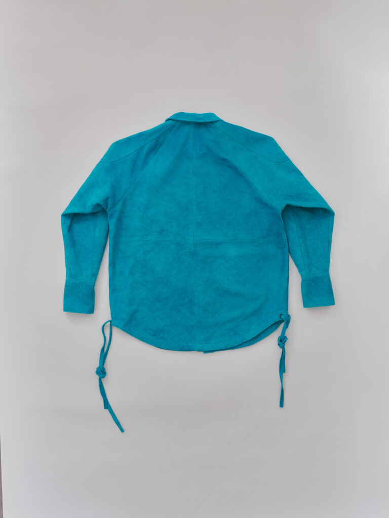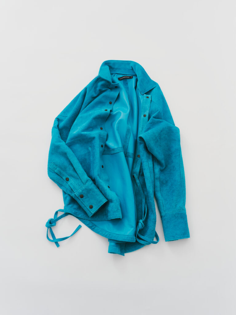 24SSから作り始めたゴールキーパーに着想を得たパターンを、 今回はターコイズ色のスエードで作りました。