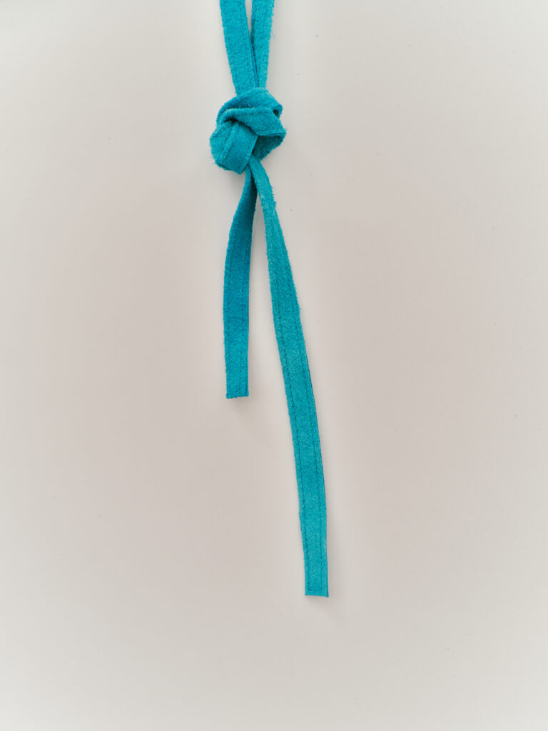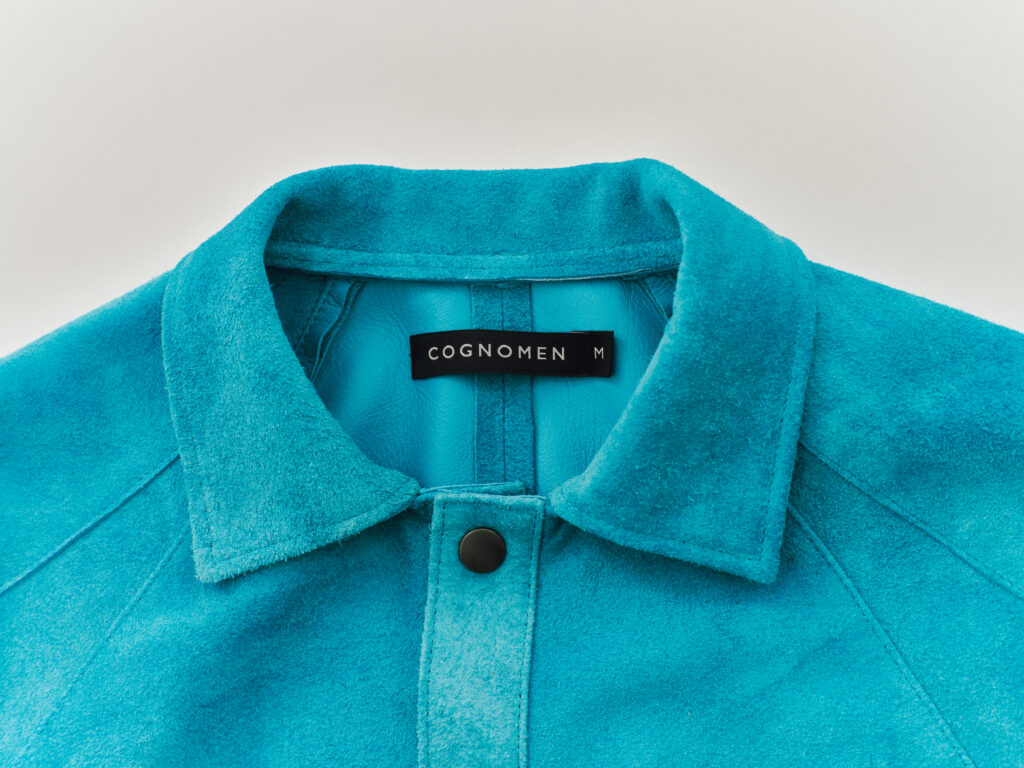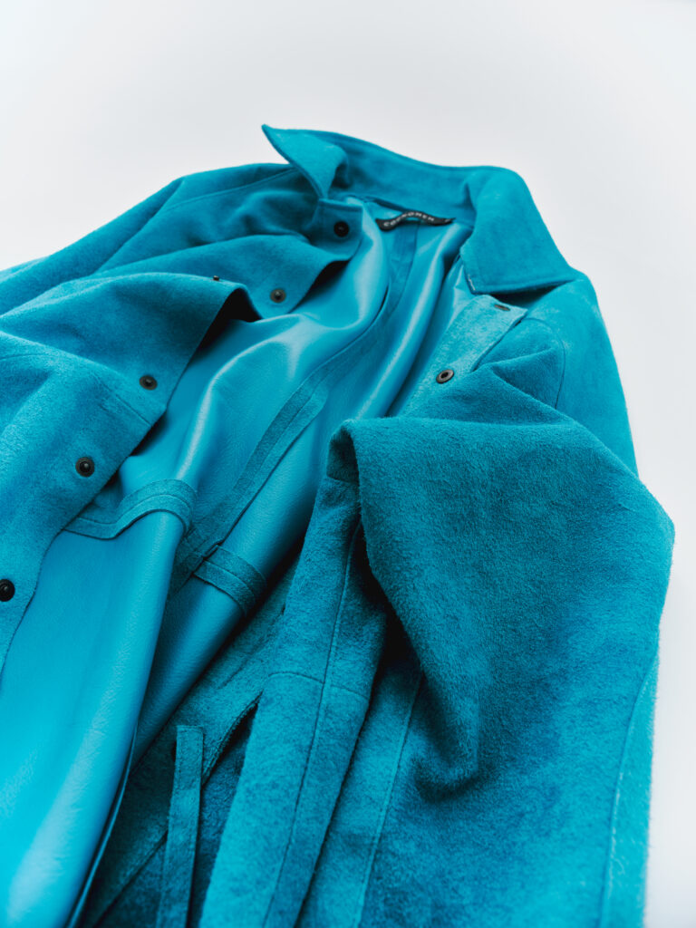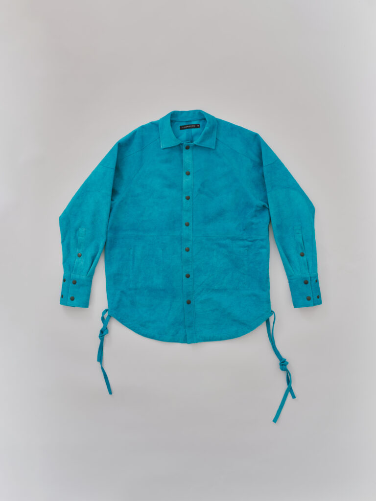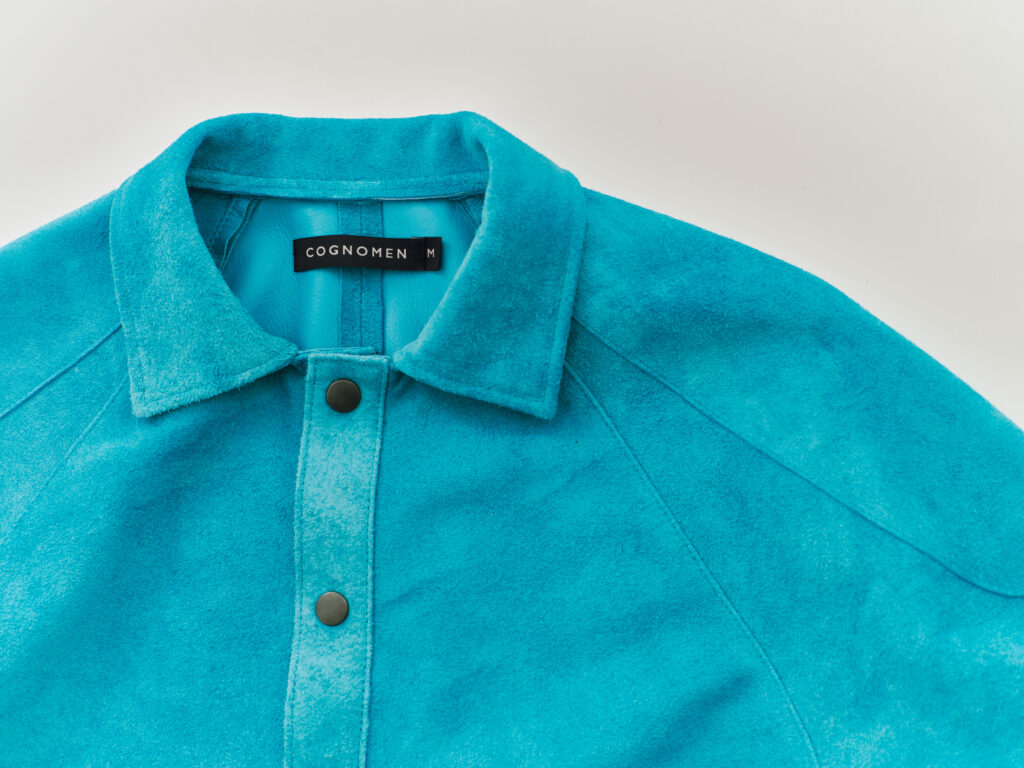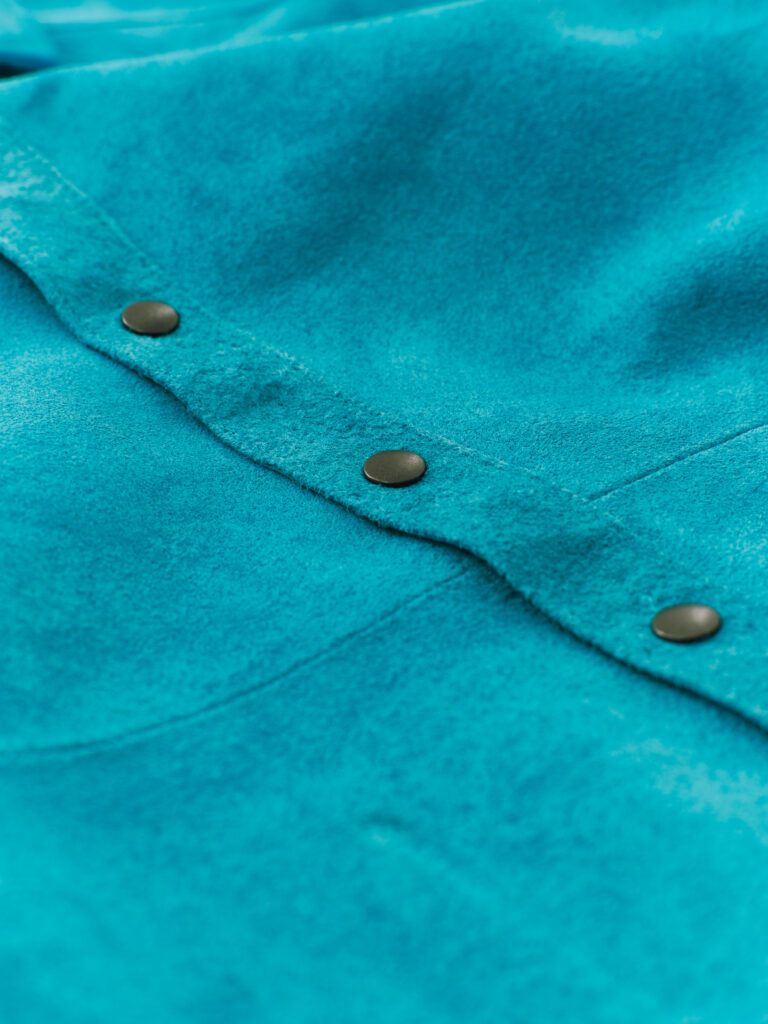 24SSから作り始めたゴールキーパーに着想を得たパターンを、 今回はターコイズ色のスエードで作りました。