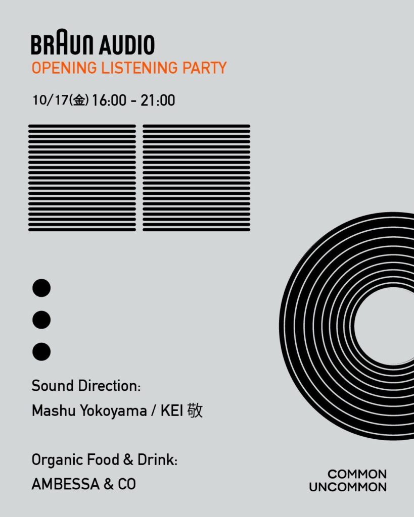 10月17日(金)のオープニングイベントでは、複数のBraun Audioを組み合わせた実験的なリスニング体験を企画。サウンドディレクションは、Mashu Yokoyama / KEI 敬が手がける。Roedeliusをはじめとするドイツ・アンビエント音楽や環境音を融合し たサウンドが展示空間を彩り、Braun Audioとアンビエント音楽の新たな関係性を描き出す。「Less but better」の精神のもと、 時代や場所を超えて音とデザインが交錯する非日常の一夜をお楽しみ頂きたい。