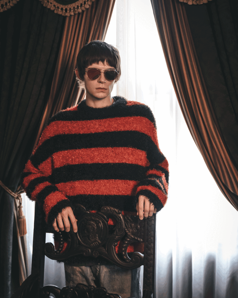 また、コラボレーションアイテムに加え、多彩なニットアイテムもラインアップ。ヴィンテージ市場でも希少なモヘアのカーディガンを©SAINT Mxxxxxxの感性で再構築した一着や、Cali DeWittの私物ヴィンテージをデザインソースとしたレオパード柄のカーディガン、グリッターが放つグランジの空気感を纏うプルオーバー、ニットジャケットなど、それぞれ異なる魅力を持つアイテムが揃う。
