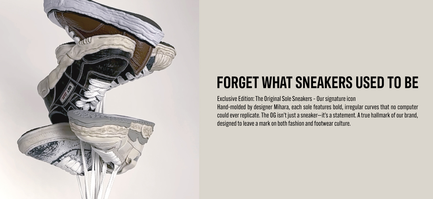 デザイナー自身が粘土で型取ったオリジナルのソールを使用したシリーズ “Original Sole Sneakers”。 今回そのシリーズより今年 1 月にパリで発表した 2025 年 AW コレクションの人気モデルをベースに、コレ クションとはまた異なる特別な加工や限定色を施したエクスクルーシブなスニーカーが店舗限定で登場。