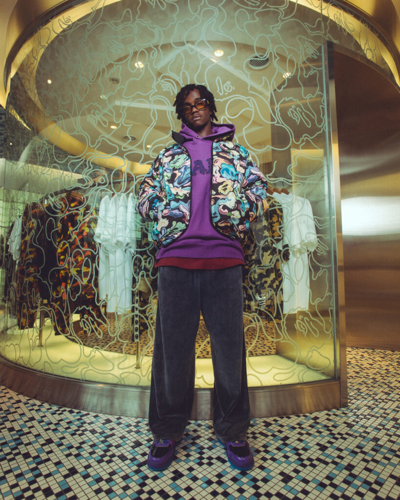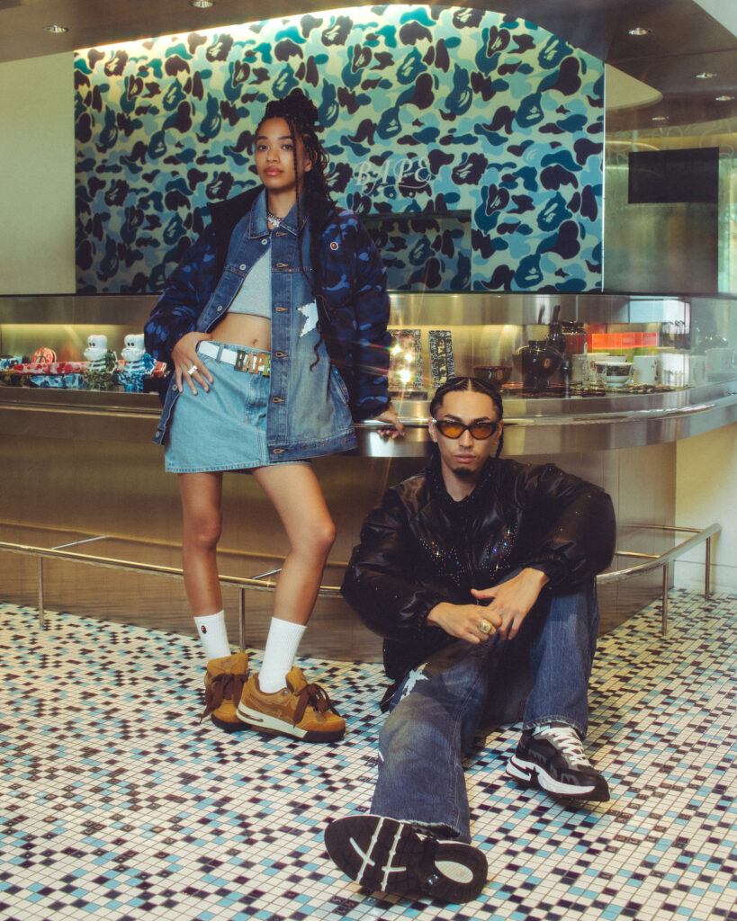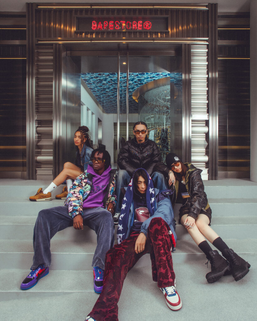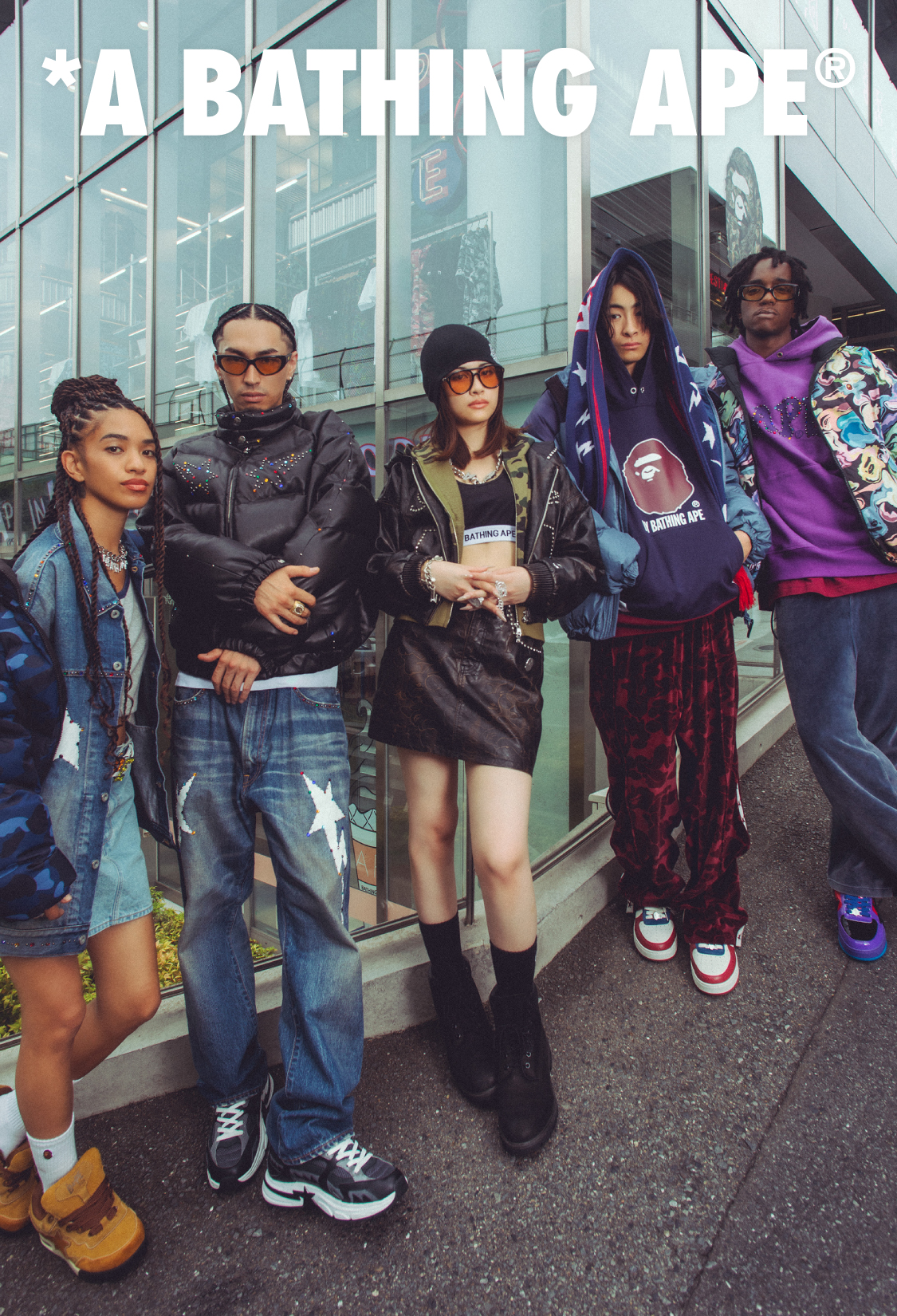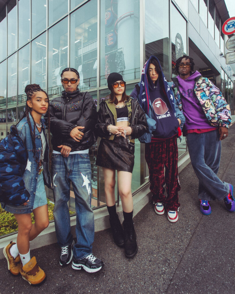 キャンペーンには、ラッパー、スケートボーダー、クリエイターなど、ジャンルもバックグラウンドも異なる才能たちが集結。舞台は渋谷と原宿のBAPE STORE®。交差点の喧騒やビルのガラスに映る光の中で、それぞれが自分らしい着こなしを見せる。日本のストリートを象徴するロケーションで撮り下ろしたビジュアルは、BAPE®のルーツと、今を生きるリアルなストリートをつなぐオマージュだ。