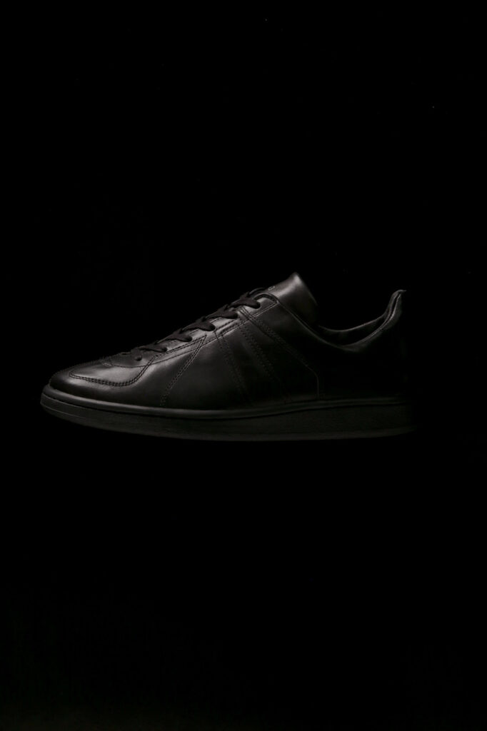 また、素材にはイタリア産のホースハイド(馬革)を採用。通常モデルのカウレザーよりも艶感と耐久性を兼ね備えた質感が特徴。さらに、ロゴは鏡映しに配置され、既存のアイコンを再解釈。ソールは1970年代にスペインの老舗サプライヤーがテニス用に開発したカップソールを使用し、イタリアンホースハイドと直接縫い付ける「サイドマッケイ製法」で仕立てることで、唯一無二の佇まいを実現した。