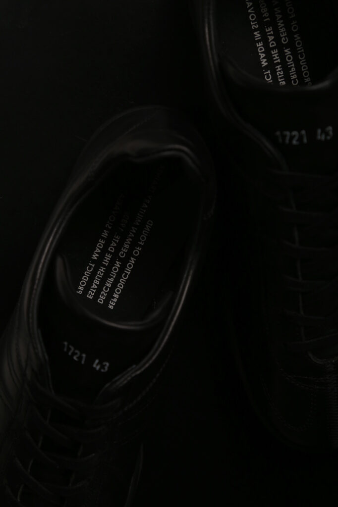 ベースとなるのは、REPRODUCTION OF FOUNDが得意とするジャーマントレーナー。イタリアンホースハイドを裏表反転し、縫い目を表に露出させる「インサイドアウト」仕様とすることで、デザインの緊張感を演出。本来表に出るパーツを裏側に配置するなど、従来の構造を反転させたユニークなパターンに仕上げている。