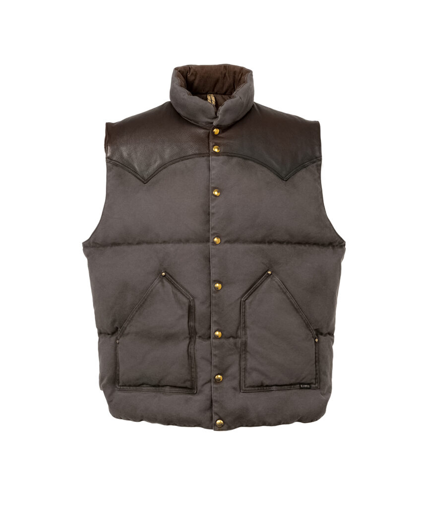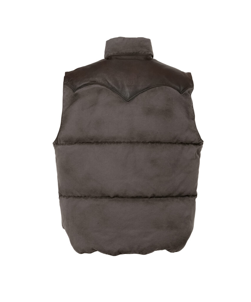 アイコニックなウエスタンヨーク部分には、一枚裁ちの牛革をダークブラウンで配色。スナップボタンやリベットには、エイジングと相性の良いブラス製パーツを採用している。裏地には、Rocky Mountain Featherbed 復活時に開発されたオリジナルの 70 デニール・ナイロンタフタを使用。軽さ・保温性・強度をバランスよく備えた三層構造です。中綿にはヨーロッパ産の撥水ダウンを採用し、ダウン 90%・フェザー10%のバランスで 700 フィルパワーの高い保温性と驚くほどの軽さを実現。アームホールを広めに取り、レイヤードしやすいオーバーサイズシルエットに仕上げた。クラシックな表情を保ちながら、現代のスタイルにも馴染む万能な一着となっている。