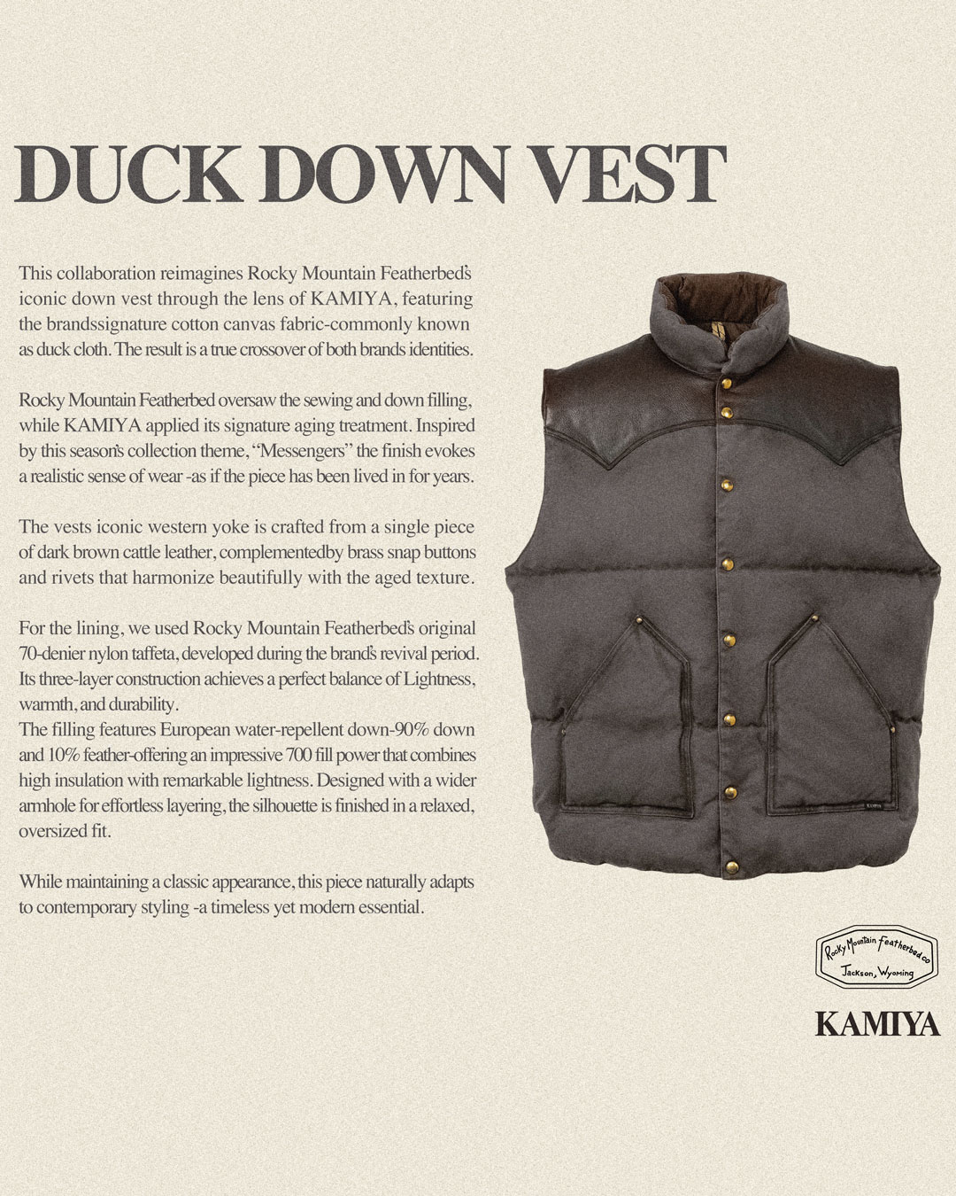 KAMIYA(カミヤ) は 2025 秋冬コレクションのルックでも登場した、アメリカ発のヘリテージブランドRocky Mountain Featherbed(ロッキーマウンテンフェザーベッド)とコラボレーションしたダウンベストを10 月 25 日(土)に発売する。
