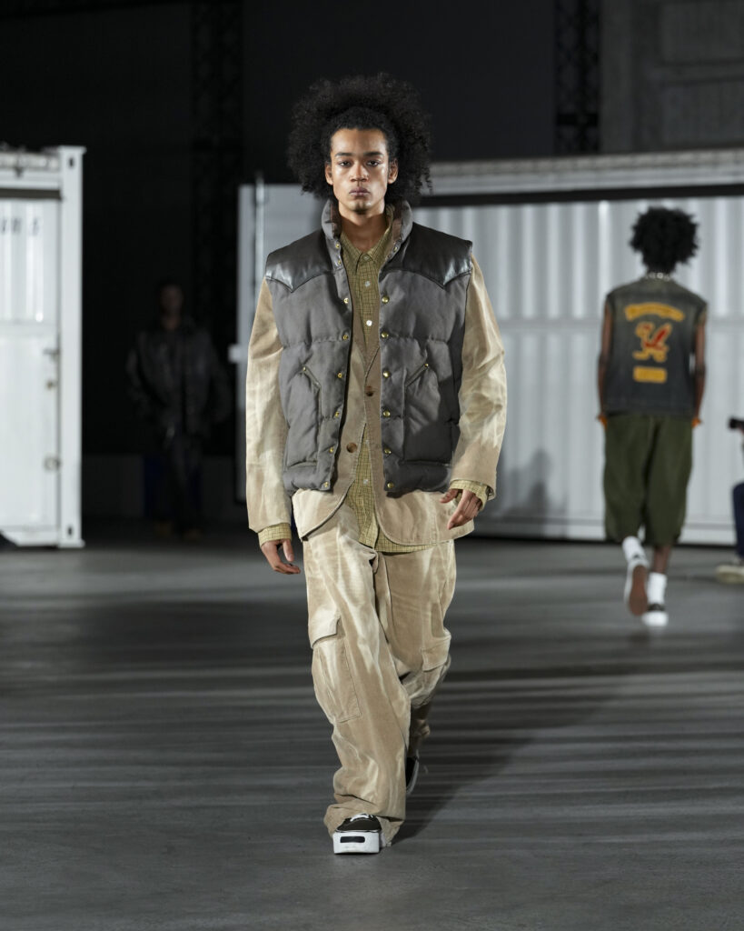 本コラボレーションでは、Rocky Mountain Featherbed の定番ダウンベストをベースに、KAMIYA が使用するコットンキャンバス生地〈通称ダック生地〉を採用。両ブランドのアイデンティティをクロスオーバーさせた。縫製とダウンの配合は Rocky Mountain Featherbed が担当し、KAMIYA がエイジング加工を施している。加工では、コレクションテーマである NY のメッセンジャーに焦点を当て、長年着込んだようなリアルなストーリー性を表現した。