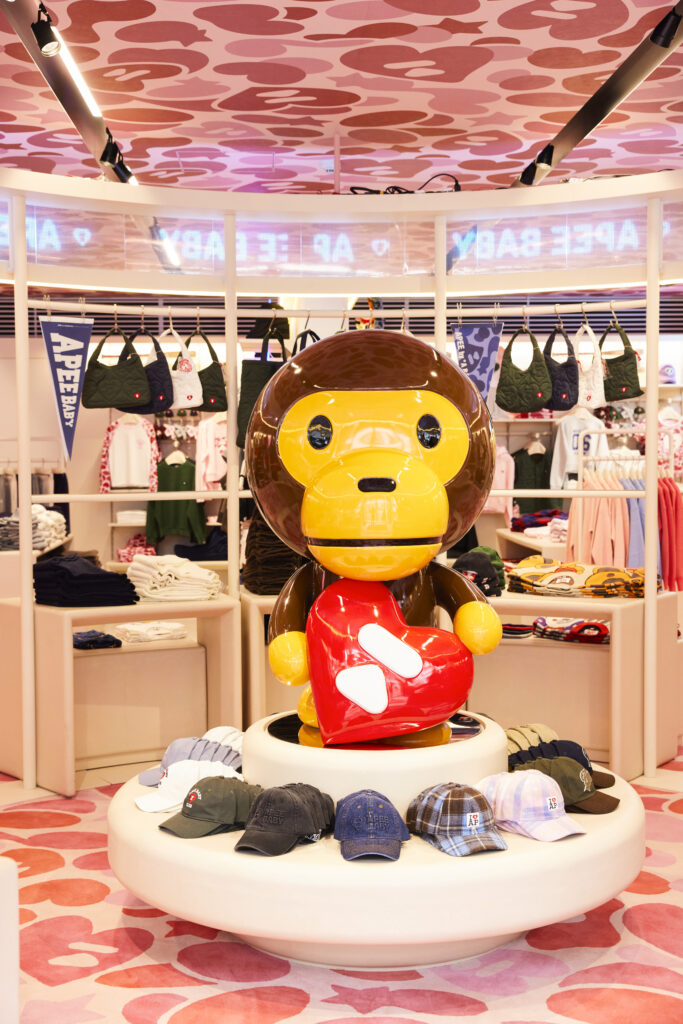 APEE初の旗艦店となる「APEE STORE HARAJUKU」は、ブランドの世界観を体現する新たなトレンド発信拠点となる。店内は、ピンクのハートカモフラージュ柄を基調にデザインされ、床から天井までブランドの象徴が散りばめられている。中央には、BABY MILO®がAPEEのハートロゴを抱く3Dスカルプチャーを設置。ブランドが掲げる「青春」「愛」「自信」を象徴するフォトスポットとして注目を集める。また、インタラクティブな試着スペースや限定グッズエリアを設け、来店者が自由にスタイルを楽しみながら「自分らしさ」を表現できる空間を実現している。
