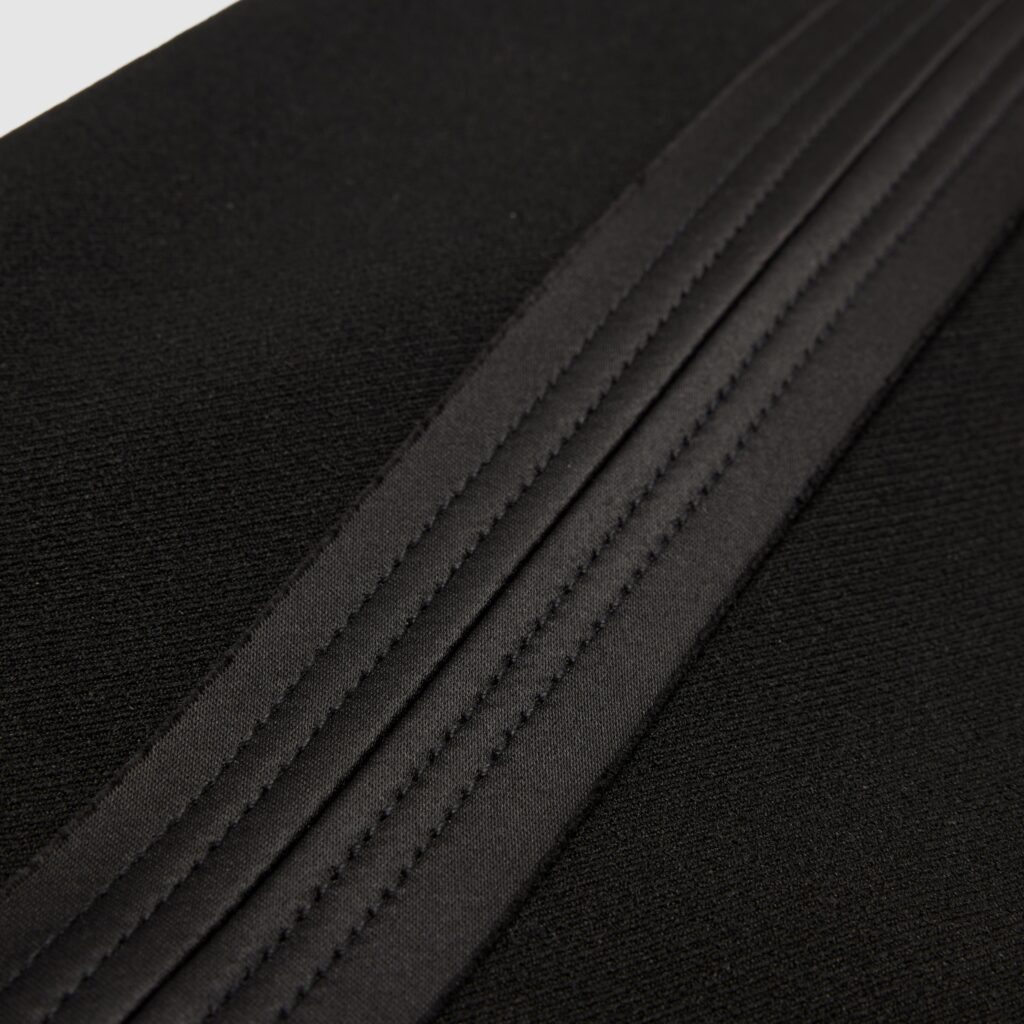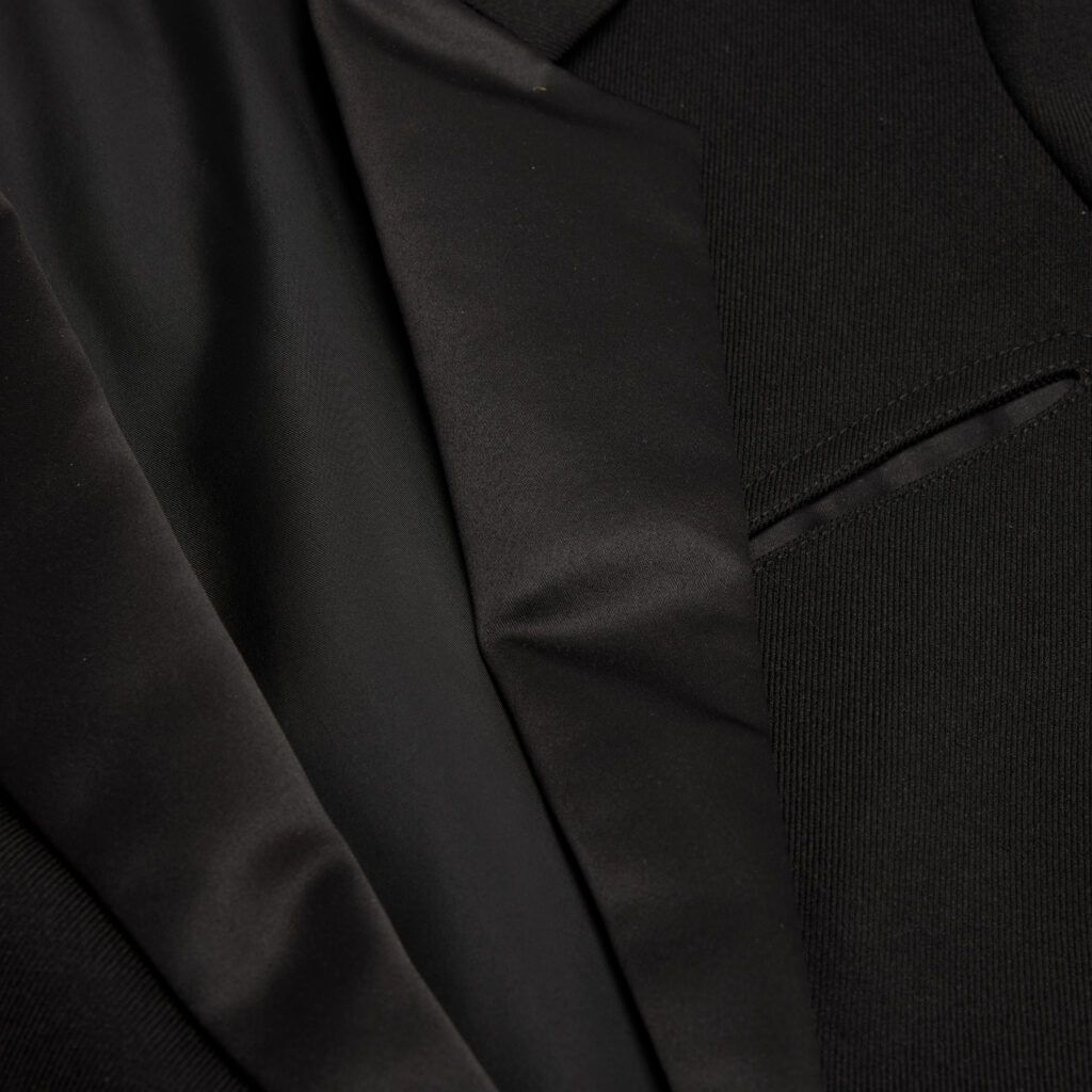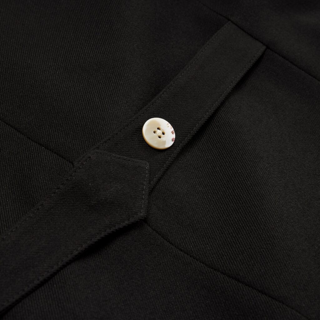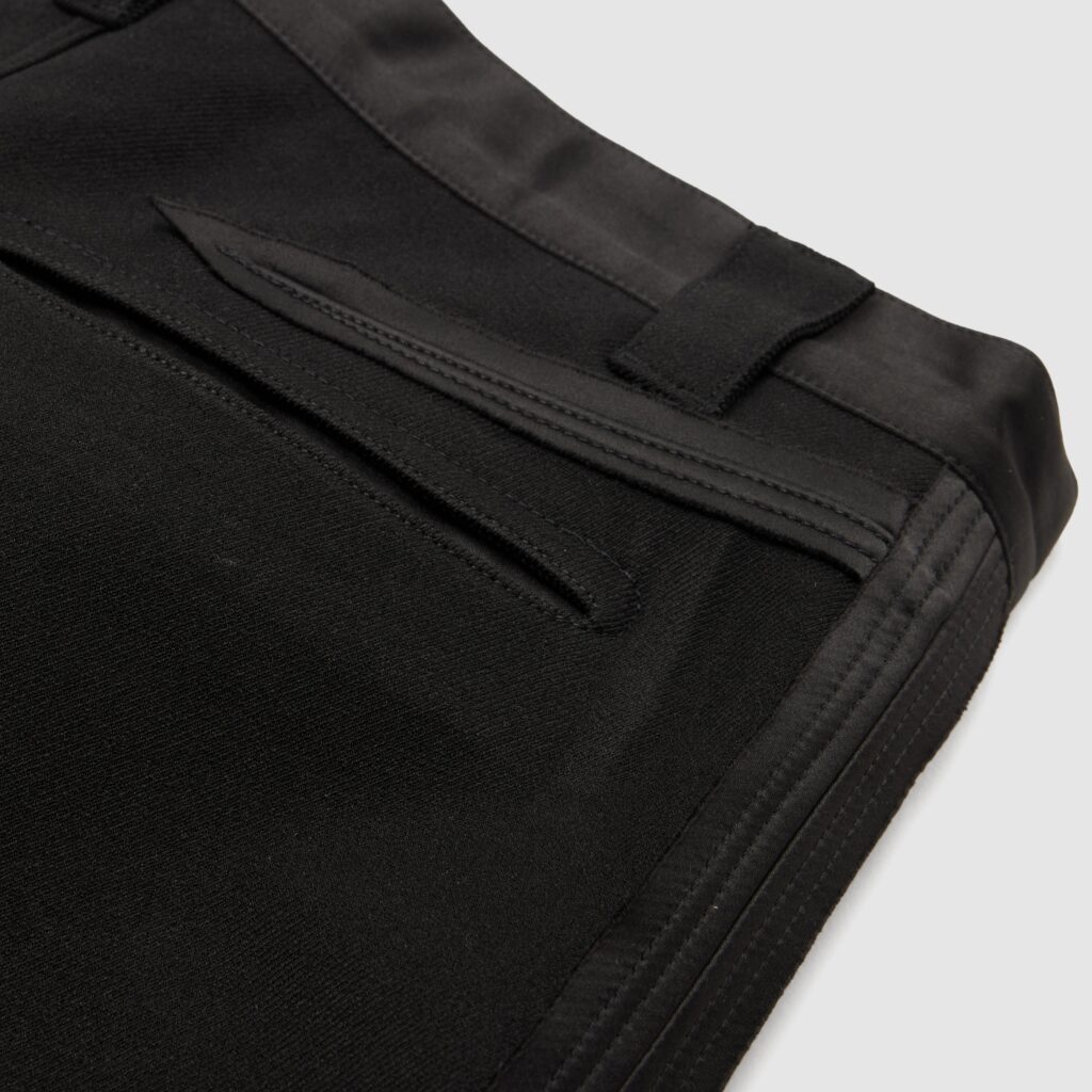 コレクションの中でフォーマルな表現を極めたのが、Levi’s® x Kiko Kostadinov Andy Suit Jacket 。8 オンスのブラックポリエステルツイルを使ったこのブレザーはスリムなフィット。サテンのラペル(襟)、フロントのプリーツ、肩のダーツ、そして袖の仕立て方が、ブラックタイのフォーマルウェアに通じるエレガンスを感じさせる。崩れにくいクリース(折り目)は、1960 年代に Levi’s®がデニムに初めて導入した革新的な Sta-Prest®へのオマージュ。そして隠しボタン、シンチのディテール、精密に入れられたダーツが Kostadinov ならではのテクニカルな精度を語っている。このジャケットとセットで登場するのは、ブラックのポリエステルツイルで仕立てられた Levi’s® x Kiko Kostadinov Andy Suit Trouser 。バックダーツにはローエッジのサテンを使い、ベルトループはワイドめ。フロントにはスラントポケットが、背面にはシングルウェルトポケットがついている。