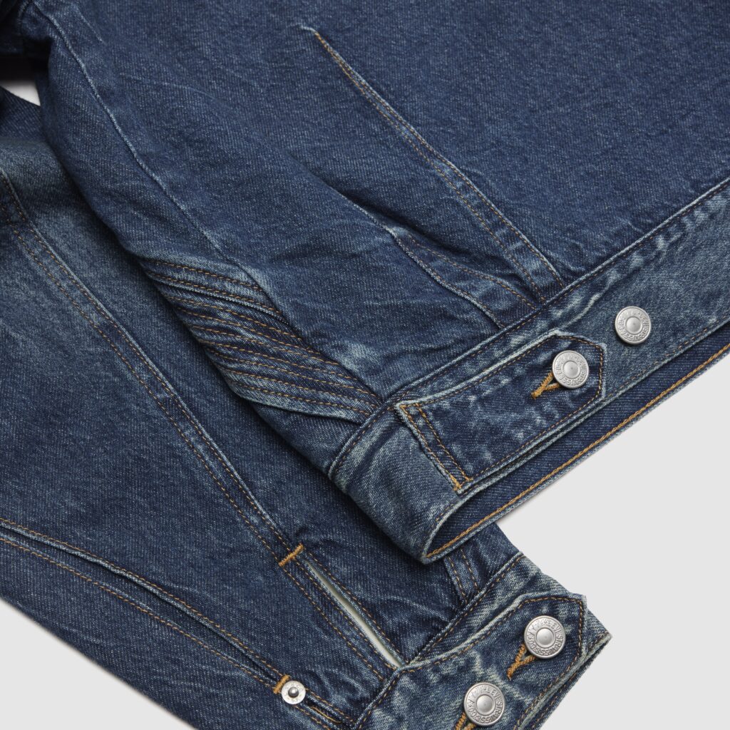今回、第一弾のコレクションで人気を集めた Levi’s®x Kiko Kostadinov Articulate Jacket が、オーセンティックなヘリテージ加工を施した 10 オンスの軽量ミッドブルーインディゴデニムで再登場。改良されたポケットと 1 本針のトップステッチは、クラシックなトラッカージャケットが持つ伝統へのオマージュだ。そして肘の近くにある Levi’s®のタブと袖口に向かって入った微かなプリーツが、モダンな表情を加えている。