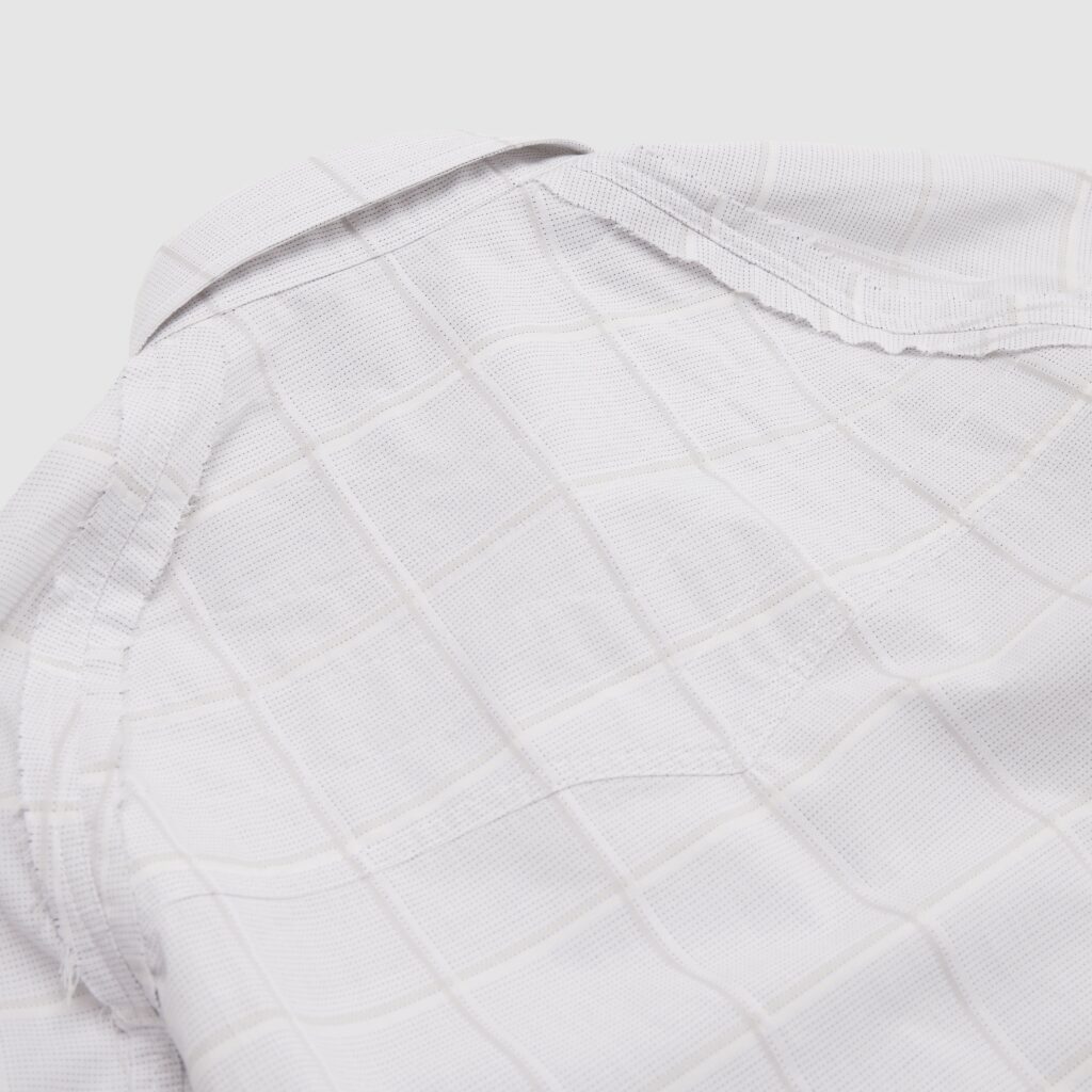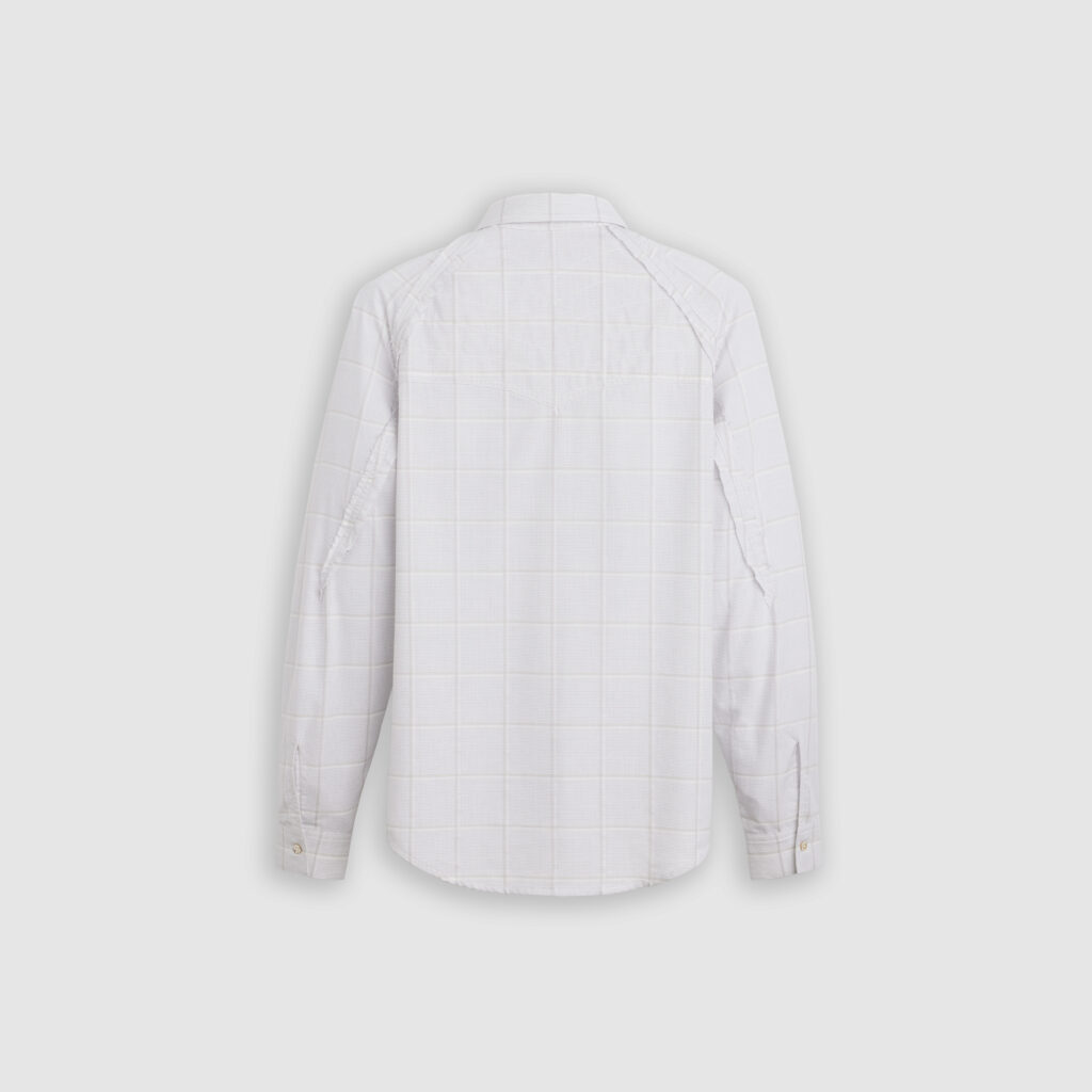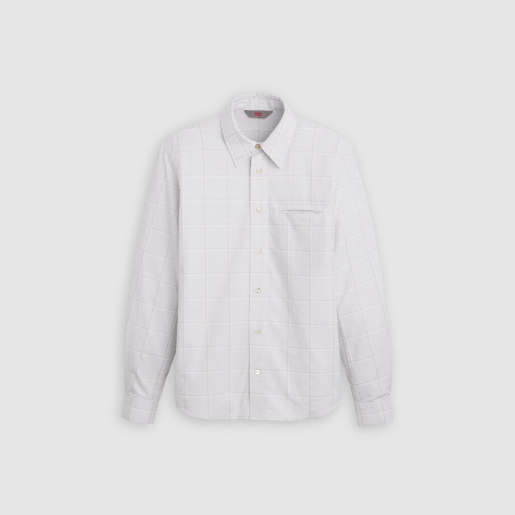 Levi’s® x Kiko Kostadinov Andy Pattern Shirt は、フォーマルの作法とカジュアルの作法を結びつけたシャツ。グレーとホワイトの軽やかなウィンドウペン柄の生地を使い、スタンダードフィットのシルエットで仕上げました。 フォーマルとカジュアルの間を自由に行き来できるように、表に見える形でついたシェルボタン、胸のウェルトポケット、背中のヨークに施したトップステッチという洗練された要素を持たせている。