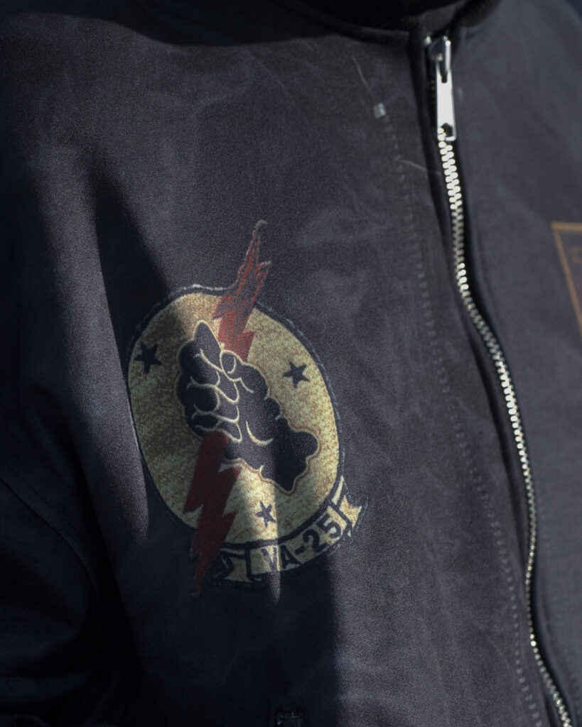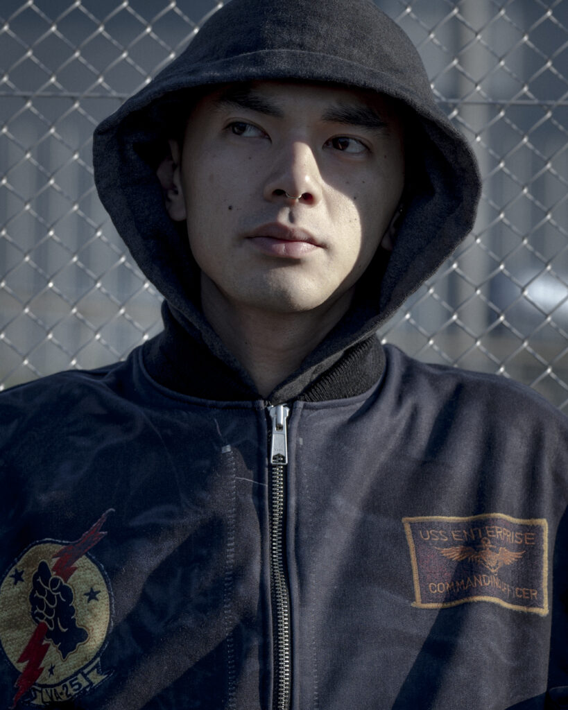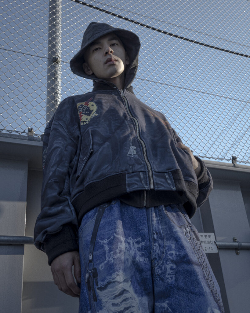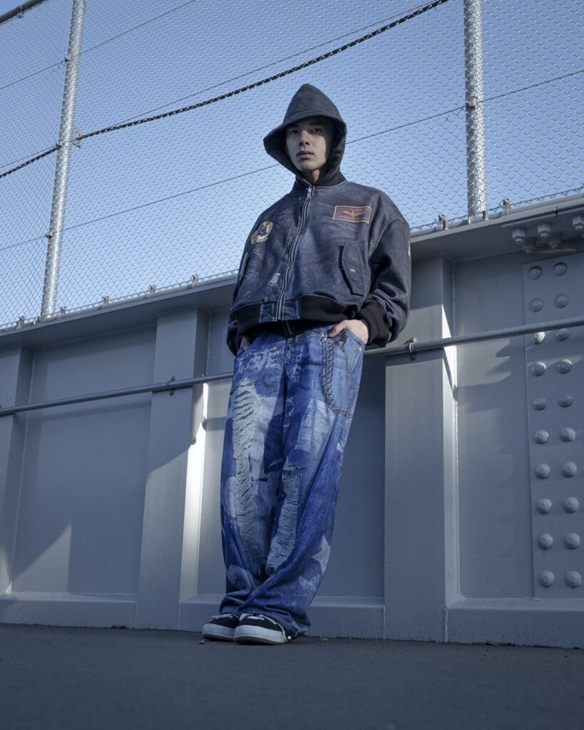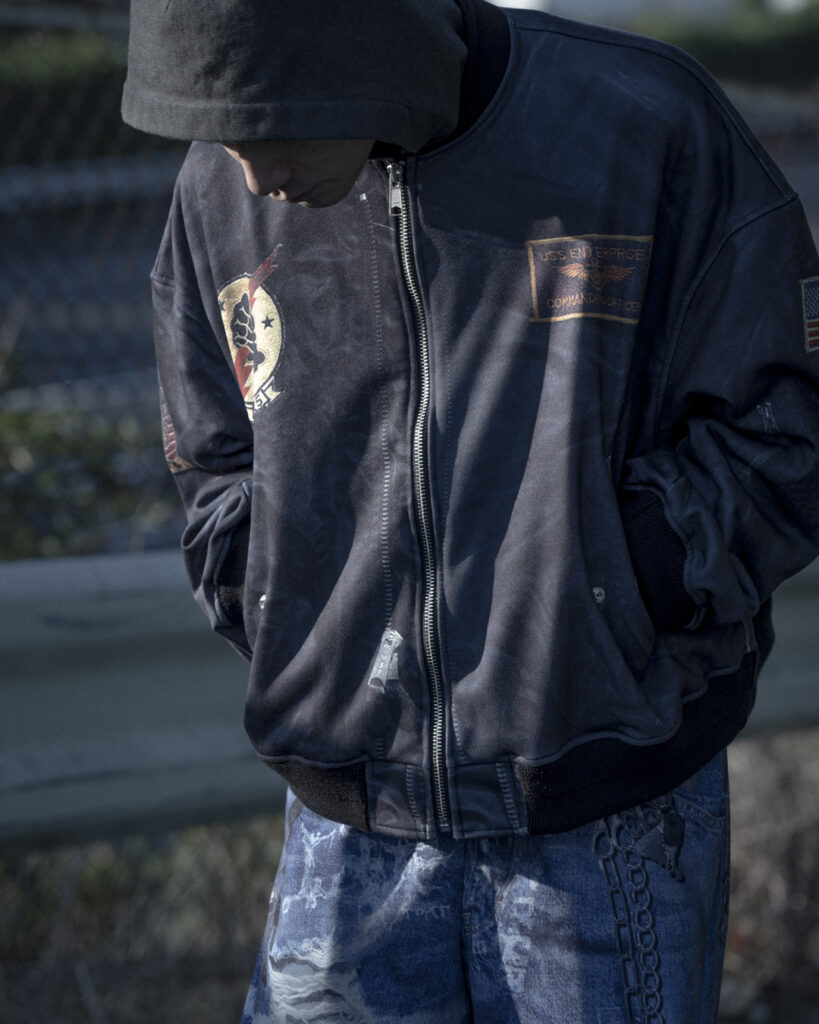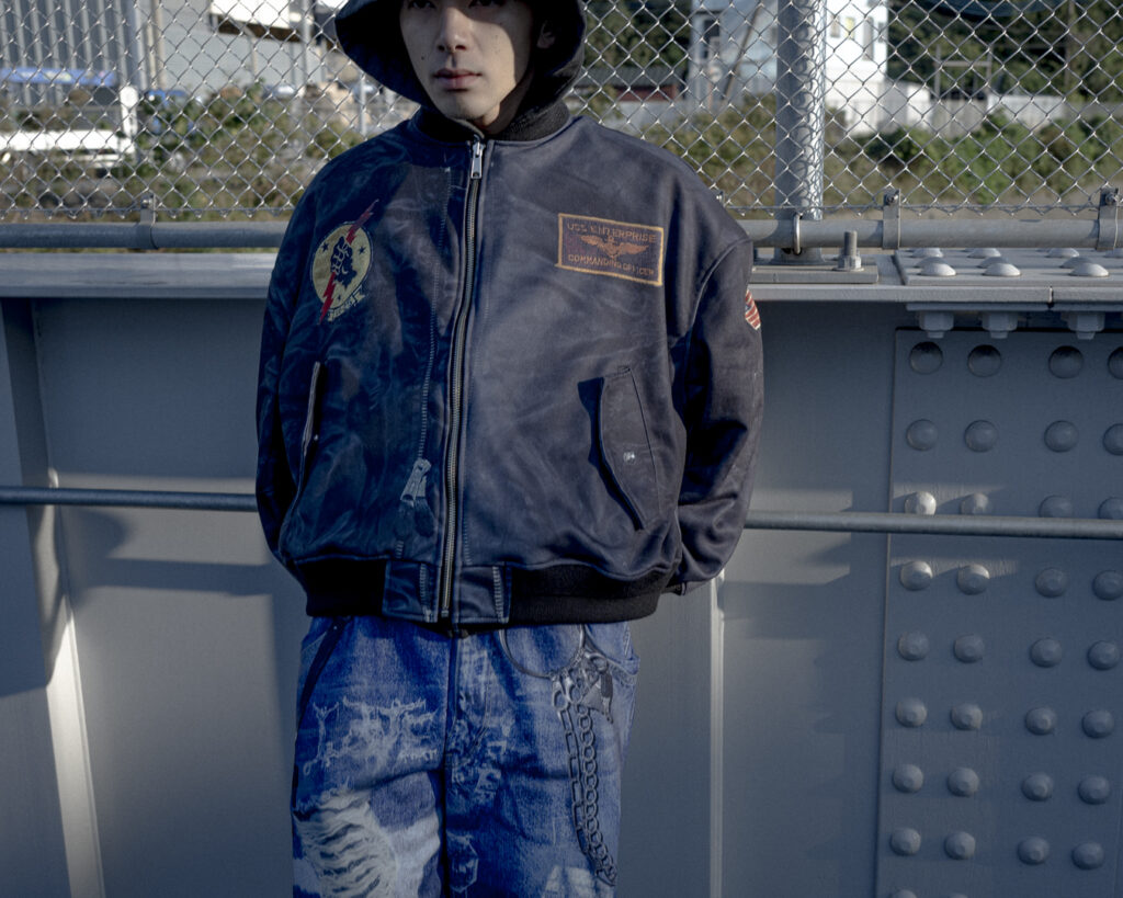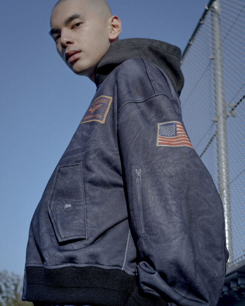 MA-1 のように見えるブルゾンは、実際にはスウェット素材で構成されています。オリジナルの MA-1 をベースに転写加工を施すことで、光沢感や凹凸の質感を再現。リアルとフェイクが重なり合う、アートピースのような一着。