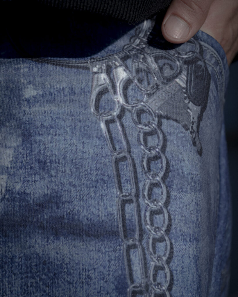YUKI HASHIMOTO の人気シリーズであるツイストデニムの要素を取り入れ、ダメージやグラフィックの表情をそのままスウェットへ転写。ラフな着心地ながら、ヴィンテージデニムの存在感を纏います。ストリート とモードが交差する一本。