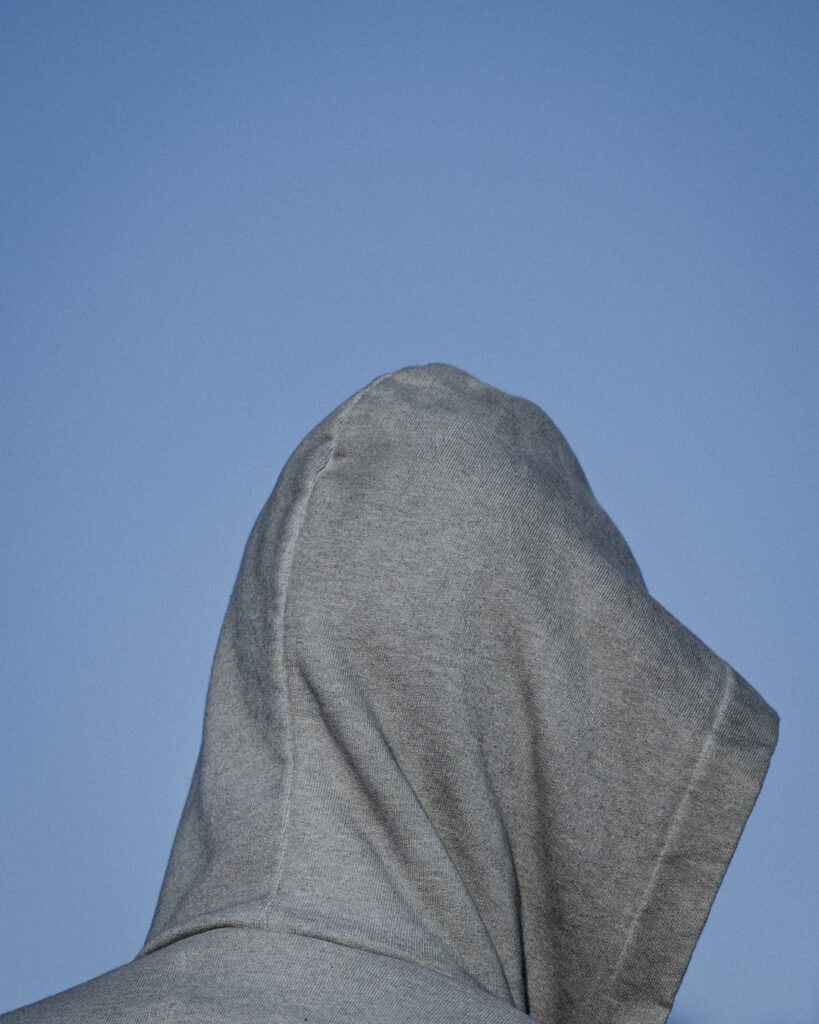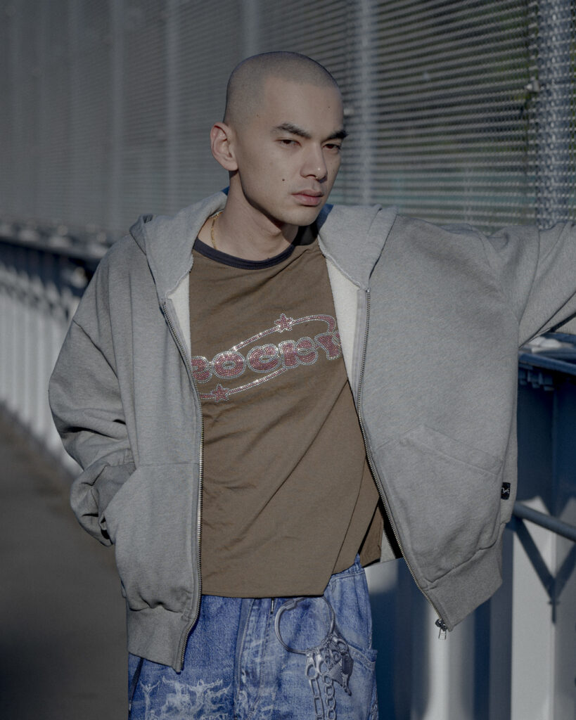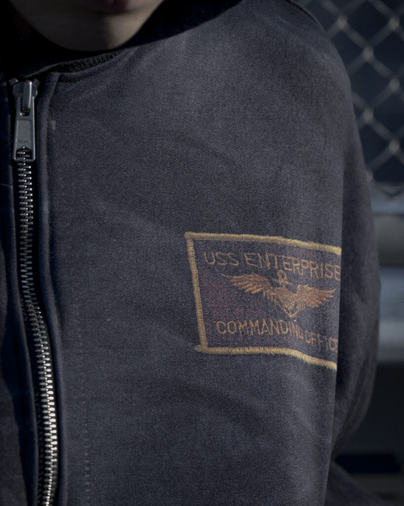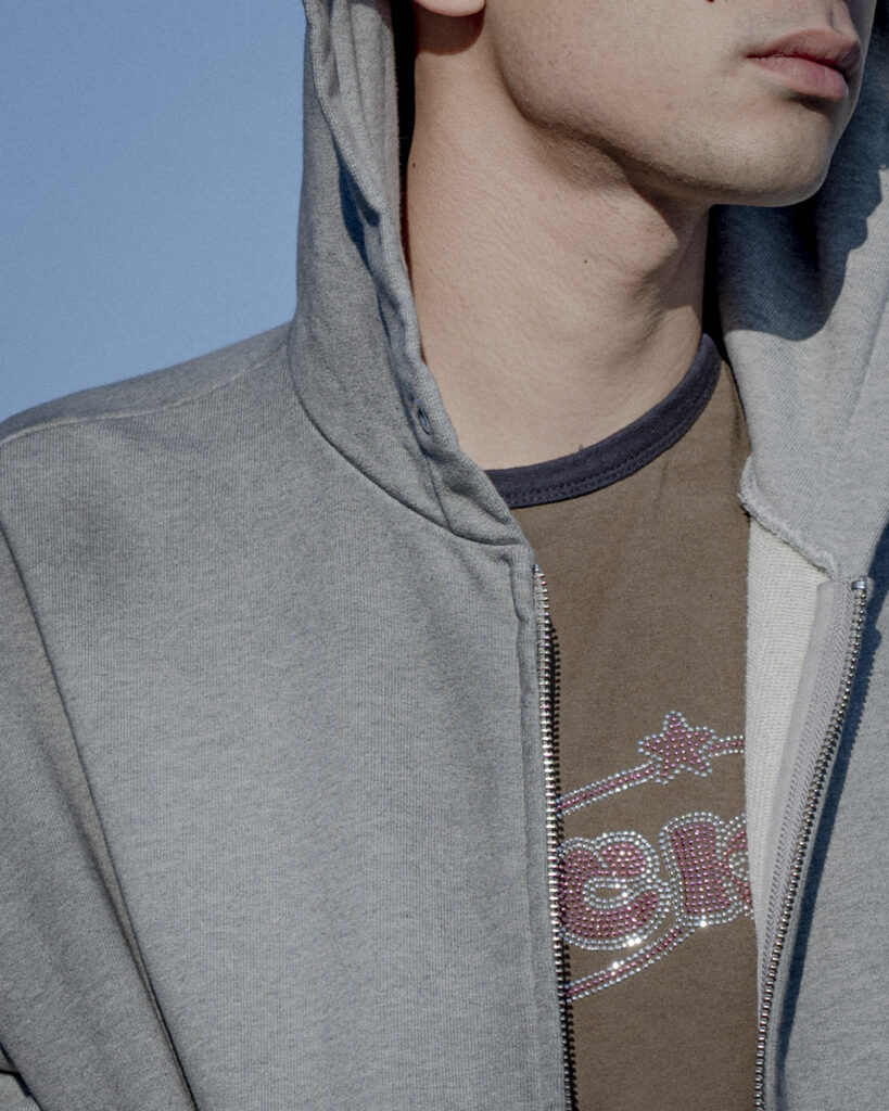 立体的なフォルムを土台に、スプレー加工で奥行きを与えた ZIP アップパーカー。シンプルでありながら、コレクションのテーマを象徴する空気感を備えている。