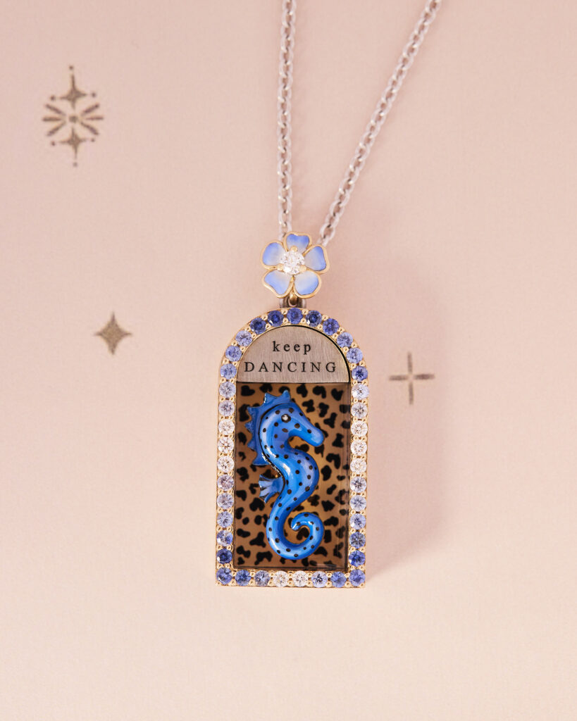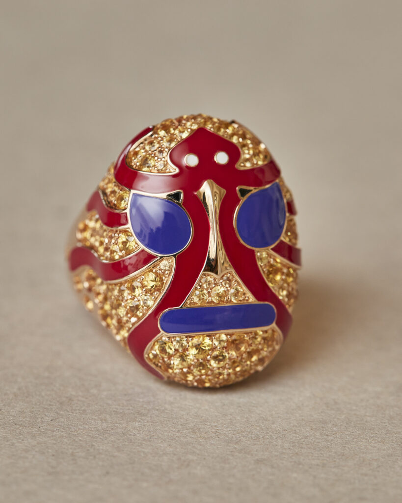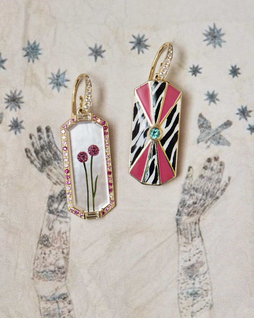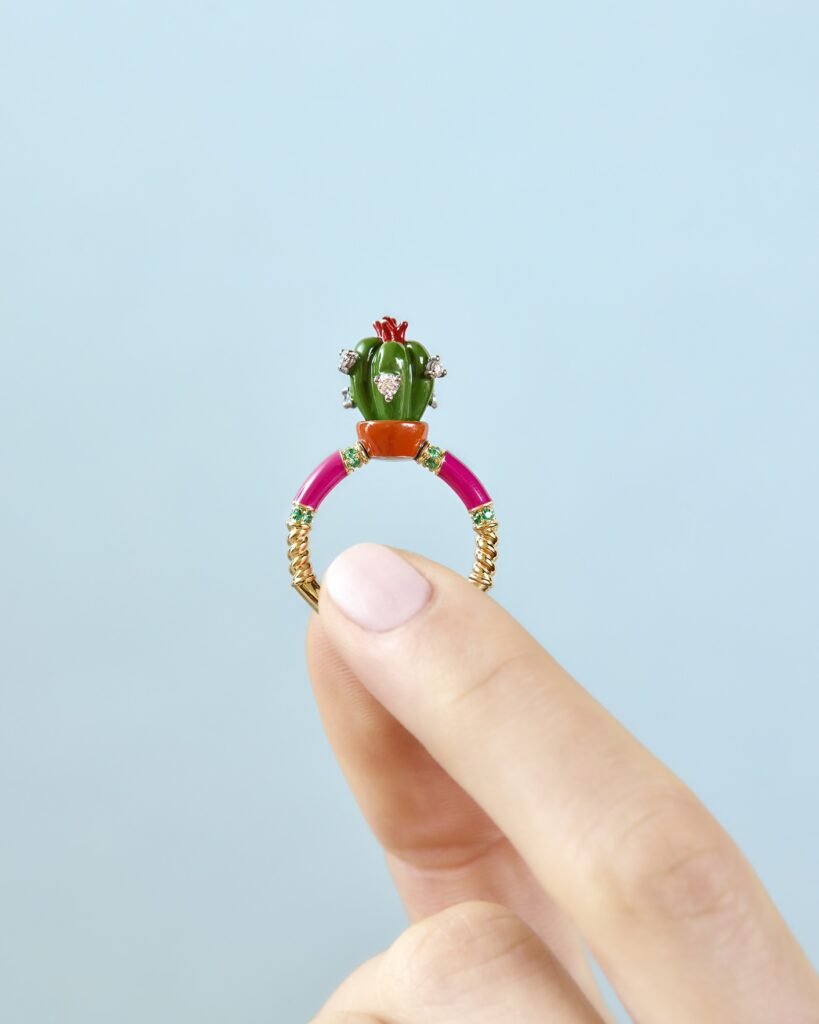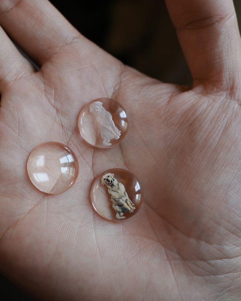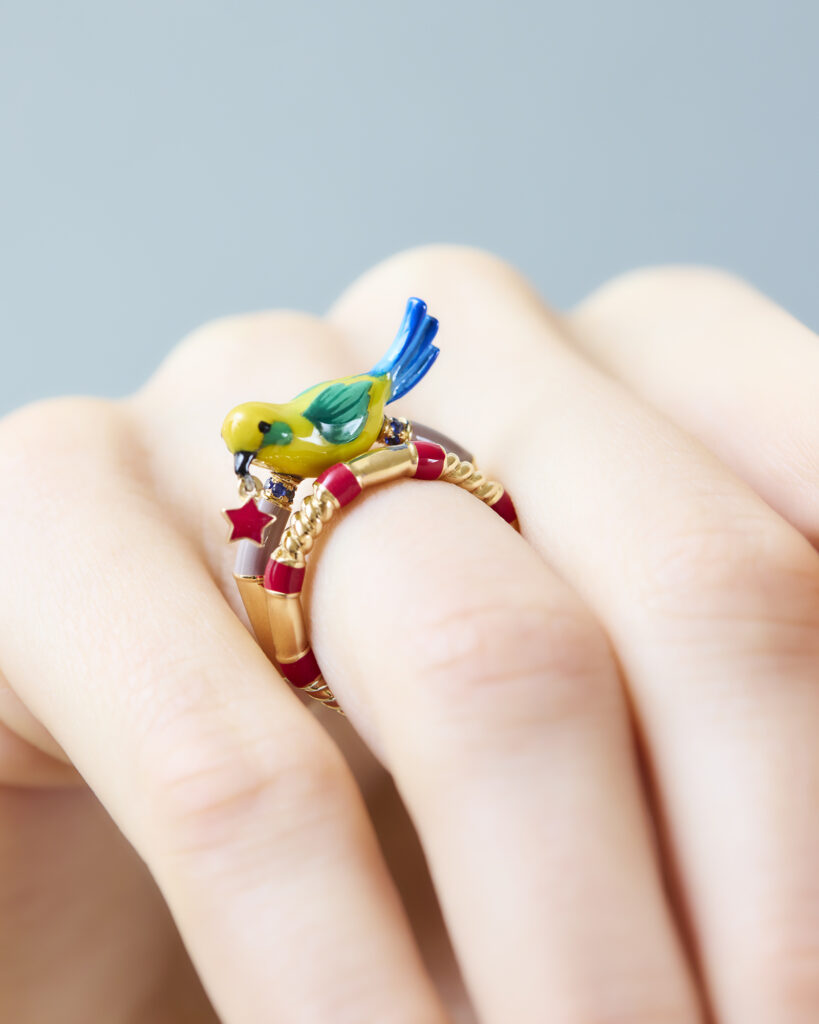 本イベントでは、前回も好評だった「Being Furry」の特別オーダー会を実施。愛猫や愛犬など動物のお写真をもとに描き起こし、ジュエリーとして仕立てるサービス。今回は、脇石を配さないシンプルなタイプや、背景にストライプやドットの模様を施したスタイル、色を加えないことで彫刻の造形や陰影が引き立つクリスタルのデザインなど、新たなバリエーションが加わり、カスタマイズの幅がさらに広がった。ご希望に応じて、Francesca によるドローイングもお渡し。遠方のお客様には、リモートでデザイナーを交えてオーダーを承ることも可能。加えて、新作を含め多彩なアイテムもご紹介いたします。デザイナーのFrancescaとともにジュエリーを創り上げる、個性豊かなオーダーの機会をご体験頂きたい。