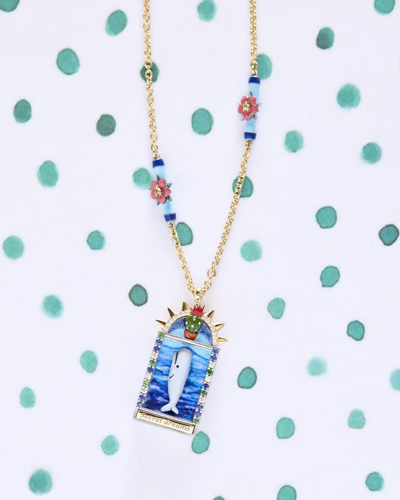 イタリア人デザイナーの Francesca Villa は、一流メゾンや有名アトリエのクリエイティブ・ディレクターを務めた後、自分のこだわりを込めた物語のあるジュエリーを作りたいと考え、ブランドを設立。彼女のデザインは、旅やアートから着想を得たものであり、世界中で見つけたアイテムや貴重な素材を組み合わせて作り上げられている。Francesca の作品は、アンティークの要素やビンテージの素材を活かし、独自の物語やストーリーを持つ非常に個性的なアイテムが多いのが特徴。彼女は、希少な宝石や歴史的なオブジェクトを組み合わせることで1点物のジュエリーを生み出すことに特化している。