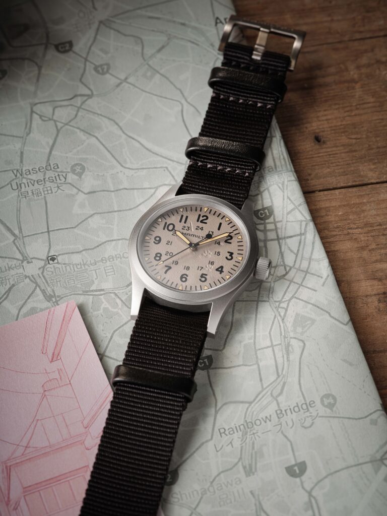1960 年代に英国政府の非軍人向けに製造された「ハミルトン G.S.」をモチーフに誕生した「カーキ フィールド クォーツ」。正統性を受け継ぎながら、ファッションコーディネーションとしても楽しめるエントリーモデル。