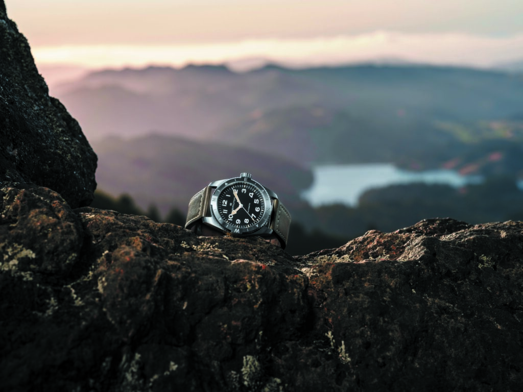 ダイヤル上にパワーリザーブを示す、標準持続時間表示機能を備えた「カーキ フィールド」。伝統的なフィールドウォッチのデザインと、現代の時計製造技術が融合したモデル。エネルギー残量をひと目で確認できる実用性は、日々さらなる高みを目指す現代の冒険家にとって最適のツールだ。