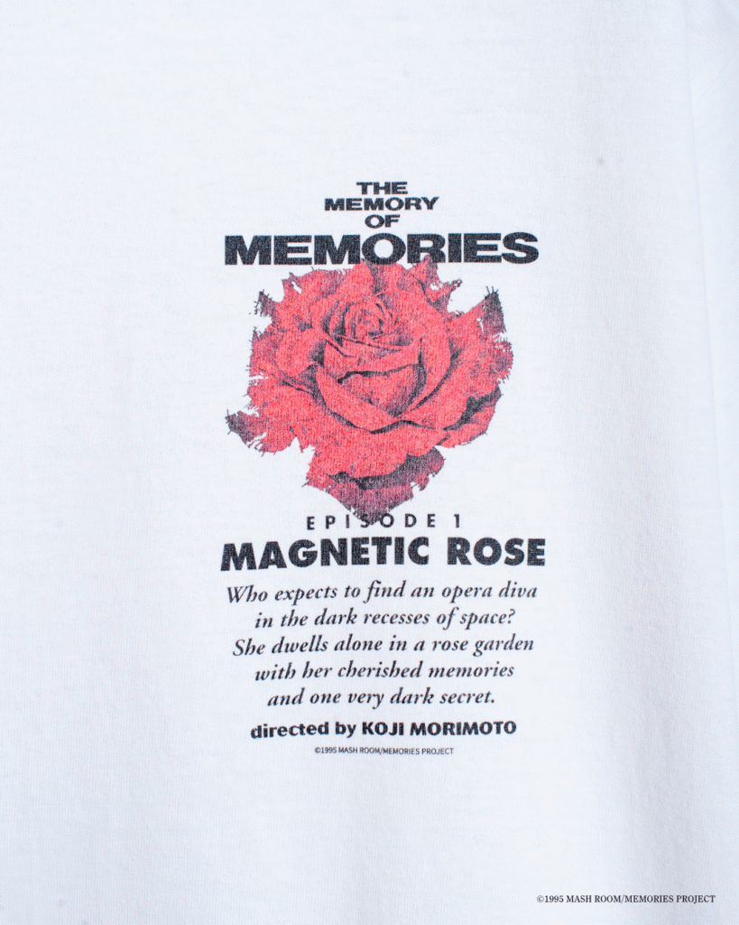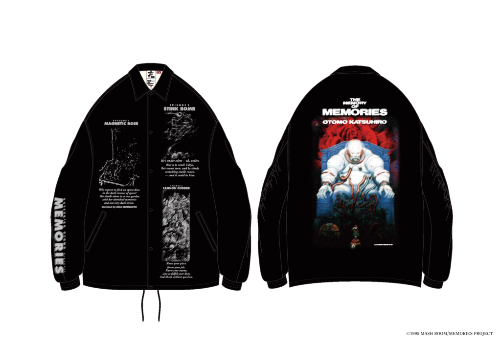 『MEMORIES』第一話彼女の想いで(MAGNETIC ROSE)のホログラム演出を素材技法として 落とし込んだコーチジャケット。 視点の変化でグラフィックが立体的に浮かび上がり、 背面にはメインビジュアルを配置。30周年記念限定仕様となっている。