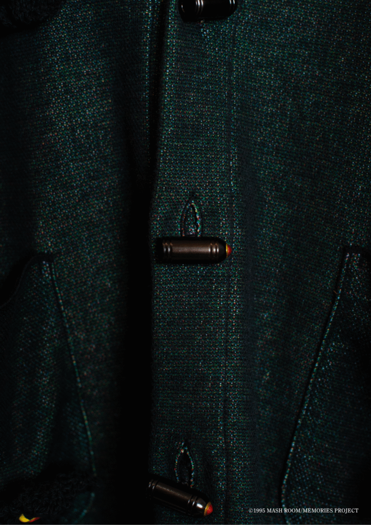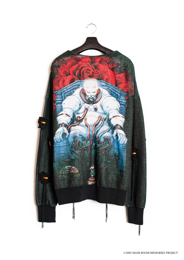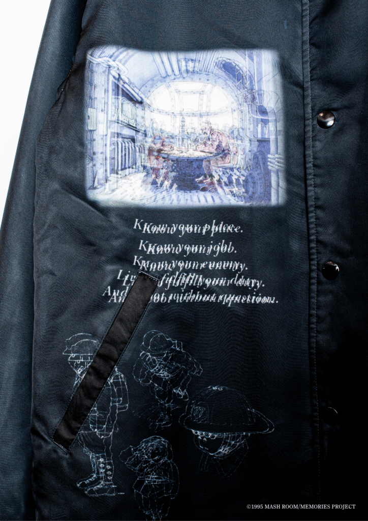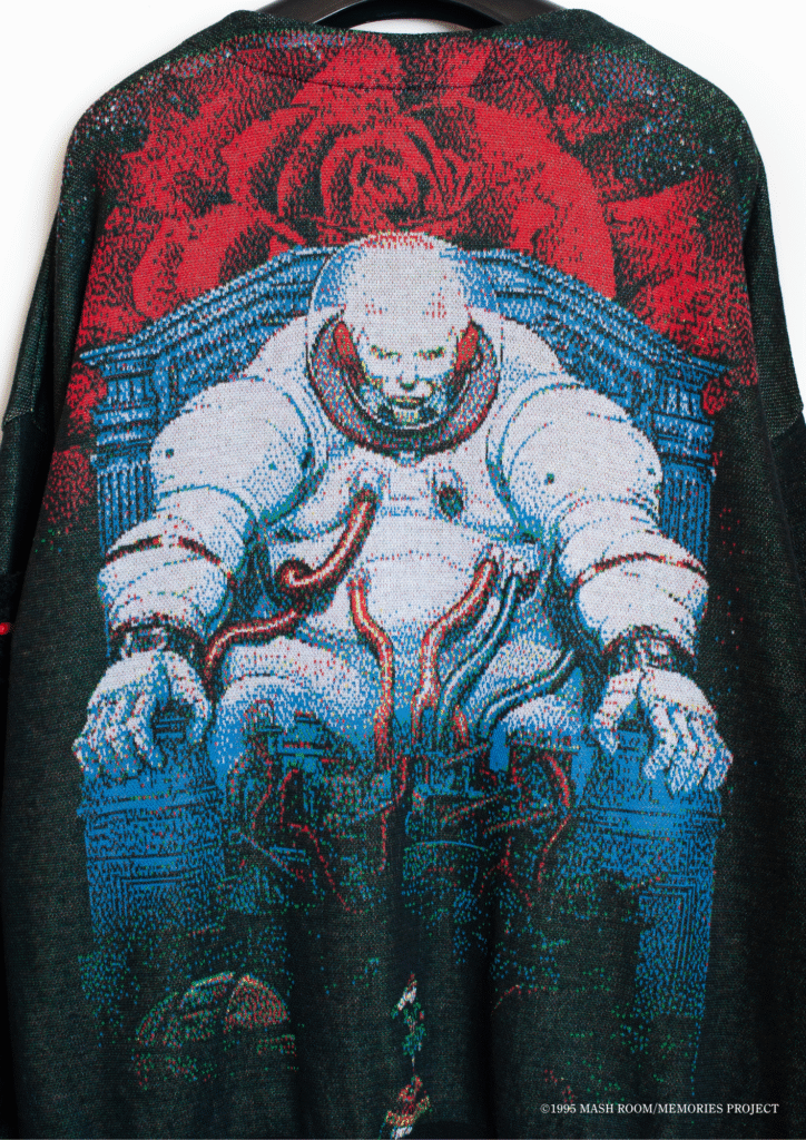 大友克洋先生の繊細な筆致をニットで表現するため、6色の糸を緻密に設計し、ジャカードで編み立てた。 モチーフはオムニバス3作を横断し、「彼女の想いで」を象徴する薔薇は手編みのニットで表現し、 「最臭兵器」のカプセルはオリジナルパーツで再現。 また、「大砲の街」に登場する大砲を3Dモデリングから起こした特注ボタンを採用し、三作品のシーンを一着に集積。 コラボレーションのメインビジュアルにふさわしい存在感へ仕上げている。