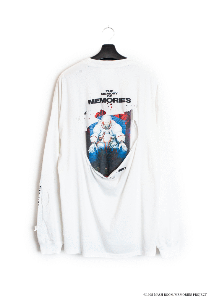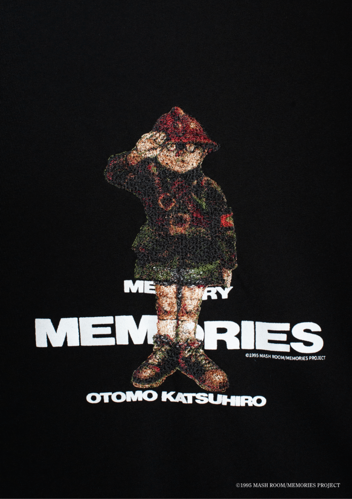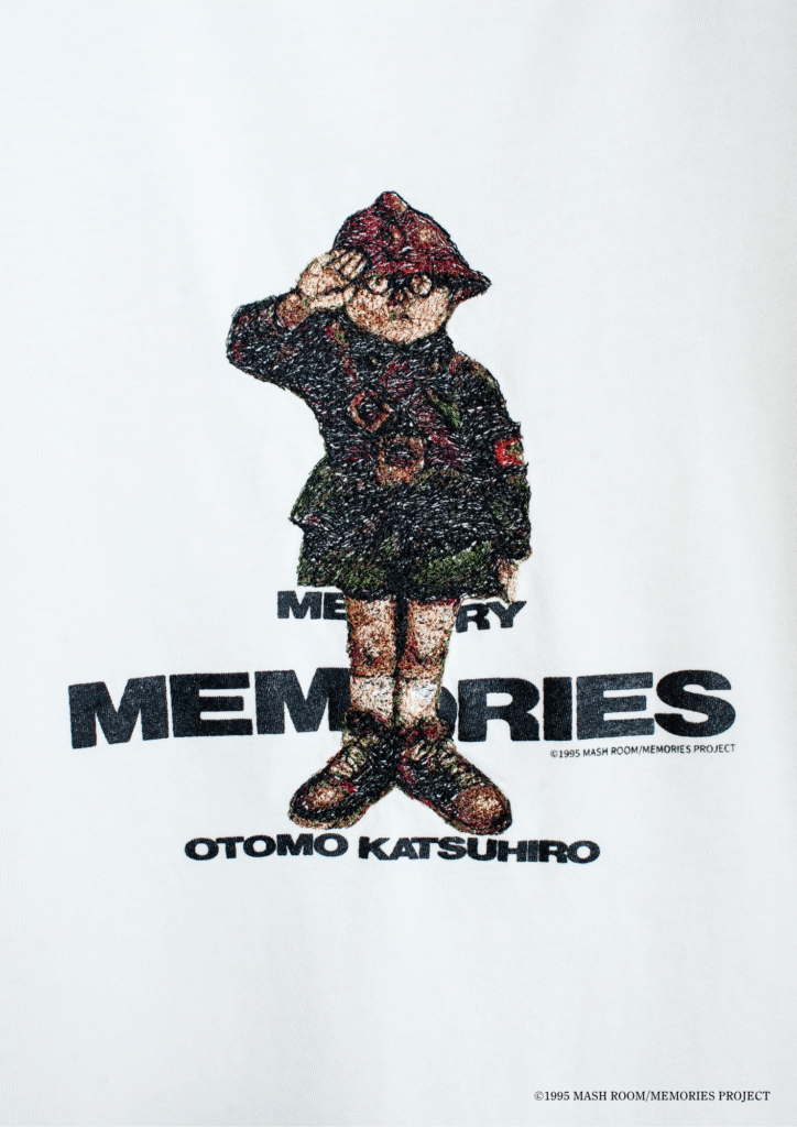 『MEMORIES』 EPISODE.3「大砲の街」に登場する少年を主役に据えたS/SLシャツ。 大友克洋氏の繊細なタッチを、通常の刺繍ではなく独自の手法で再現。刺繍データに意図的なグリッチを組み込み、ステッチの密度や進行方向にわずかな揺らぎを加えることで、陰影の段差と凹凸を生み出した。平面的になりがちな刺繍に彫刻的な立体感を与え、ファブリック上に浮遊するような奥行きと原画の空気を感じられる一着に仕上げている。