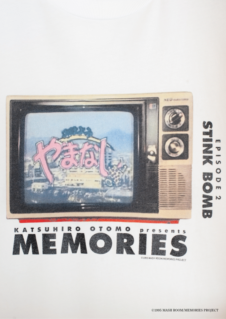 『MEMORIES』 EPISODE.2「最臭兵器」冒頭のローカル番組「おはようやまなし」のオープニングを思い出させるS/SLシャツ。 のどかな映像が、この後に訪れる惨劇をいっそう際立たせる。素材には、強く撚った綿糸を使用した天竺を採用。 ほどよいハリと清涼感があり、強撚糸特有のドライなタッチで、着用中も肌に張り付きにくい仕上がりとなっている。