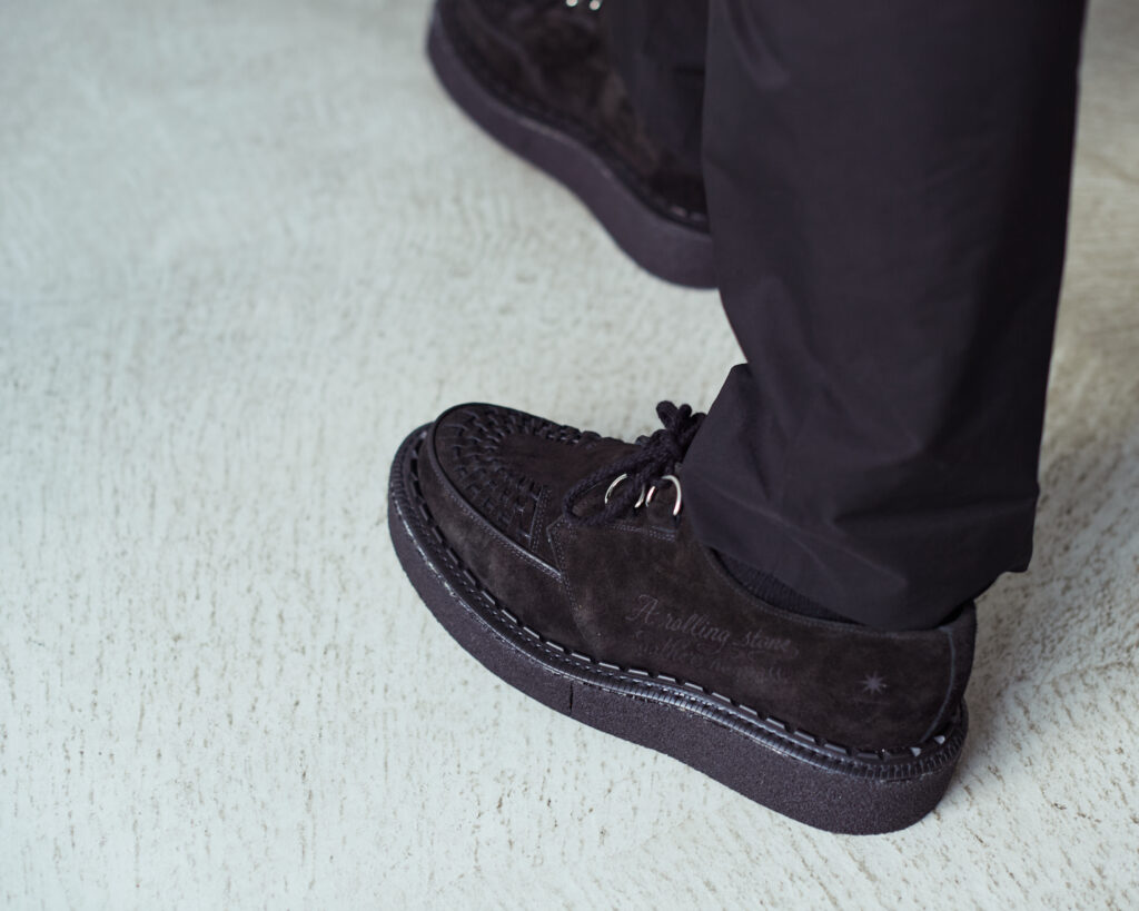 今回のコラボレーションでは、ジョージコックスのアイコニックな厚底クレープソールと D リング、アッパーの編み込 み仕様が特徴的なブランドを代表するモデル“3588 Gibson(ギブソン)”をベースに採用。カラーはレッド、ブラック、 レオパードの 3 色展開。シューレースとインターレースはあえて王道のブラックに統一。クラシックな佇まいの中に ロックの匂いが宿るバランスへと仕上げた。サイドには、GDC が掲げるメッセージ“A Rolling Stone Gathers No Moss(転石苔むさず)”、ホール部分には象徴的な 8 芒星 STA モチーフを配置。GDC が持つストリートマインドと、 GEORGE COX のパンクスピリットが交差する一足。