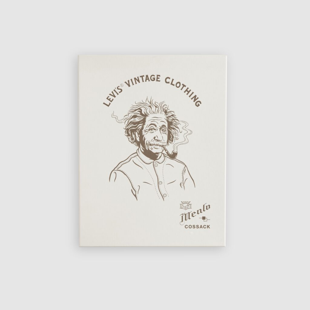 EinsteinはMenlo Cossackのジャケットのオリジナルを1935年ごろに手に入れた。ちょうどアメリカ国籍を申請しながら、アメリカ合衆国へ渡ったあとのことだ。ミニマリズムを貫く科学者の哲学に合致したこのジャケットは、長年にわたってEinsteinの定番アウターになった。Levi Strauss & Co.(リーバイ・ストラウス&カンパニー)は2016年7月13日、ロンドンのChristie’s(クリスティーズ)オークションハウスでEinsteinが着ていたオリジナルを落札。そのジャケットには、20世紀最大の物理学者による絶え間ない喫煙の習慣を示す、甘いパイプ煙草の香りがかすかに残っていたといわれている。いまオリジナルはサンフランシスコにあるLevi Strauss & Co.本社のVault Museum(ヴォルト・ミュージアム)で保存されている。