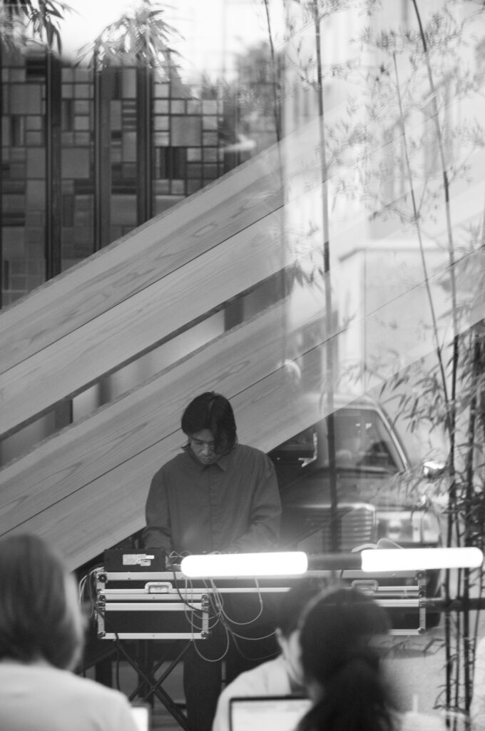 服のかすれる音、壁や床の響き、偶然に生まれるリズム――その場で拾い集めた音を即興で重ね、一曲の楽曲として紡ぎ上げるパフォーマンス。
