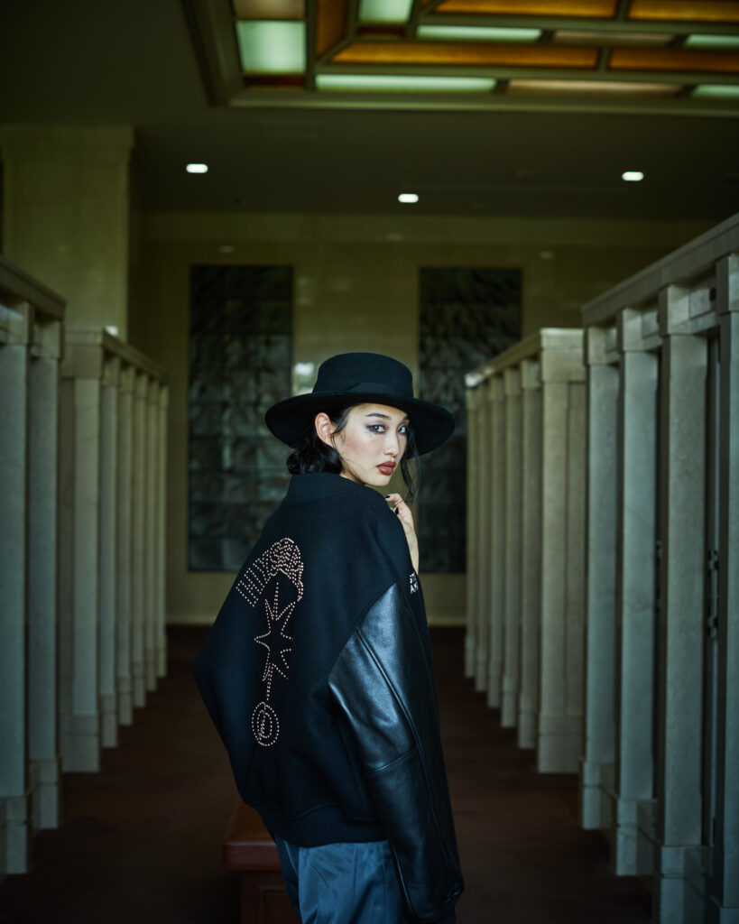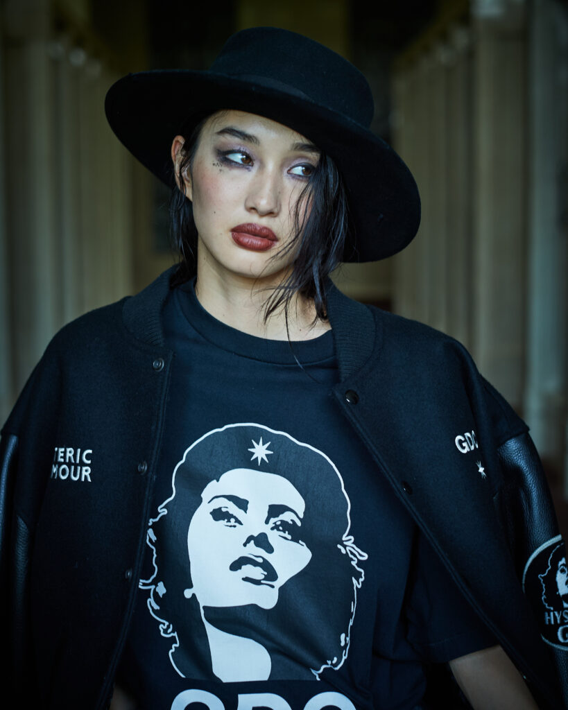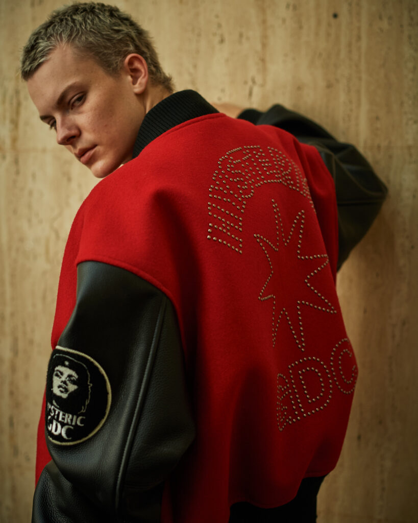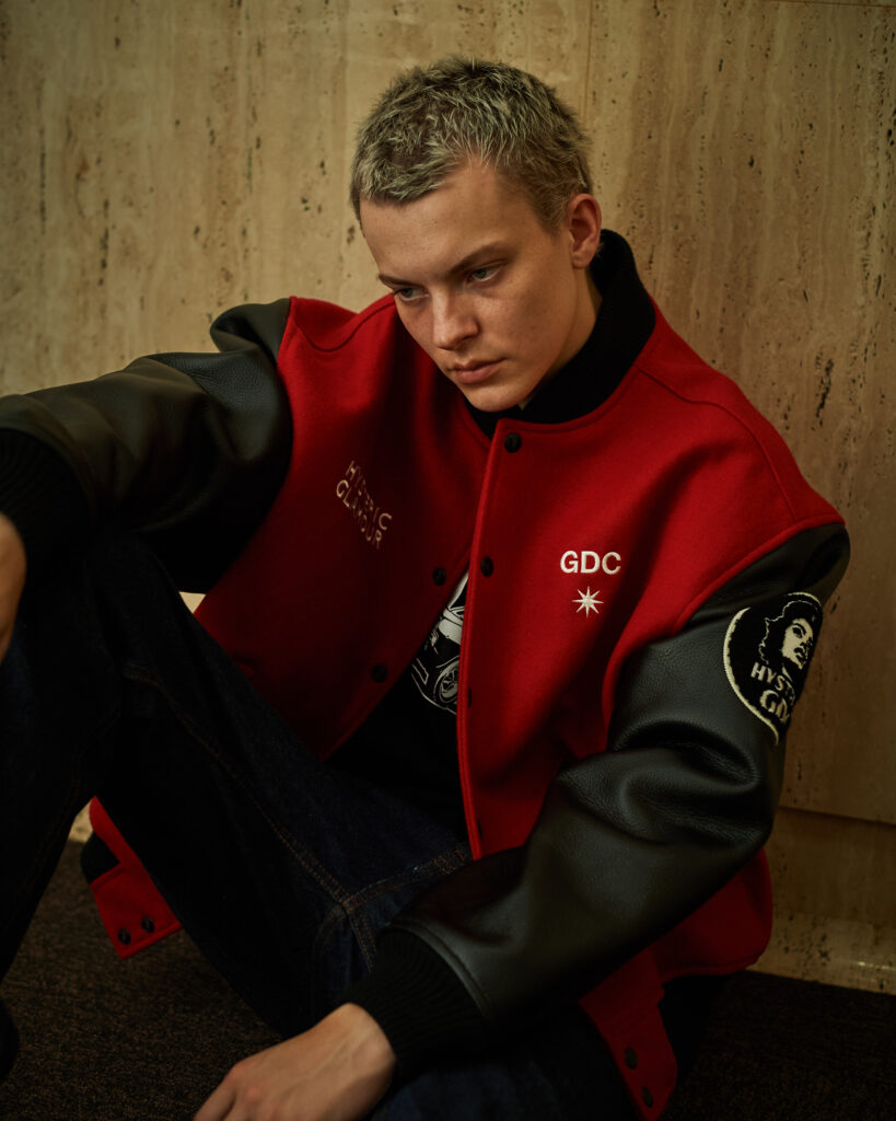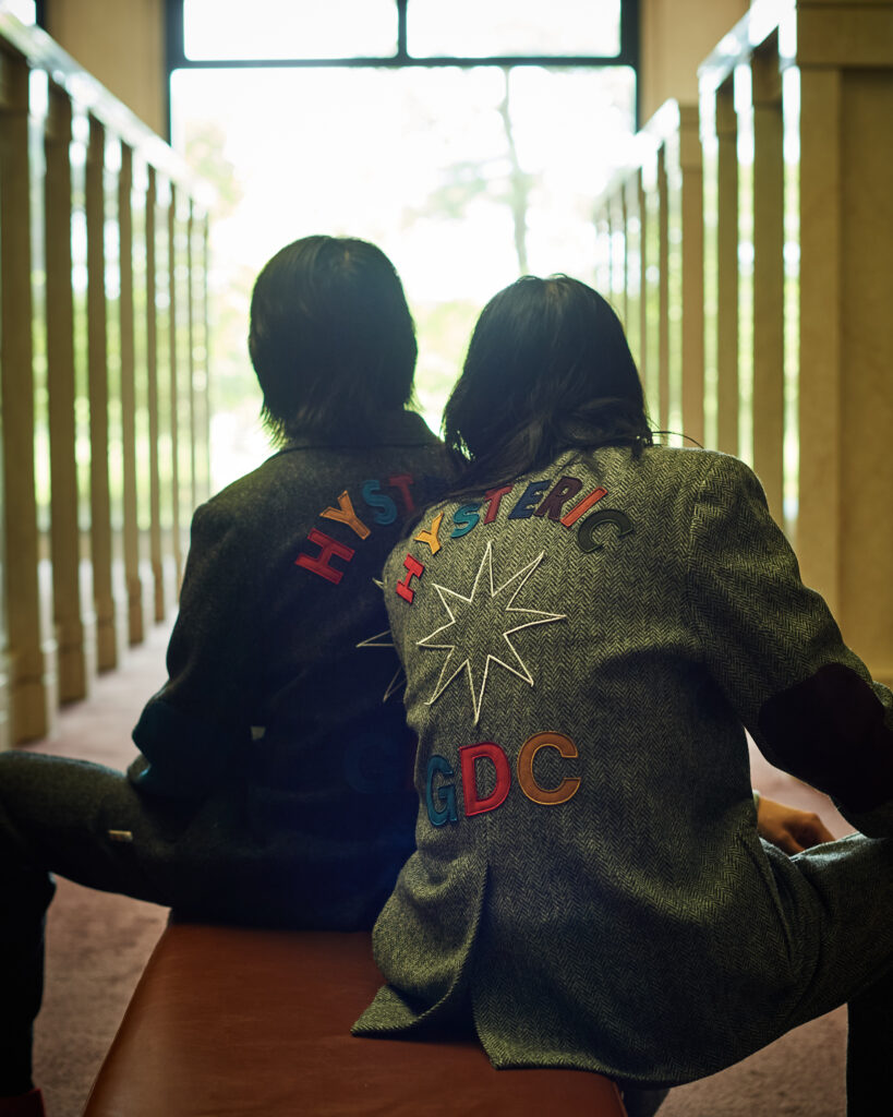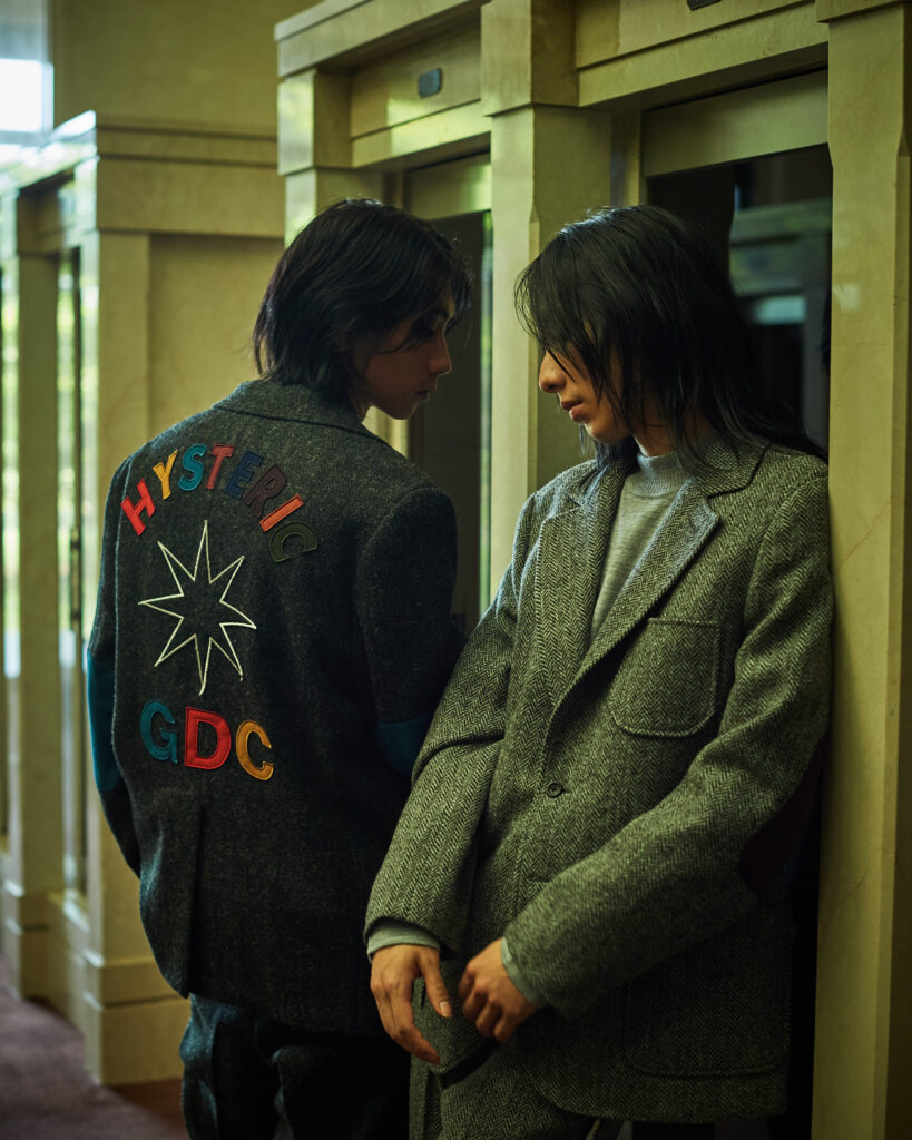 本コレクションでは、GDCの象徴である8芒星STAモチーフのベレー帽を被った女性像を中心に、今回のために制作されたグラフィックをキーとしたビジュアルで構成。 LOOK撮影およびスタイリングは熊谷隆志が担当し、アイテムセレクトも自らディレクション。「ロンドンの空気を纏いながらアメカジを着こなす、どこかグラムロックの匂いをまとった人物像」をイメージソースに構築し、プロダクトデザインはHYSTERIC GLAMOURが担当。両者のクリエイションの歴史が交錯するコラボレーションとなった。デニムやTシャツといったHYSTERIC GLAMOURの核となるアイテムに加え、M-65、スタジャン、ボアジャケット、サテンスラックスなど多彩なラインナップを展開。さらに、シルエットにこだわった受注販売のツイードジャケット・パンツを含む全 14型をリリース。