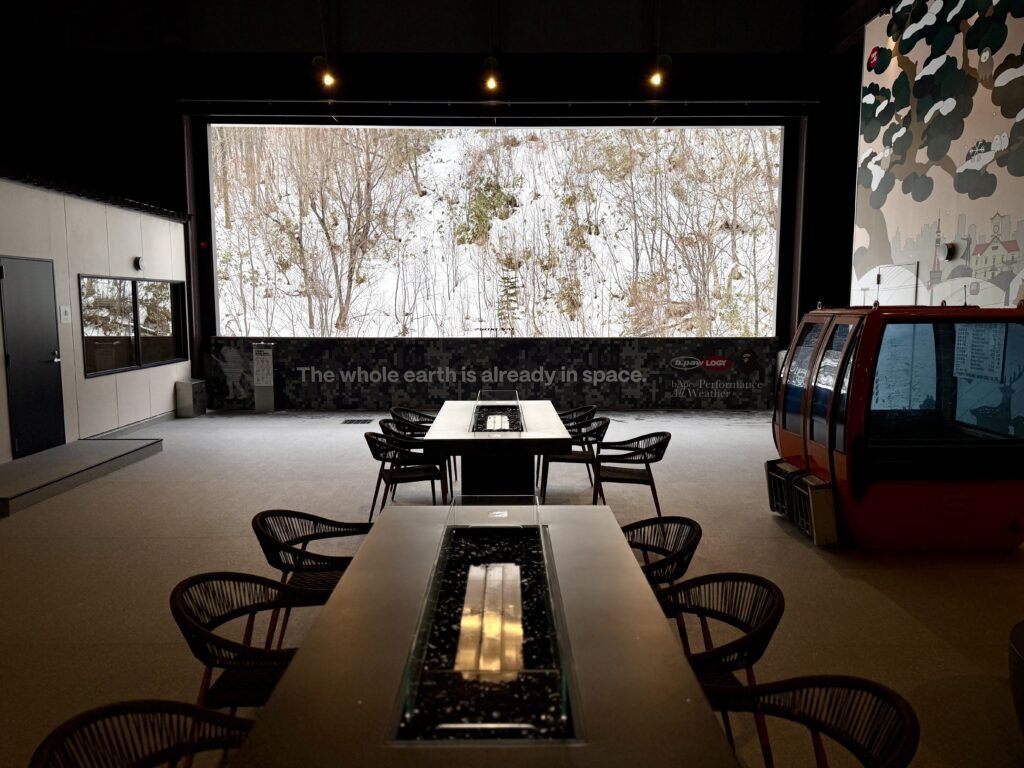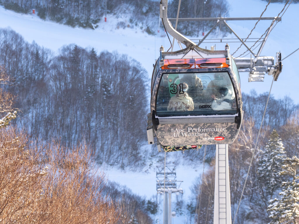 山麓から山頂へと向かうゴンドラには、今回のコレクションのビジュアルで全面ラッピングが施された特別仕様のキャビンが登場。UAP CAMOとBAPECAMOのパターンが客車を覆い、移動する展示として、また空中を行く体験型インスタレーションとして機能した。