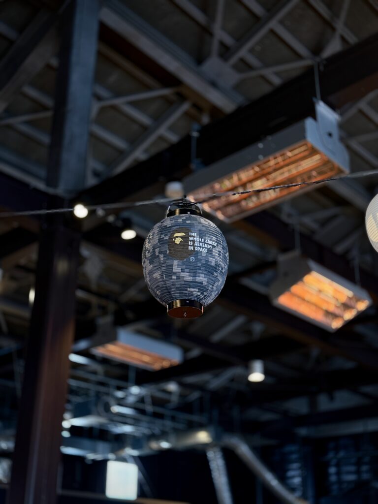 テラスには、フォトスポットとして巨大APEHEADバルーンが設置され、テラスの壁面には、UAP CAMOのパターンとともに、今回のコレクションのスローガン「THE WHOLE EARTH ISALREADY IN SPACE(地球全体がすでに宇宙にある)」が描かれ、雪景色をバックにブランドのアイコニックなシンボルが浮かび上がった。