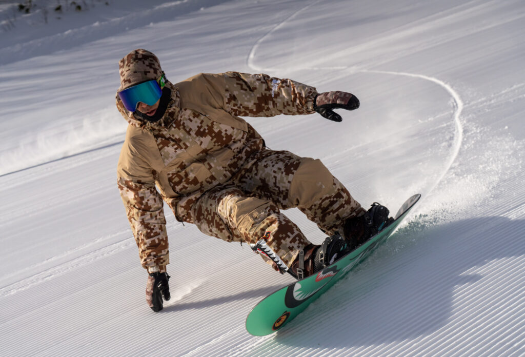 倉石氏の視点でデザインされたウェアやグラフィックを施したボードは、ゲレンデの白銀とコントラストを成し、ライダーたちの動きを視覚的にも際立たせた。このコレクションがファッションアイテムであると同時に、本格的なパフォーマンスギアであることを証明した。