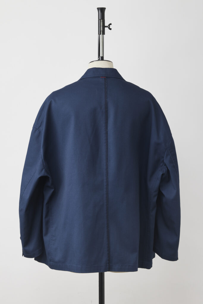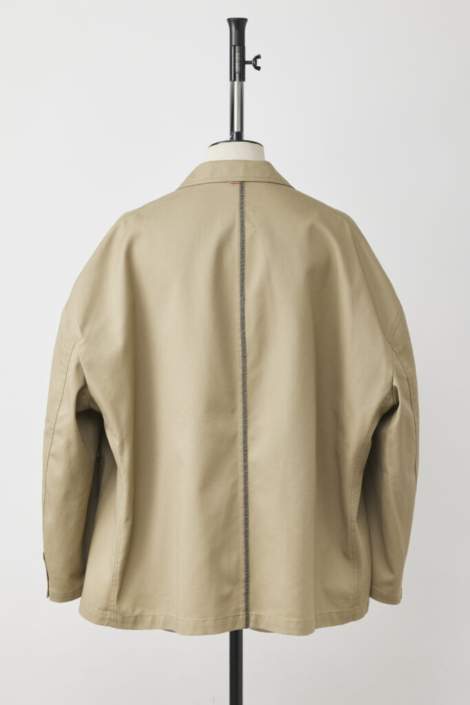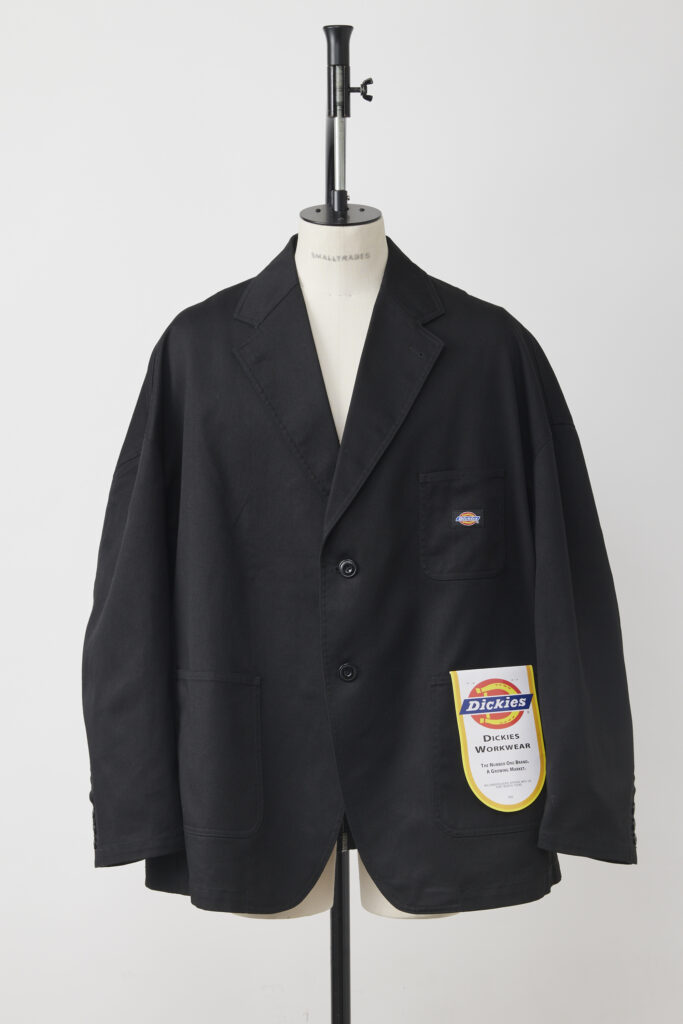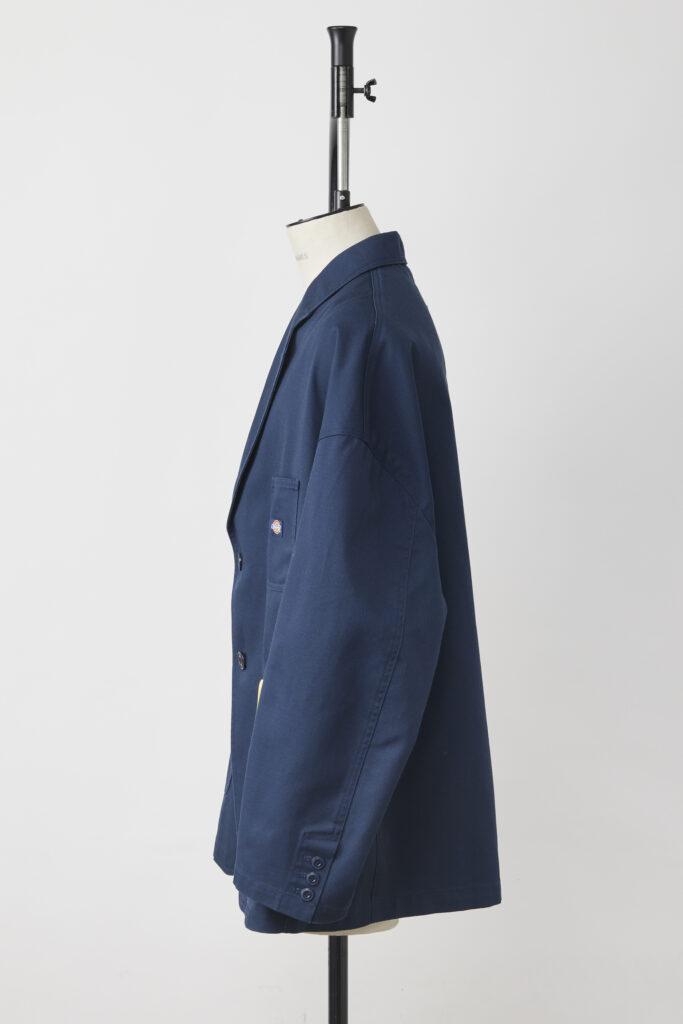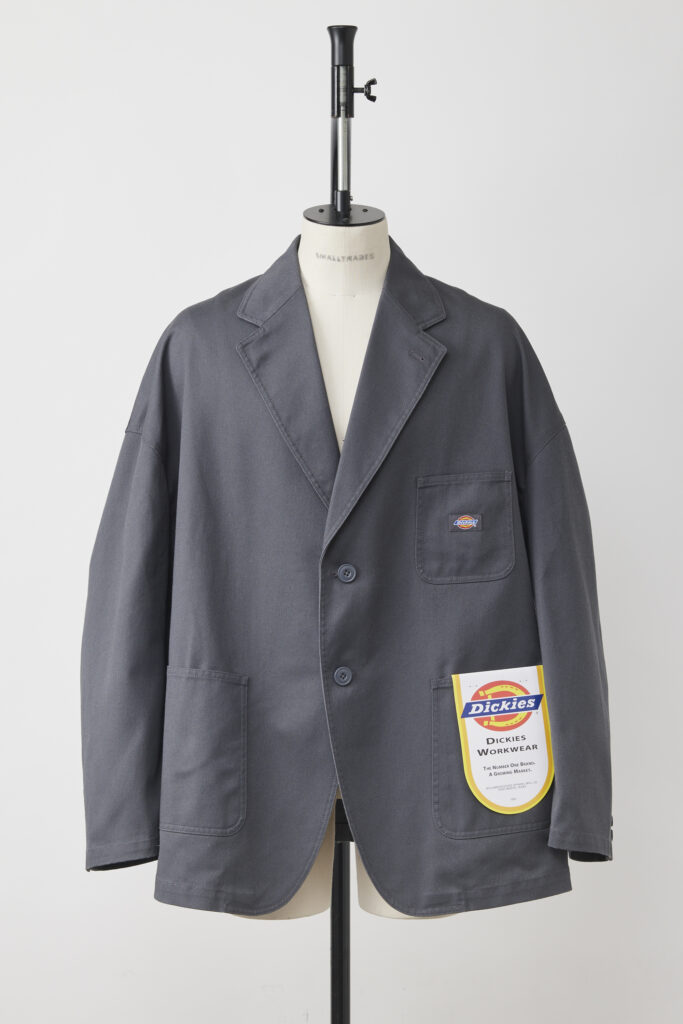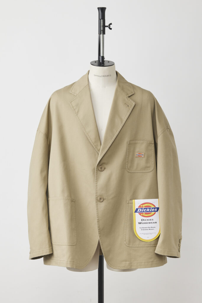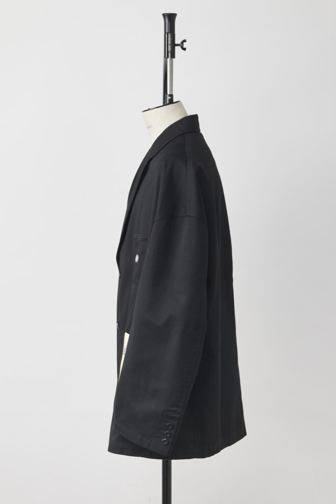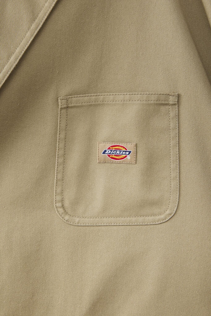 SHINYAKOZUKA の代表作〈HIS JK〉をベースに、Dickies®が⻑年採用してきた T/C ツイルを使用して一重仕立てのワークジャケットへと進化。肘下まで落ちるドロップショルダー、広く取られた余白、衿を立てても着られる独自構造など、原型が持つ完成度の高さはそのままに、素材が生む軽快さとタフさを纏った特別仕様。