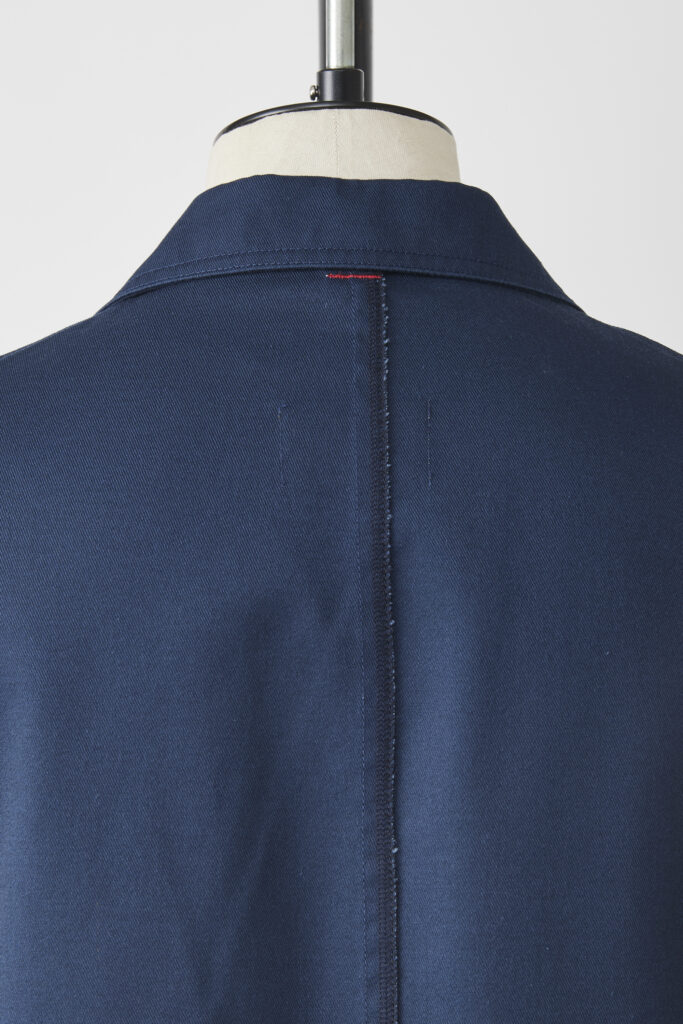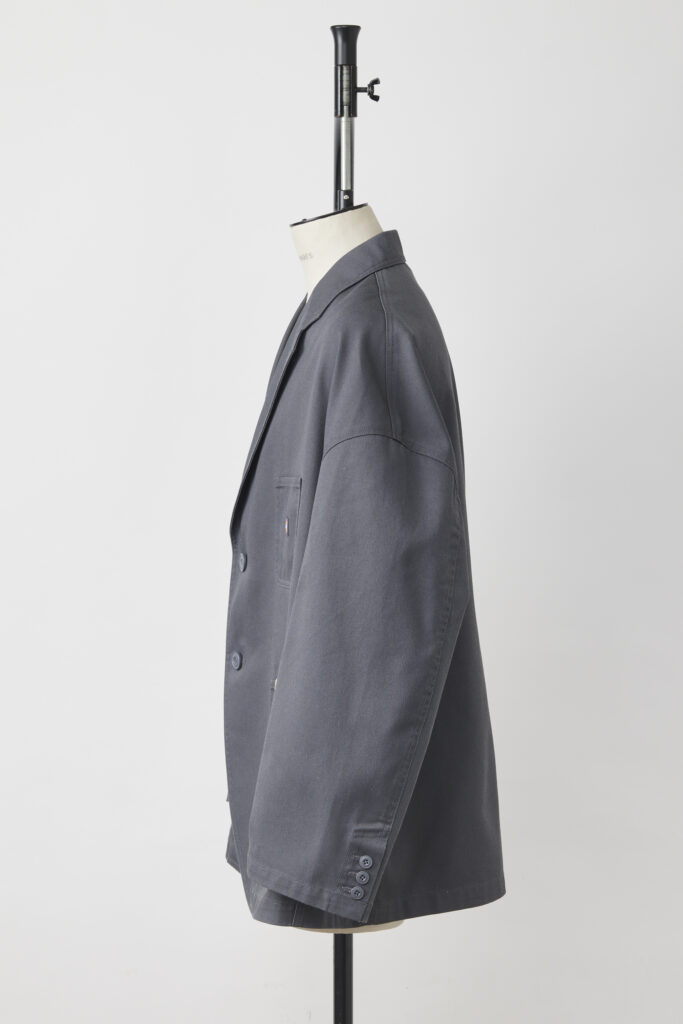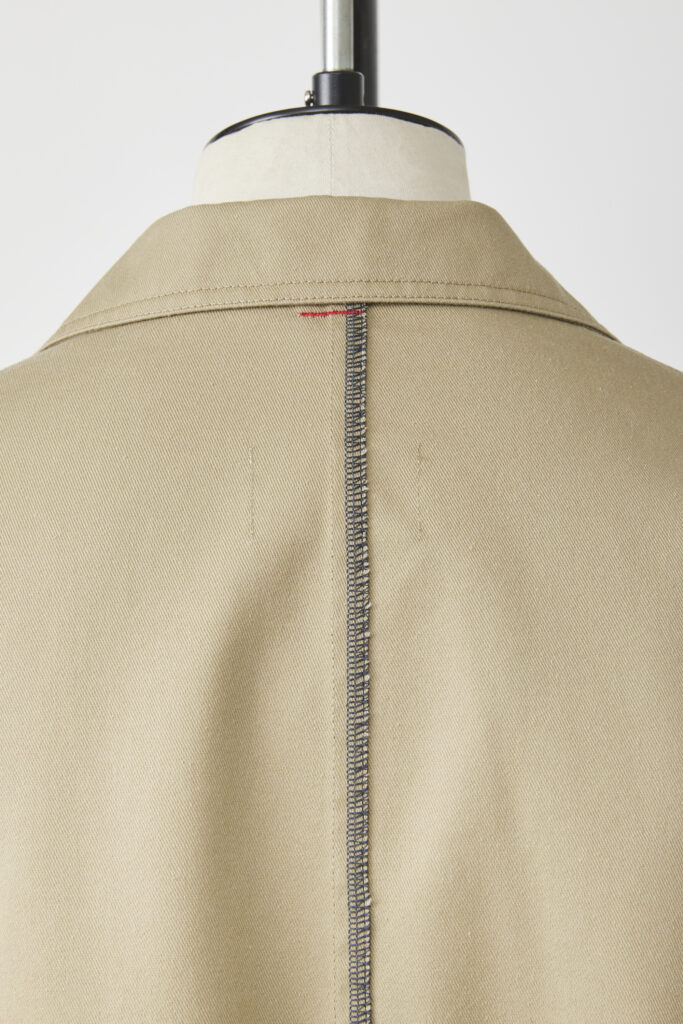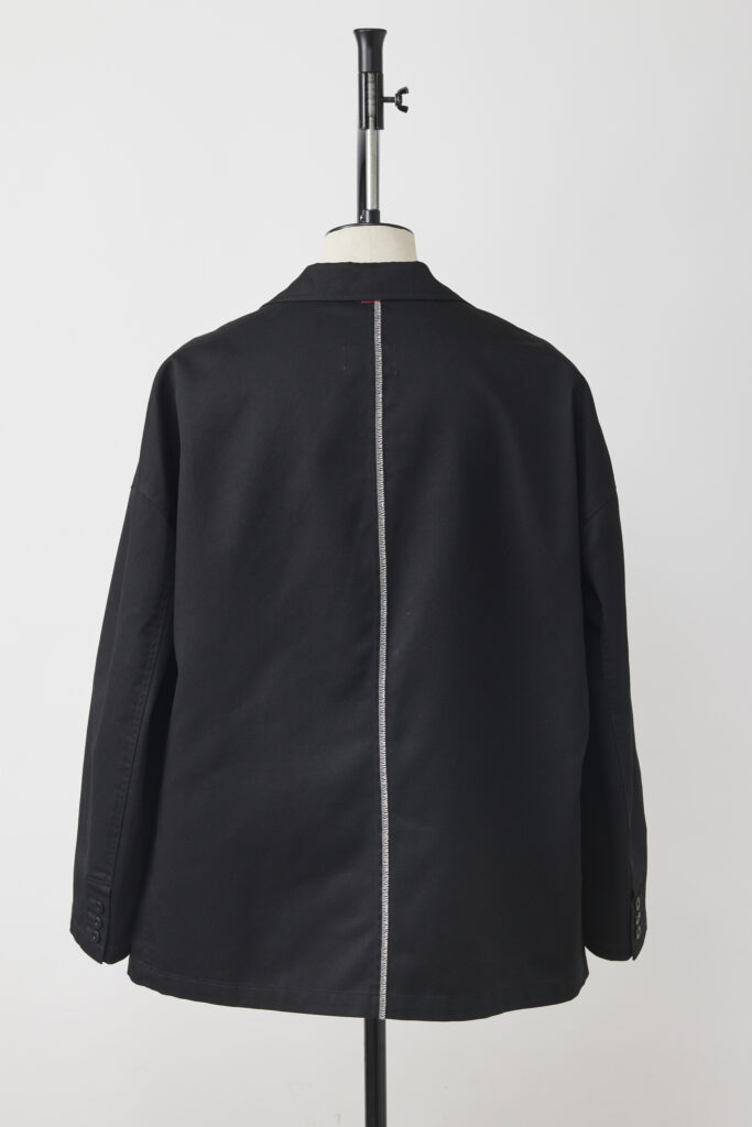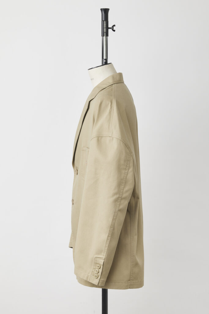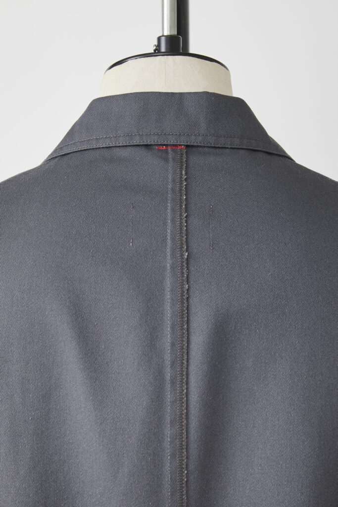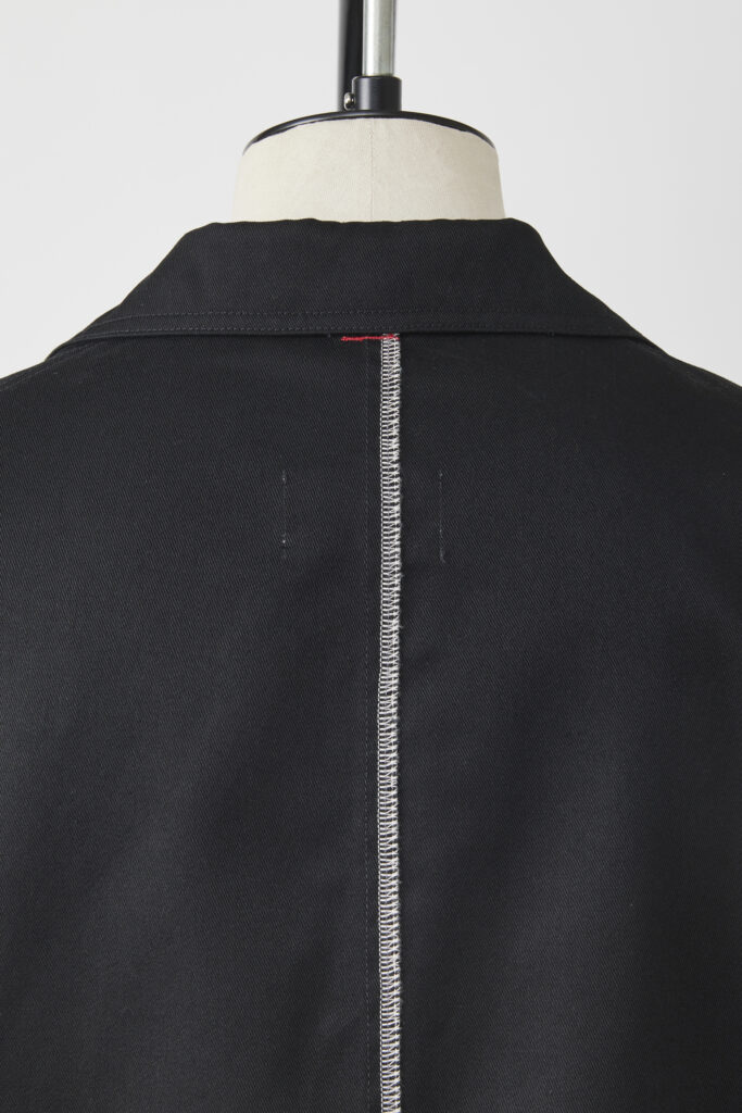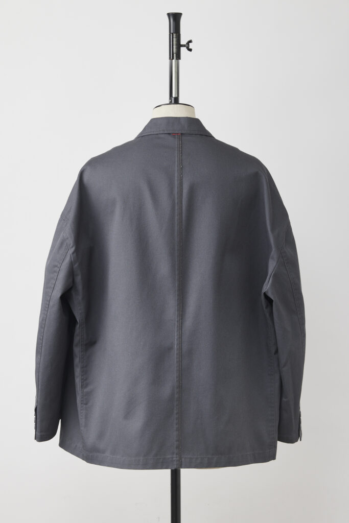 SHINYAKOZUKA の代表作〈HIS JK〉をベースに、Dickies®が⻑年採用してきた T/C ツイルを使用して一重仕立てのワークジャケットへと進化。肘下まで落ちるドロップショルダー、広く取られた余白、衿を立てても着られる独自構造など、原型が持つ完成度の高さはそのままに、素材が生む軽快さとタフさを纏った特別仕様。