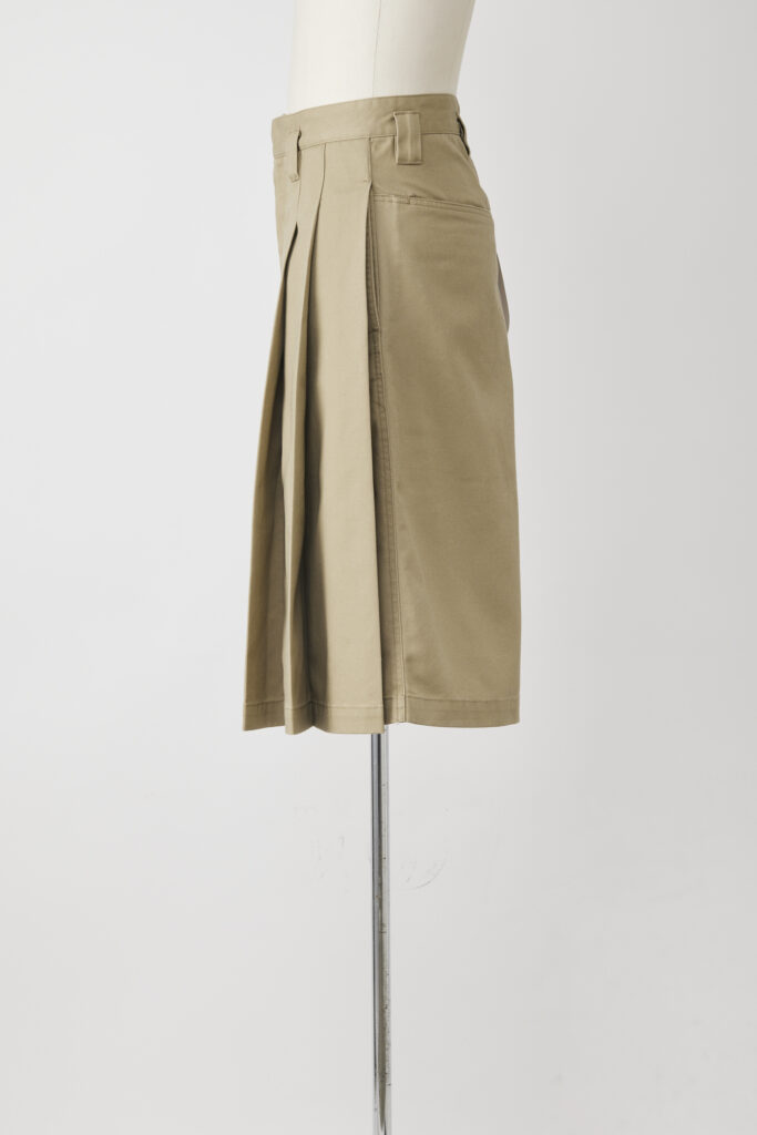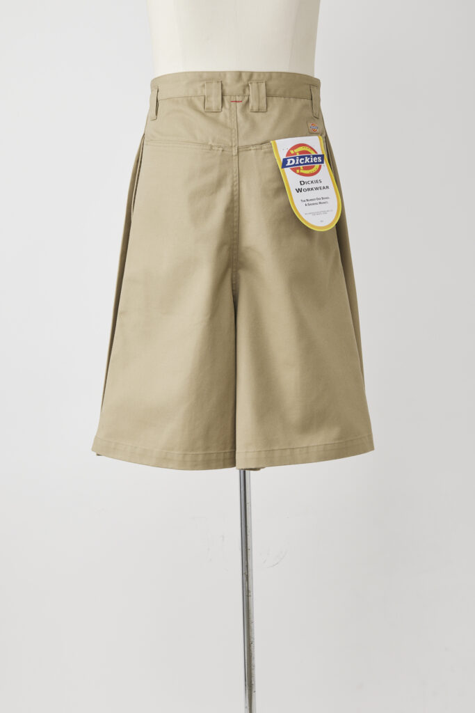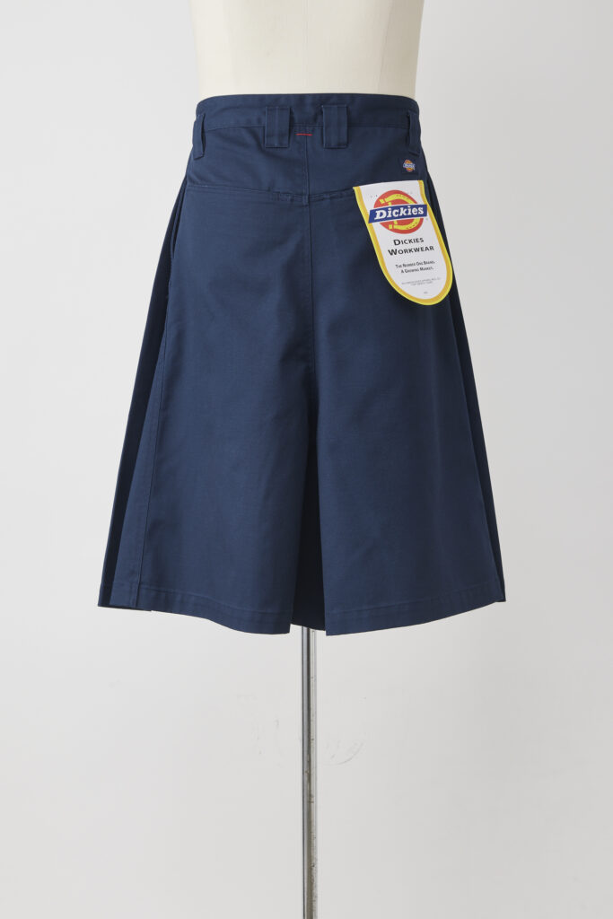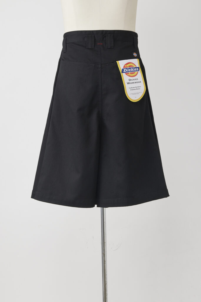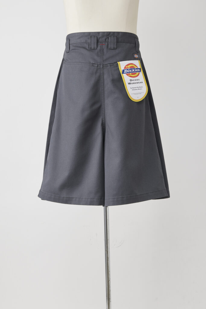 キルトスカートの構造を応用した 2 タッククロップドパンツ。前からはスカート、後ろからはパンツに見える“視点で表情が 変わる”デザインが特徴。Dickies®の T/C ツイルを採用することで、ユニフォーム同士の背景が有機的に融合し、 セットアップとしての完成度が際立つ一本。