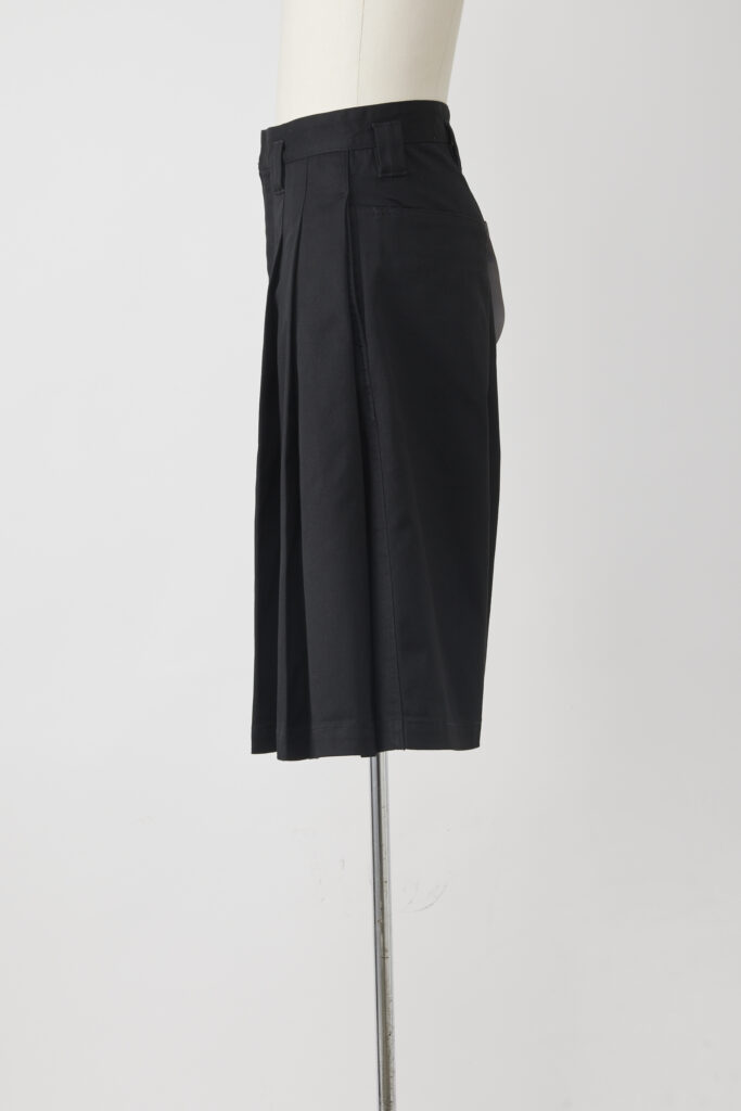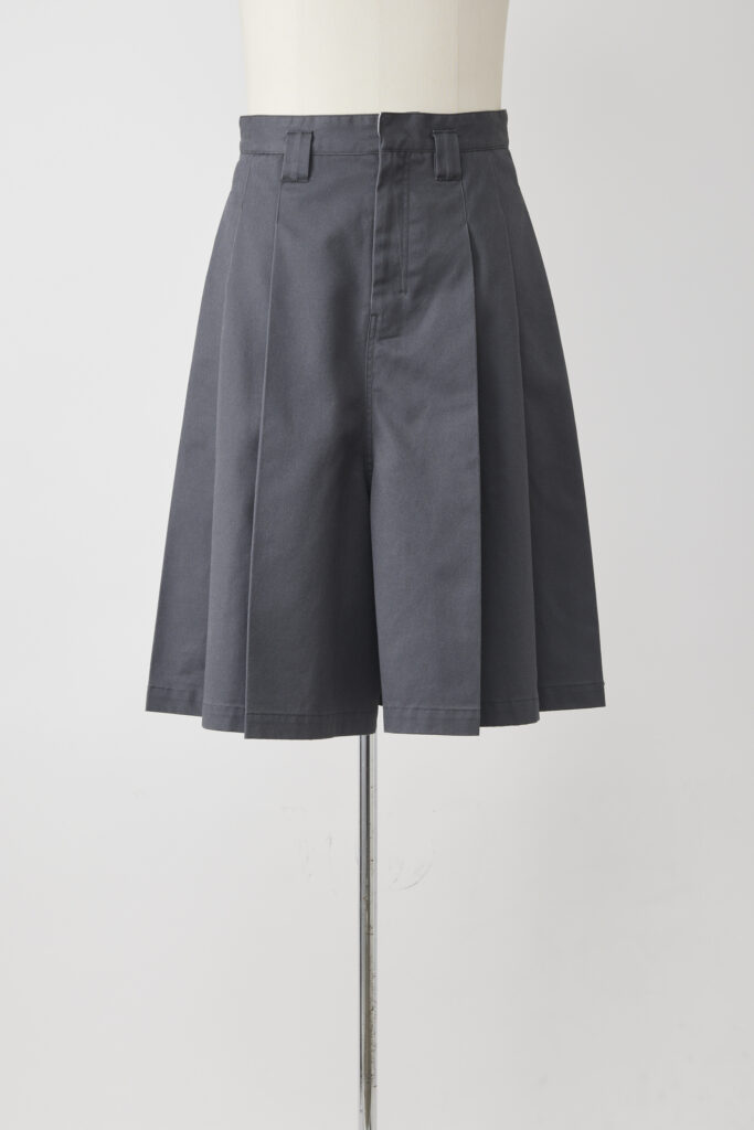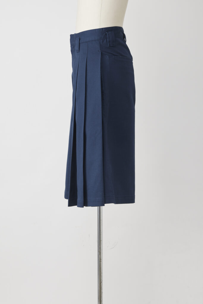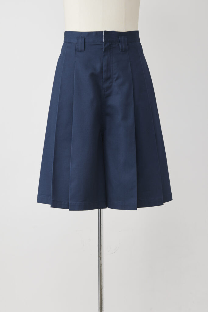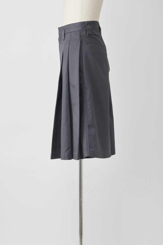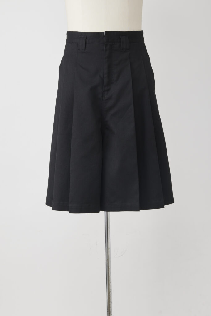 キルトスカートの構造を応用した 2 タッククロップドパンツ。前からはスカート、後ろからはパンツに見える“視点で表情が 変わる”デザインが特徴。Dickies®の T/C ツイルを採用することで、ユニフォーム同士の背景が有機的に融合し、 セットアップとしての完成度が際立つ一本。
