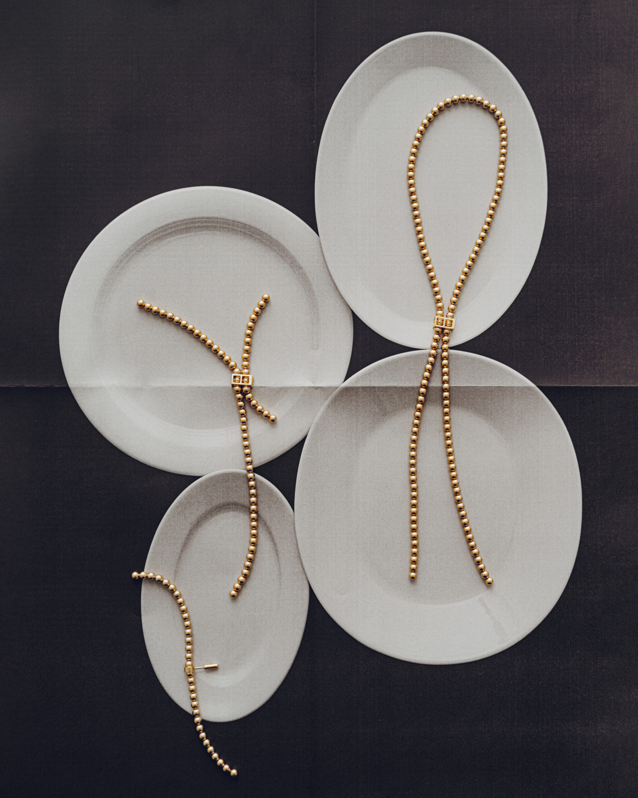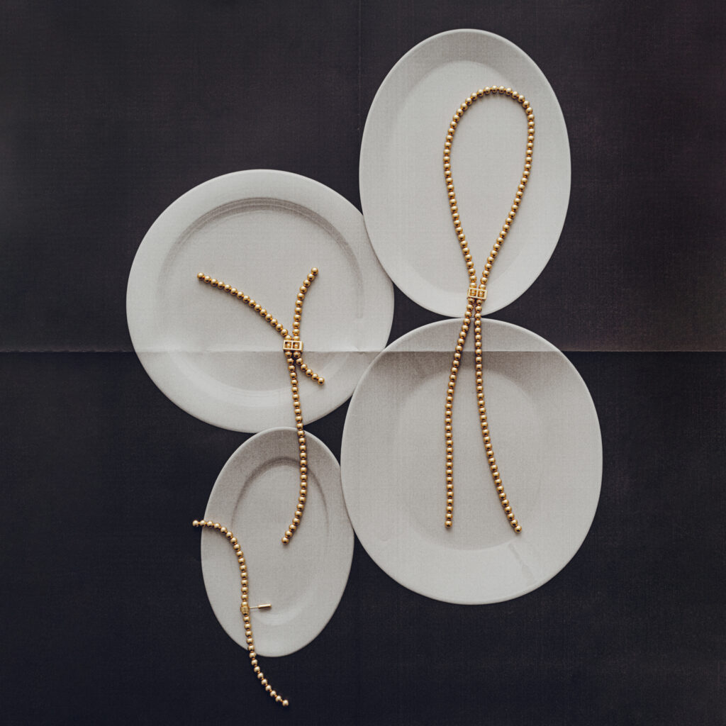 本作は、直径4mmのボールを連ねたチェーンに、留め具の位置をつけ替えることで、多様なシルエットを作り出すデザインが特徴。