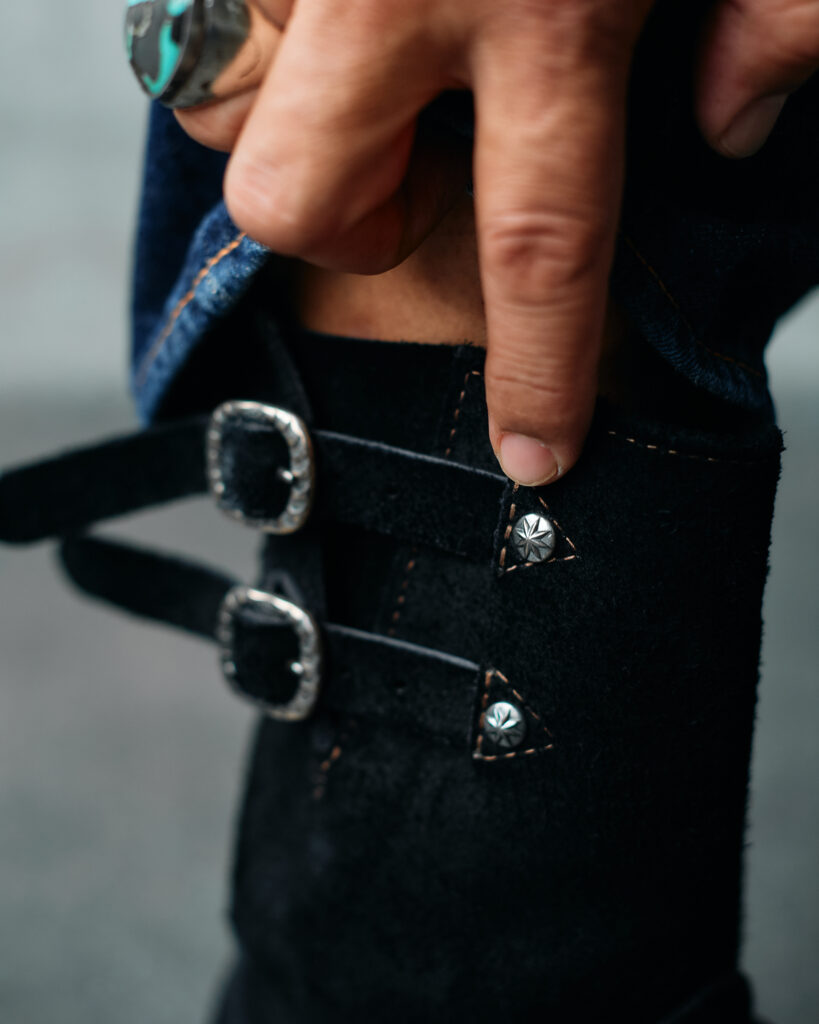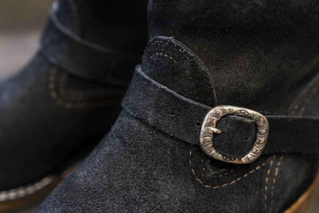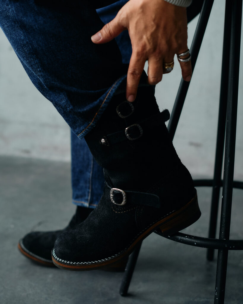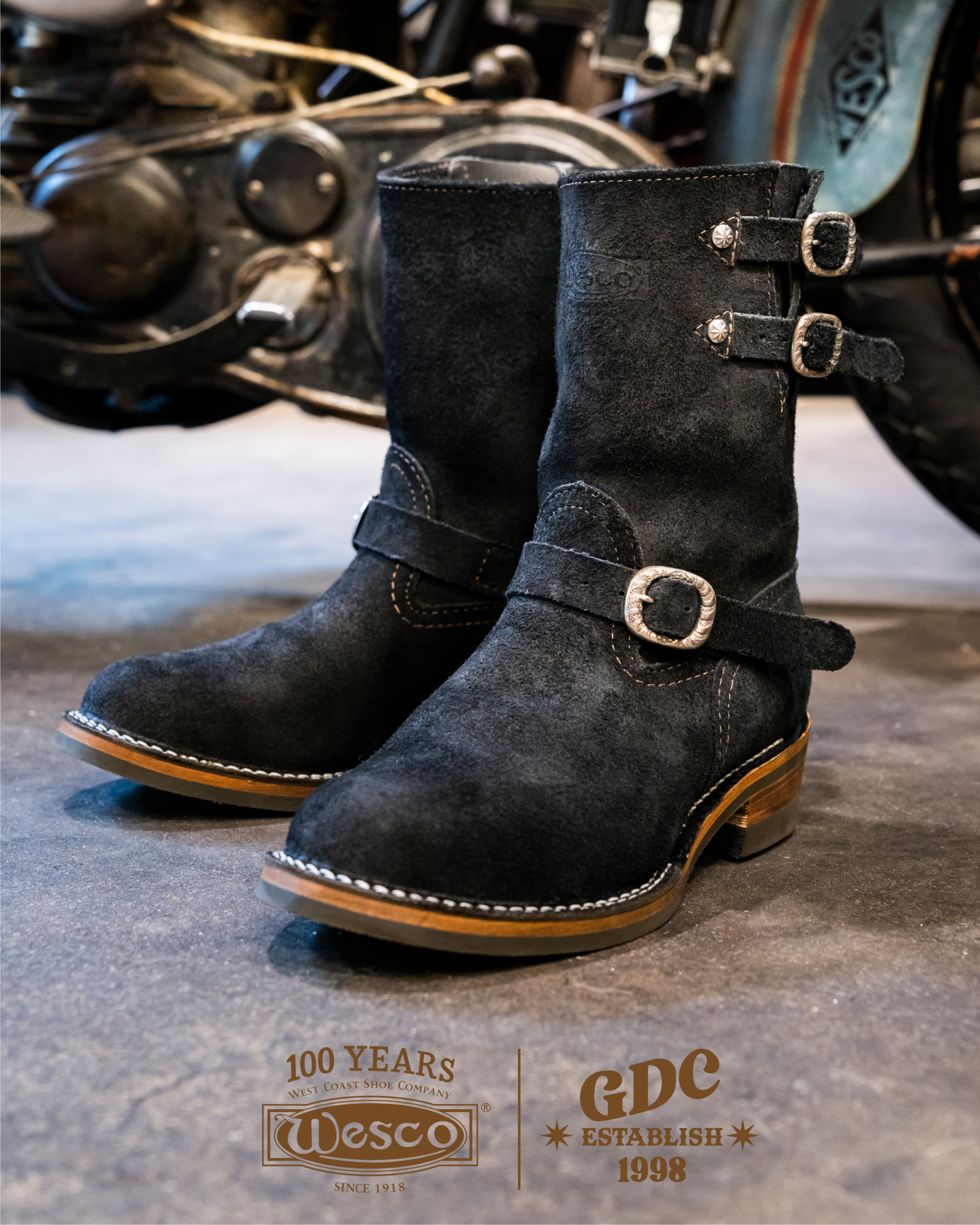 本コラボレーションは、WESCO JAPAN代表・岡本直氏と、GDCディレクター・熊谷隆志が直 接対話を重ねる中で、互いの感性が共鳴し実現した。本作は、GDCの再始動を象徴する ニューコレクションの中でも、とりわけ存在感を放つ一足。WESCOの定番エンジニアブーツ 「BOSS」をベースに、互いへの深いリスペクトがあってこそ具現化した、WESCO史においても稀有なエクスクルーシブモデルだ。 デザイン面では、熊谷隆志が長年傾倒してきたヴィンテージナバホジュエリーから着想を得た Silver 925製バックルを採用。ハンドメイド感のある表情が、ブーツ全体に奥行きを与えている。さらに、GDCの象徴である8芒星STAモチーフのSilver 925製スタッズをベルト部分に打ち込み、コラボレーションならではの存在感を演出。ベルトは上部2インチ、下部1インチと長め に設定され、スタイリングの幅を広げている。アッパーには、足馴染みがよく、履き込むほど に表情を増していくブラックオイルドラフアウトレザーを採用。力強さを感じさせながらも上質な佇まいを備えた素材選びは、WESCOならではのクラフツマンシップを体現している。堅牢な作りはそのままに、削ぎ落とされたフォルムと快適さを損なわないフィッティングを重ね、力強さと美しさを兼ね備えた仕上がりが特徴。ラストには、ヒール高がやや高めで自然な傾 斜が美しいフォルムを生む「9165」を採用。安定感のある履き心地と快適性を両立している。アウトソールには〈Vibram #430〉を装備し、武骨な表情を備えながらも、街履きにも適した高い安定感と歩きやすさを実現した。 熊谷自身のライフスタイルに根ざしたファッション性と、WESCOが誇る伝統的なブーツメイキングが交錯することで生まれた本作。