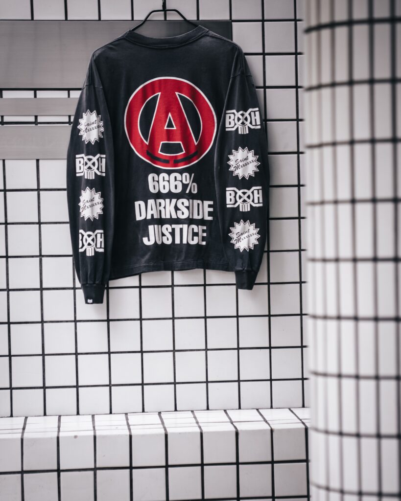 ©SAINT Mxxxxxxのデザイナー両名とも親交のある Coco Star Sims とのコラボレーションでは、本作のために描き下ろされた彼女の独創的かつエッジの効いたアートワークと、©SAINT Mxxxxxx が追求し続けるヴィンテージ加工を融合。