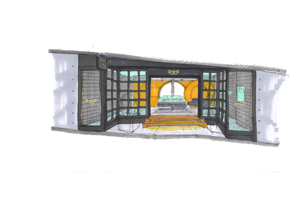 ブラックを基調とした店内は、ブランドを象徴する巨⼤なアンカーチェーンから吊るされた特注ケースをはじめ、ブラックウッドパネルや真鍮のディテールなど、LA の旗艦店にも通じるマテリアルを採⽤。